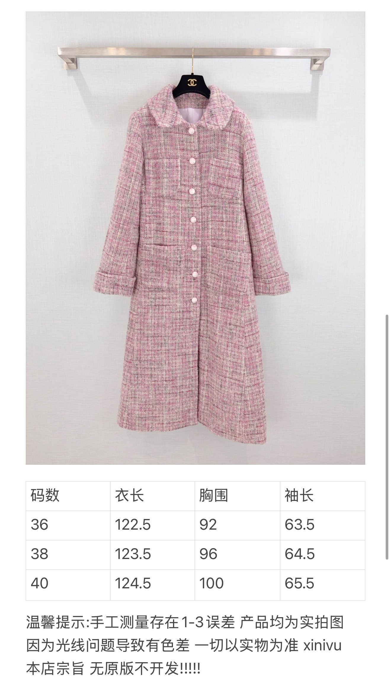 这款衣服是AAAAA 1:1 质量 (非常棒). 使用了和原版一模一样的材料. 商标部分也保持了和香奈儿/Chanel一样. 图片拍摄是实物衣服拍摄, 您所收到的实物保证和我们图片一模一样.