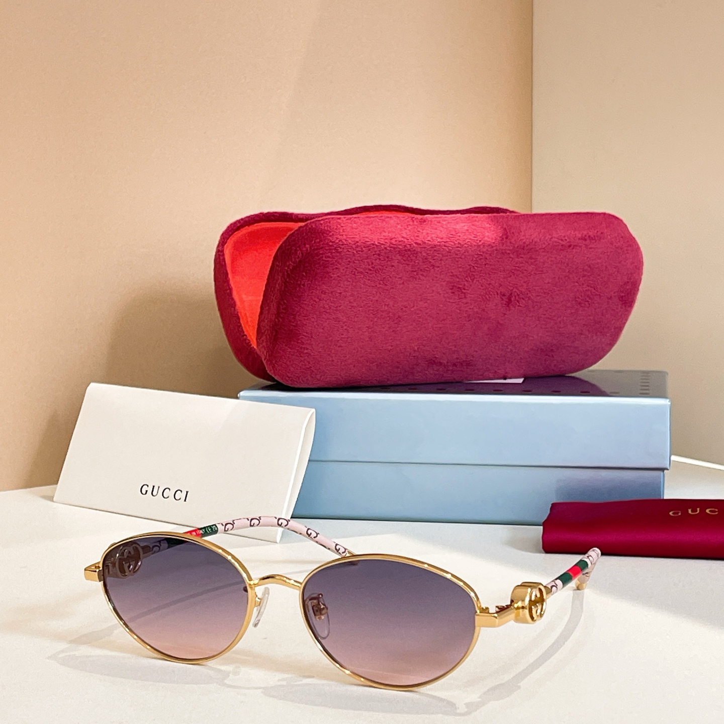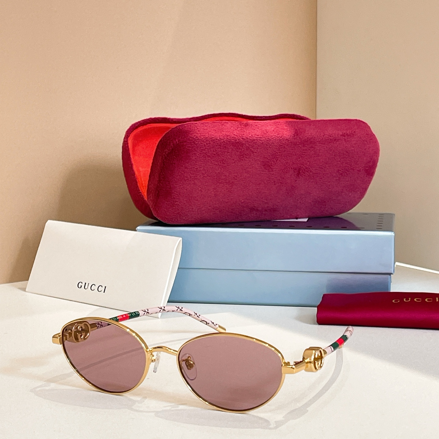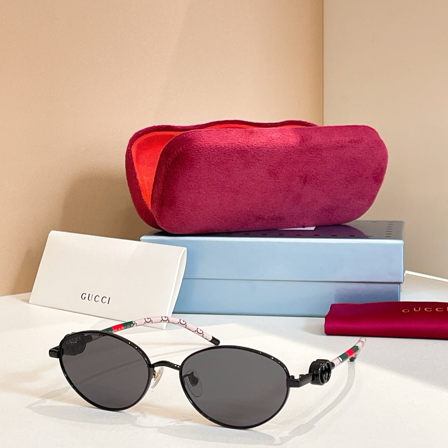 这款太阳眼镜是AAAAA 1:1 质量 (非常棒). 使用了和原版一模一样的材料. 商标部分也保持了和古奇/Gucci一样. 图片拍摄是实物太阳眼镜拍摄, 您所收到的实物保证和我们图片一模一样.