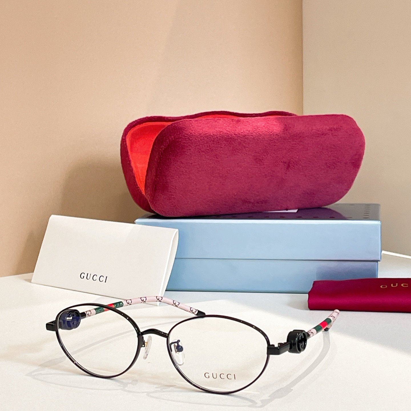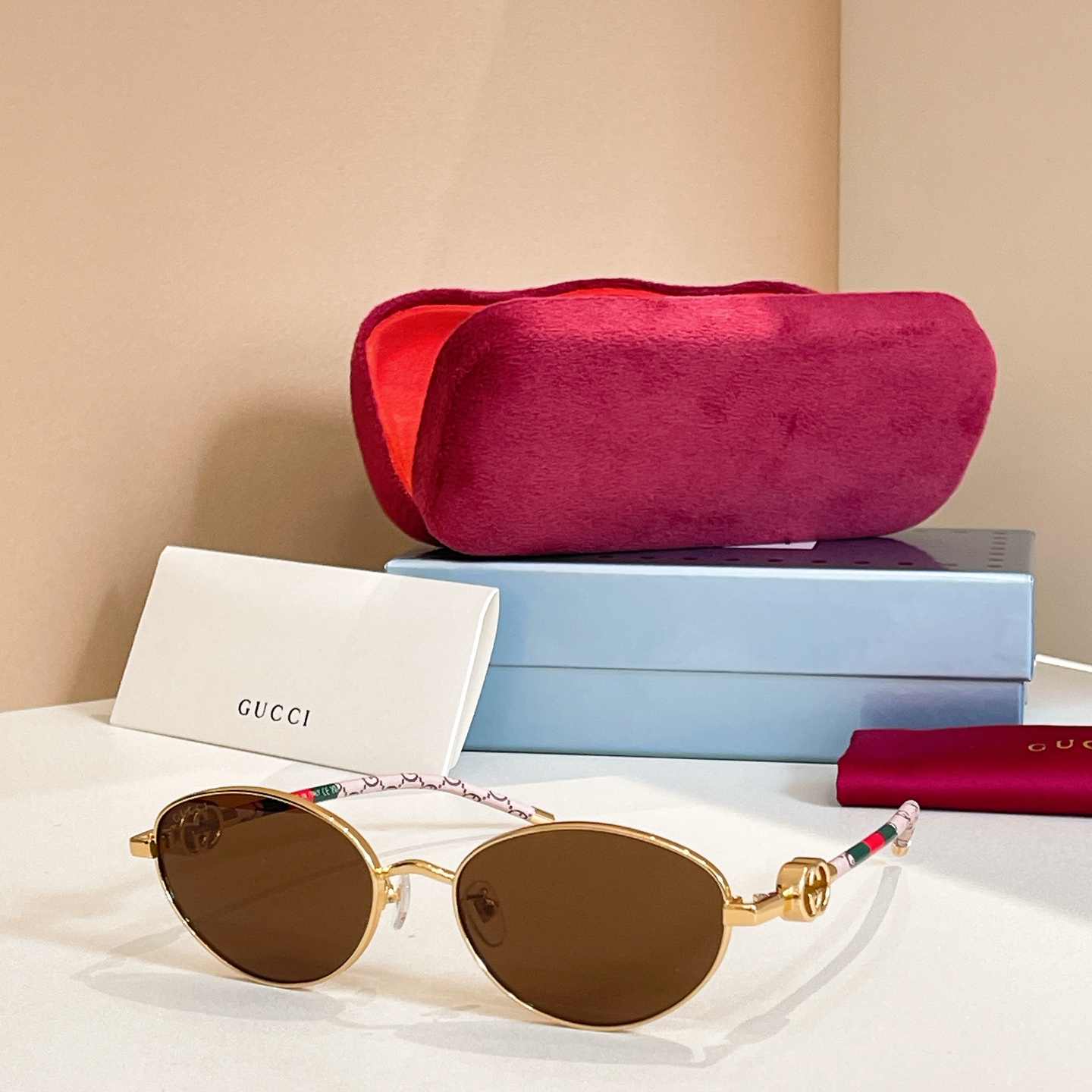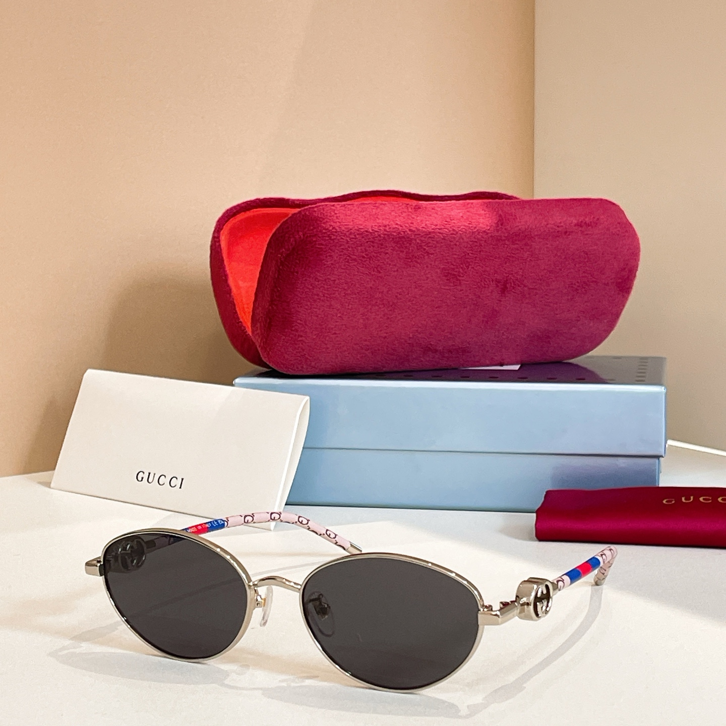 这款太阳眼镜是AAAAA 1:1 质量 (非常棒). 使用了和原版一模一样的材料. 商标部分也保持了和古奇/Gucci一样. 图片拍摄是实物太阳眼镜拍摄, 您所收到的实物保证和我们图片一模一样.