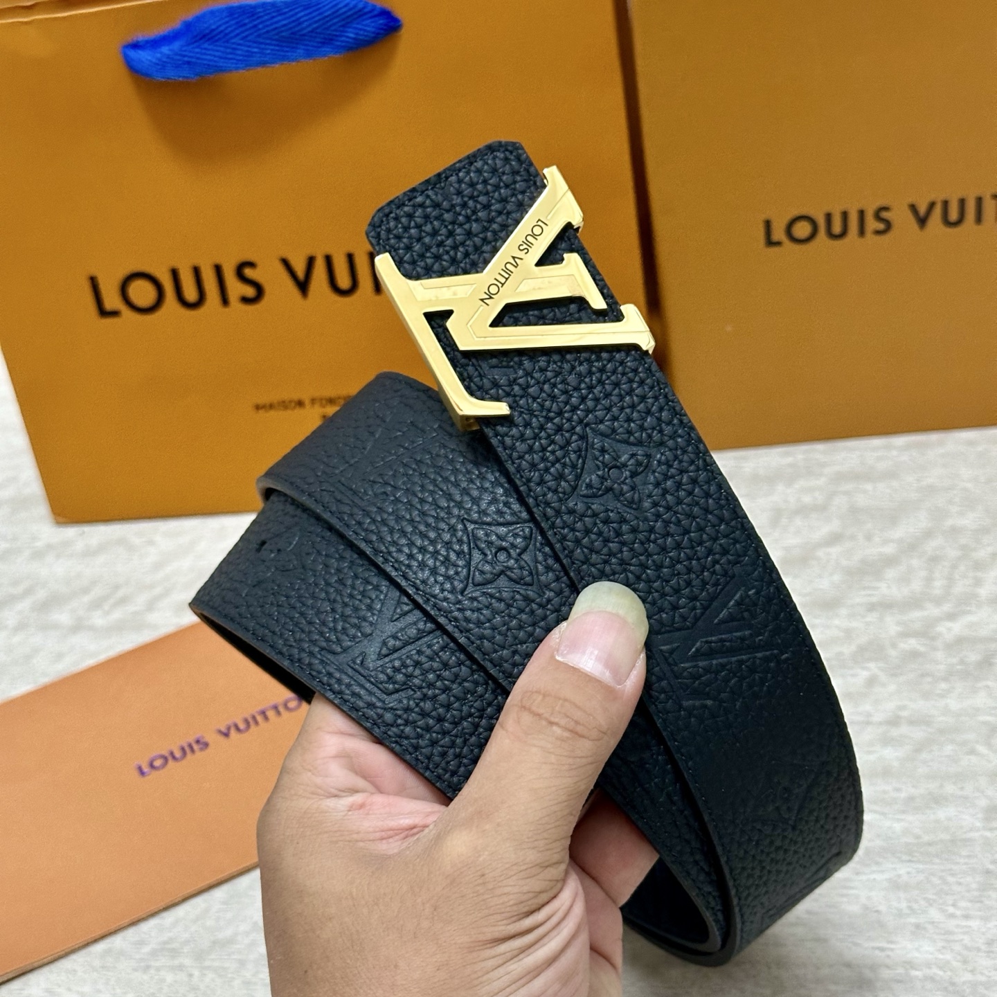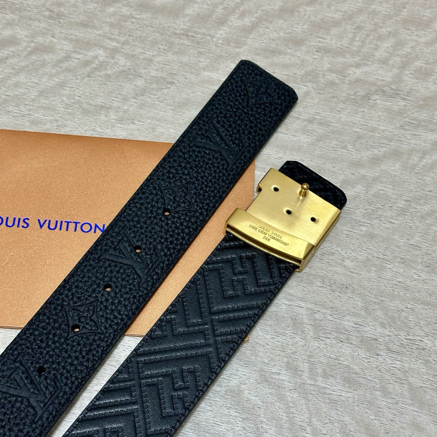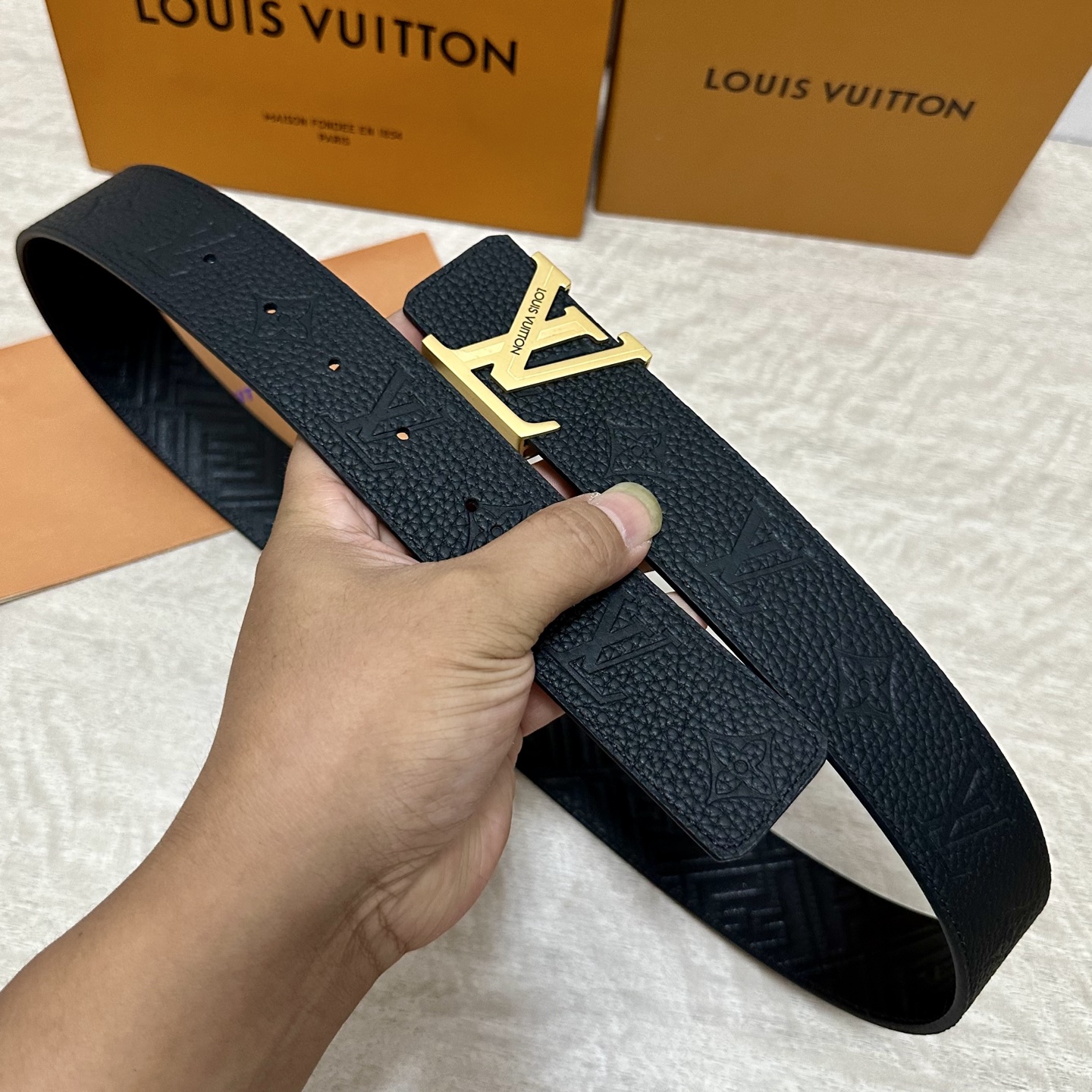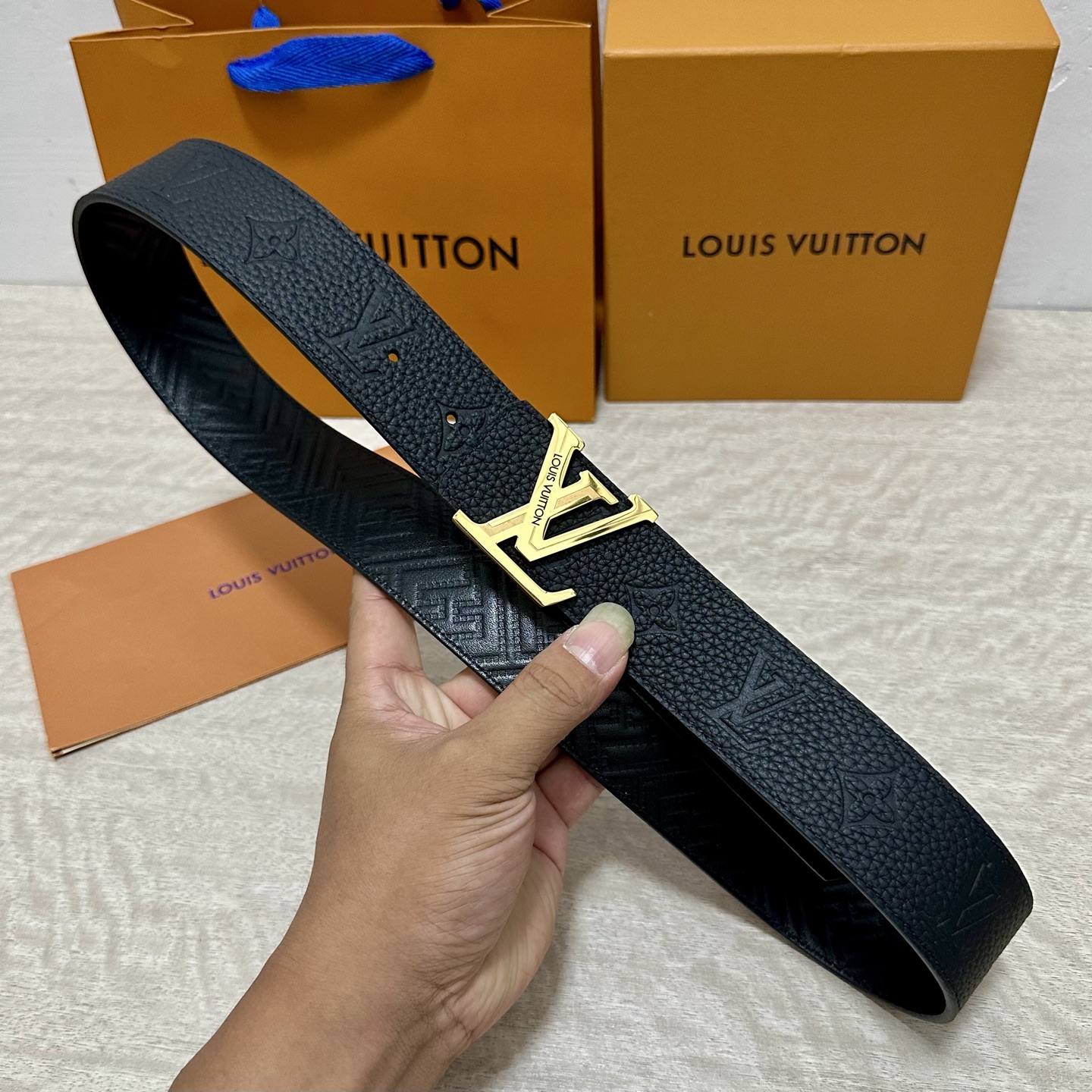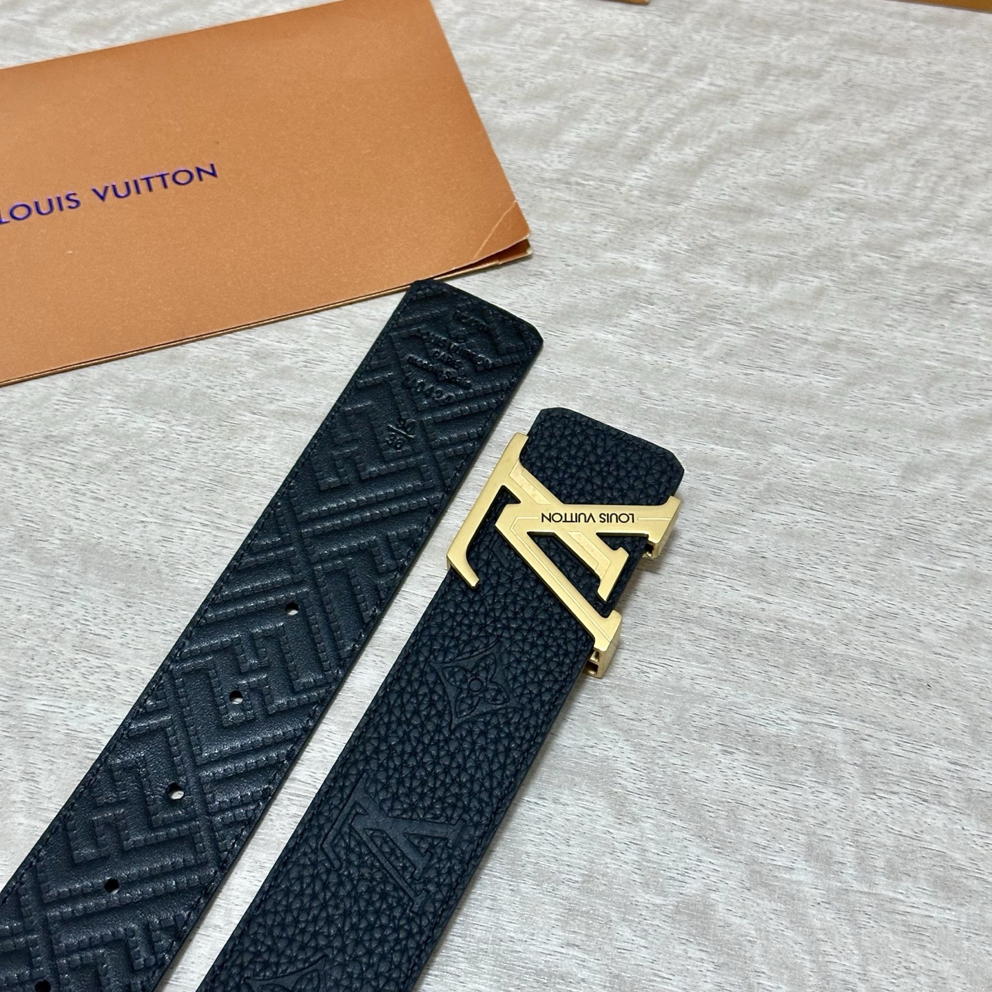 这款皮带是AAAAA 1:1 质量 (非常棒). 使用了和原版一模一样的材料. 商标部分也保持了和路易威登/Louis Vuitton一样. 图片拍摄是实物皮带拍摄, 您所收到的实物保证和我们图片一模一样.