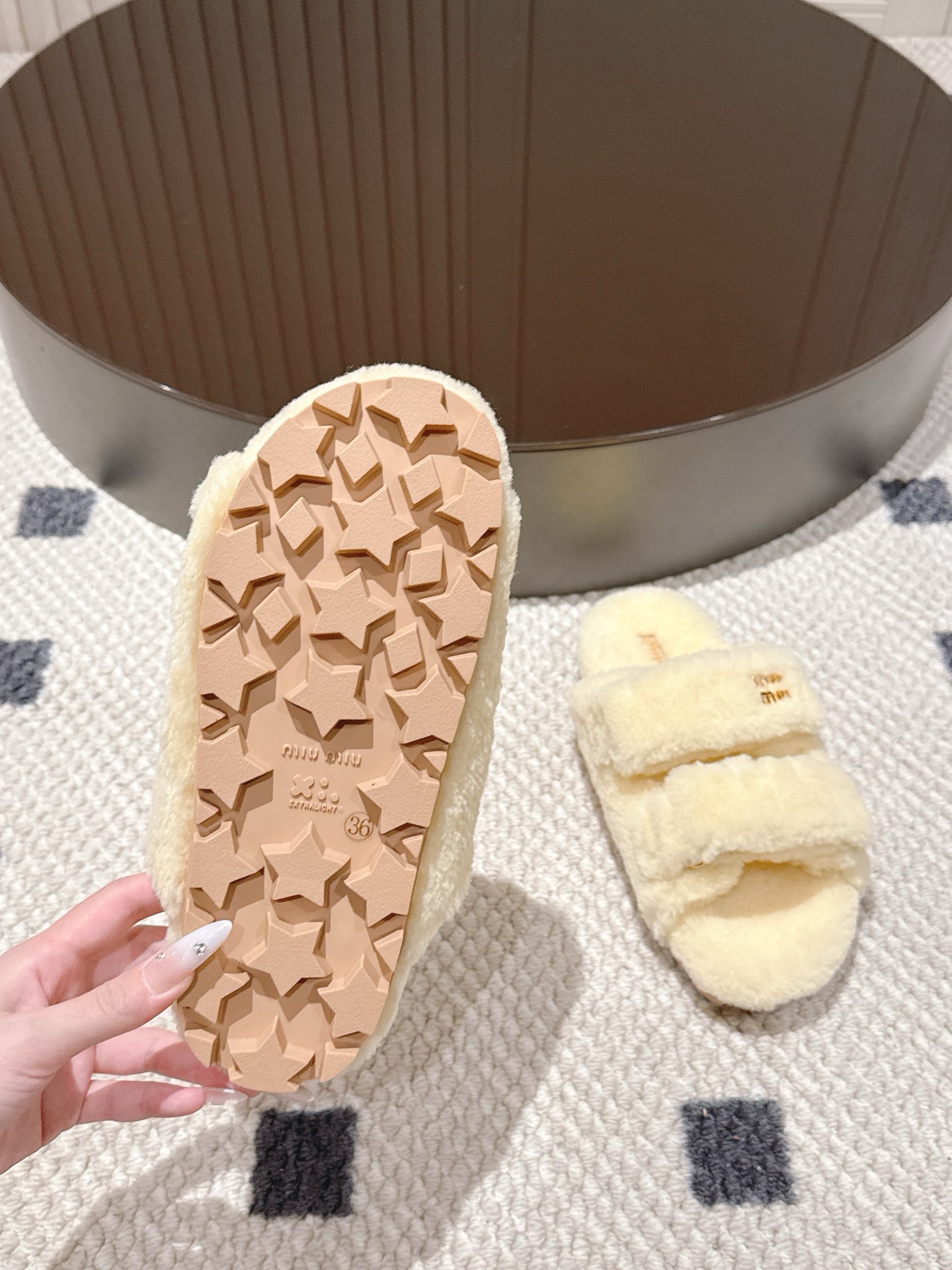 这款鞋子是AAAAA 1:1 质量 (非常棒). 使用了和原版一模一样的材料. 商标部分也保持了和缪缪/Miu Miu一样. 图片拍摄是实物鞋子拍摄, 您所收到的实物保证和我们图片一模一样.