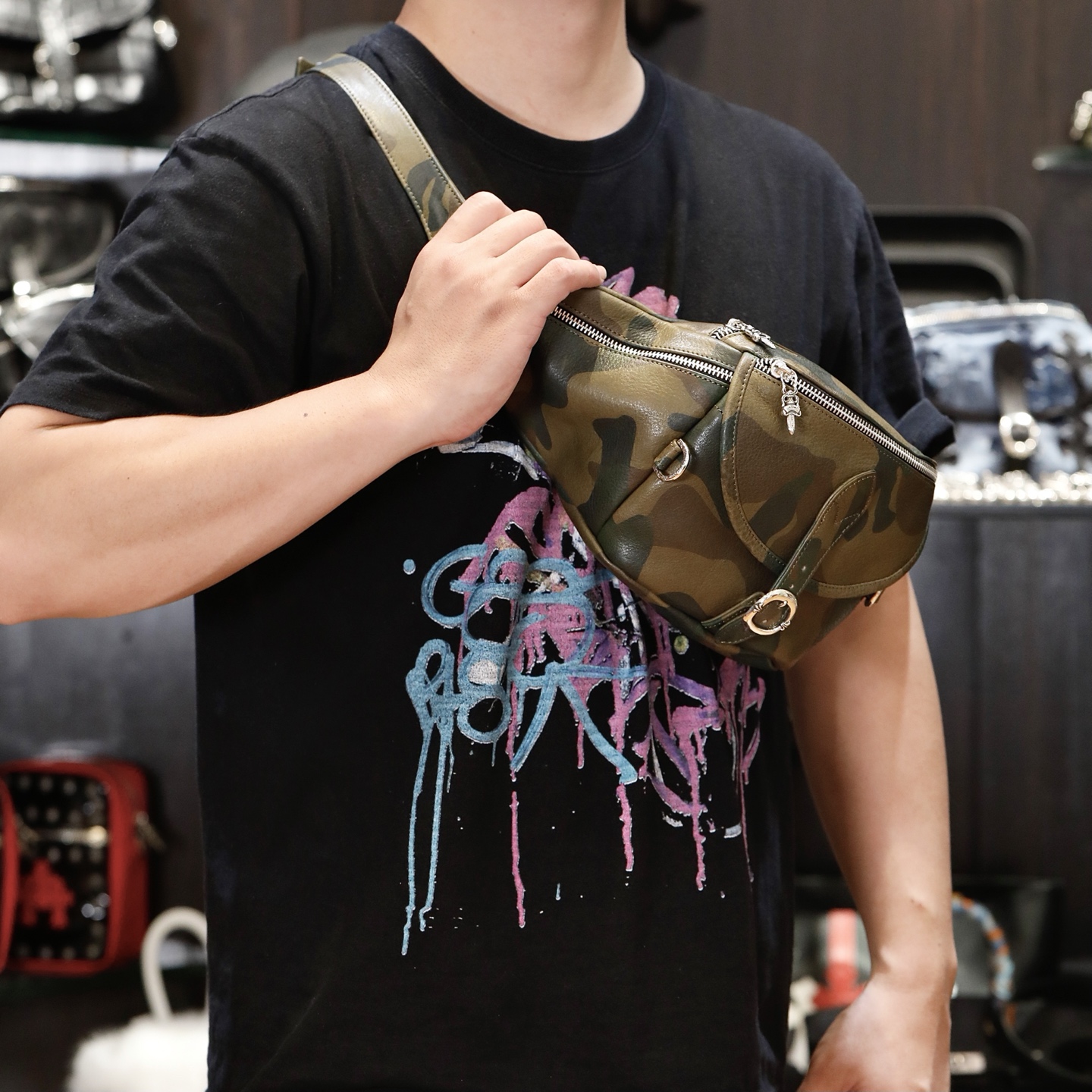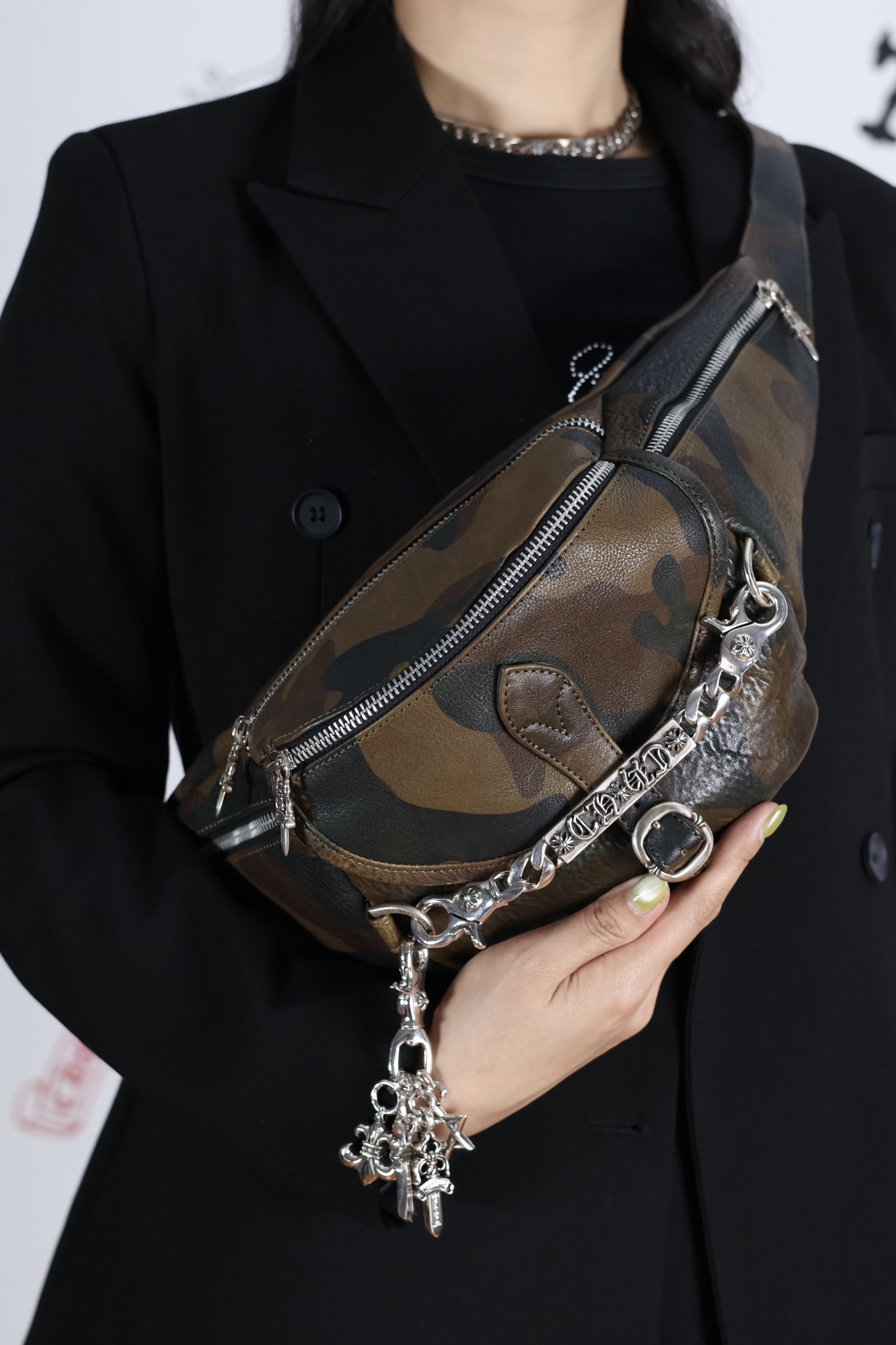 这款包包是AAAAA 1:1 质量 (非常棒). 使用了和原版一模一样的材料. 商标部分也保持了和克罗心/Chrome Hearts一样. 图片拍摄是实物包包拍摄, 您所收到的实物保证和我们图片一模一样.