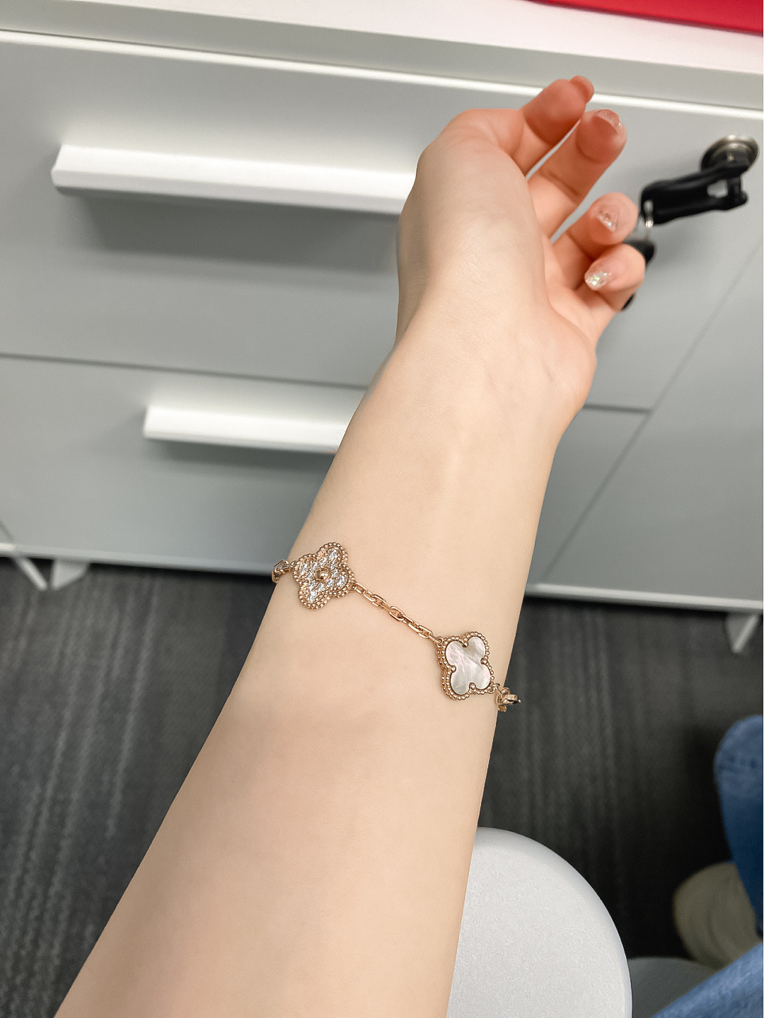 这款首饰是AAAAA 1:1 质量 (非常棒). 使用了和原版一模一样的材料. 商标部分也保持了和梵克雅宝/Van Cleef & Arpels一样. 图片拍摄是实物首饰拍摄, 您所收到的实物保证和我们图片一模一样.