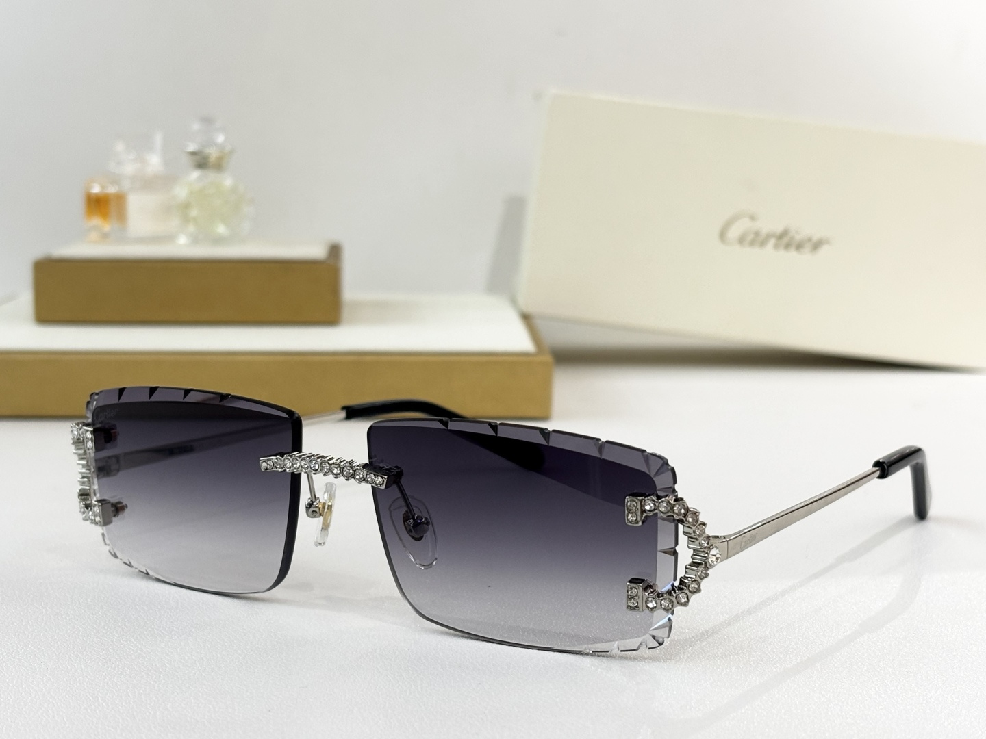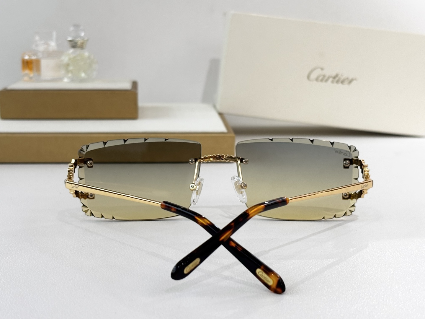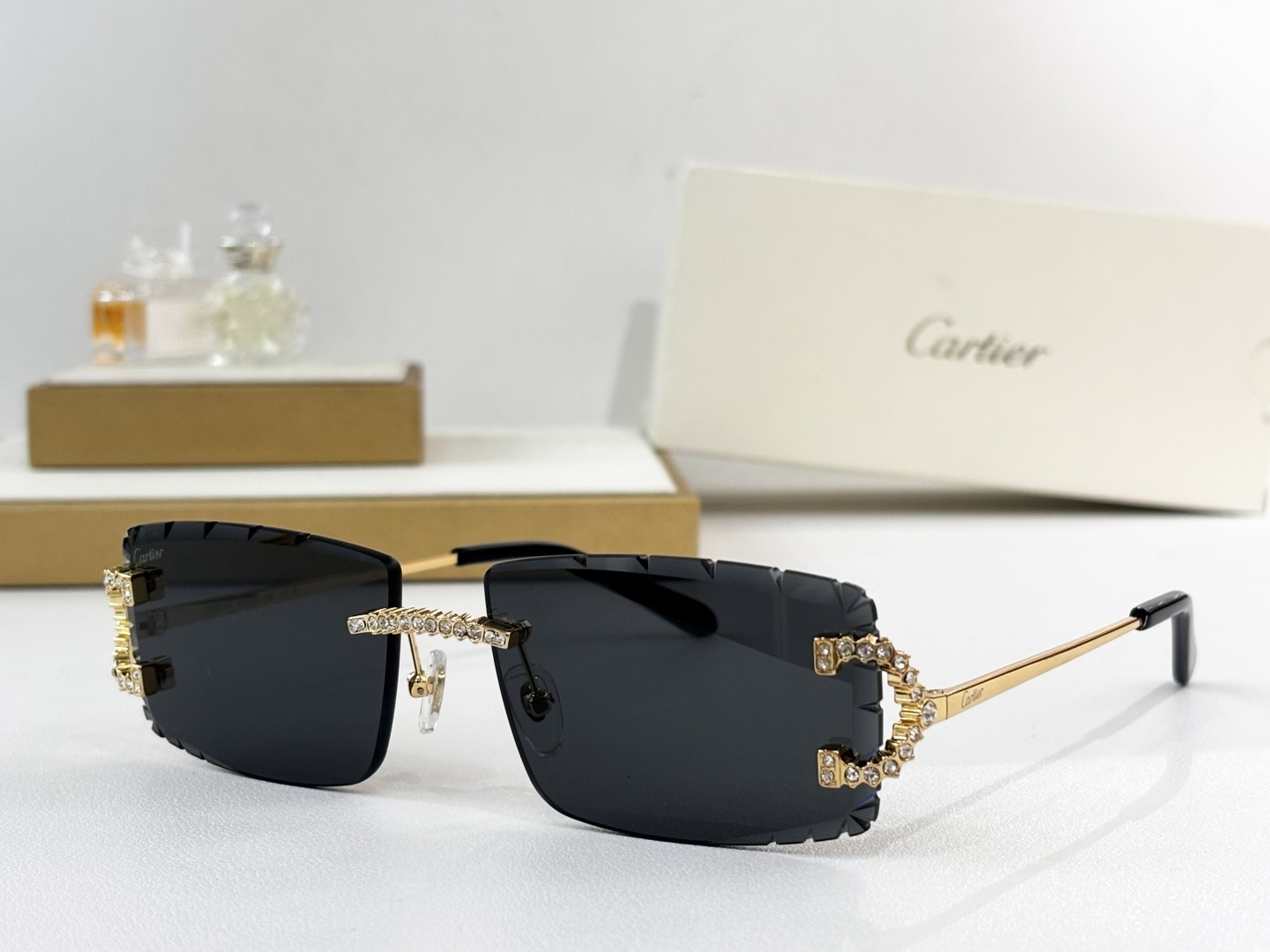 这款太阳眼镜是AAAAA 1:1 质量 (非常棒). 使用了和原版一模一样的材料. 商标部分也保持了和卡地亚/Cartier一样. 图片拍摄是实物太阳眼镜拍摄, 您所收到的实物保证和我们图片一模一样.