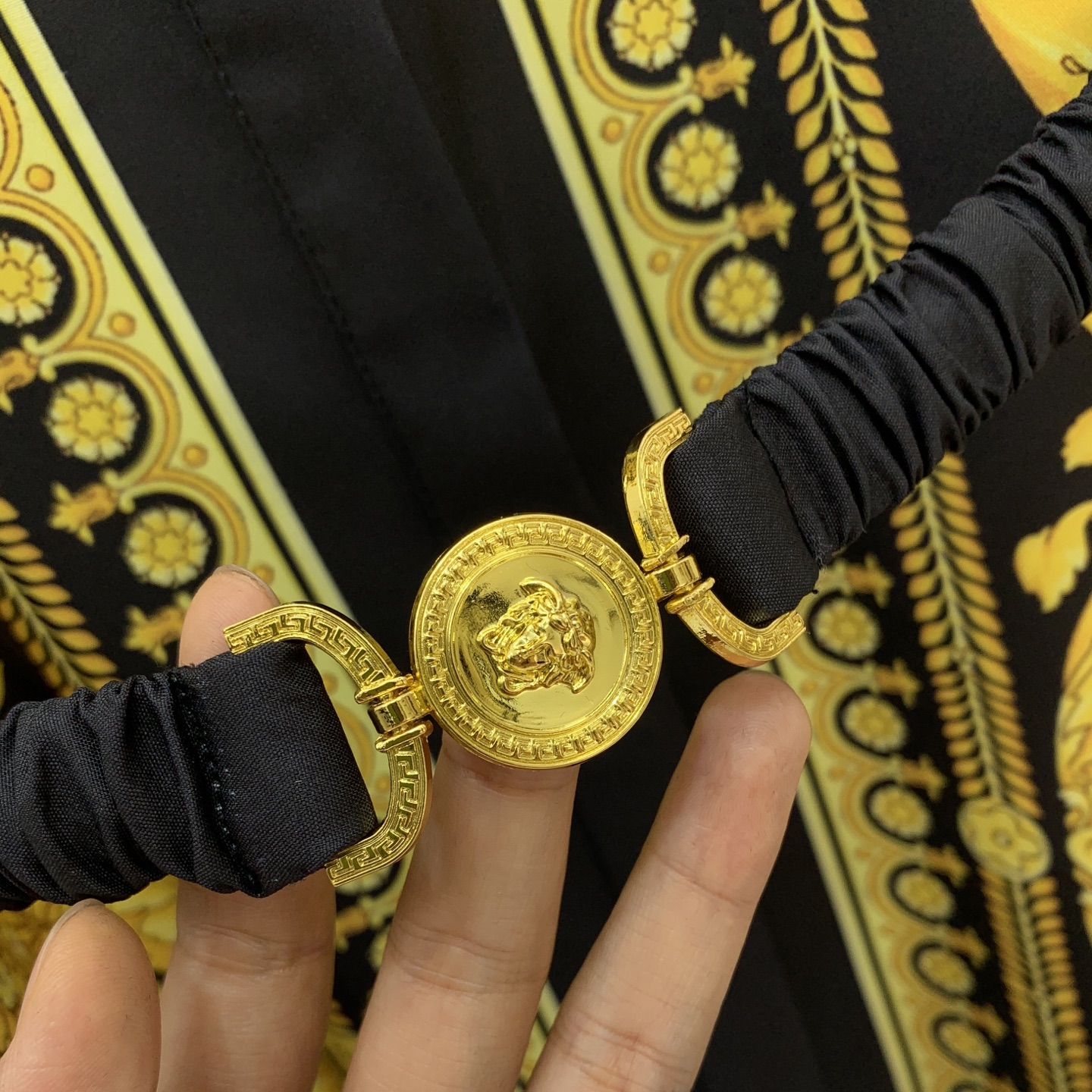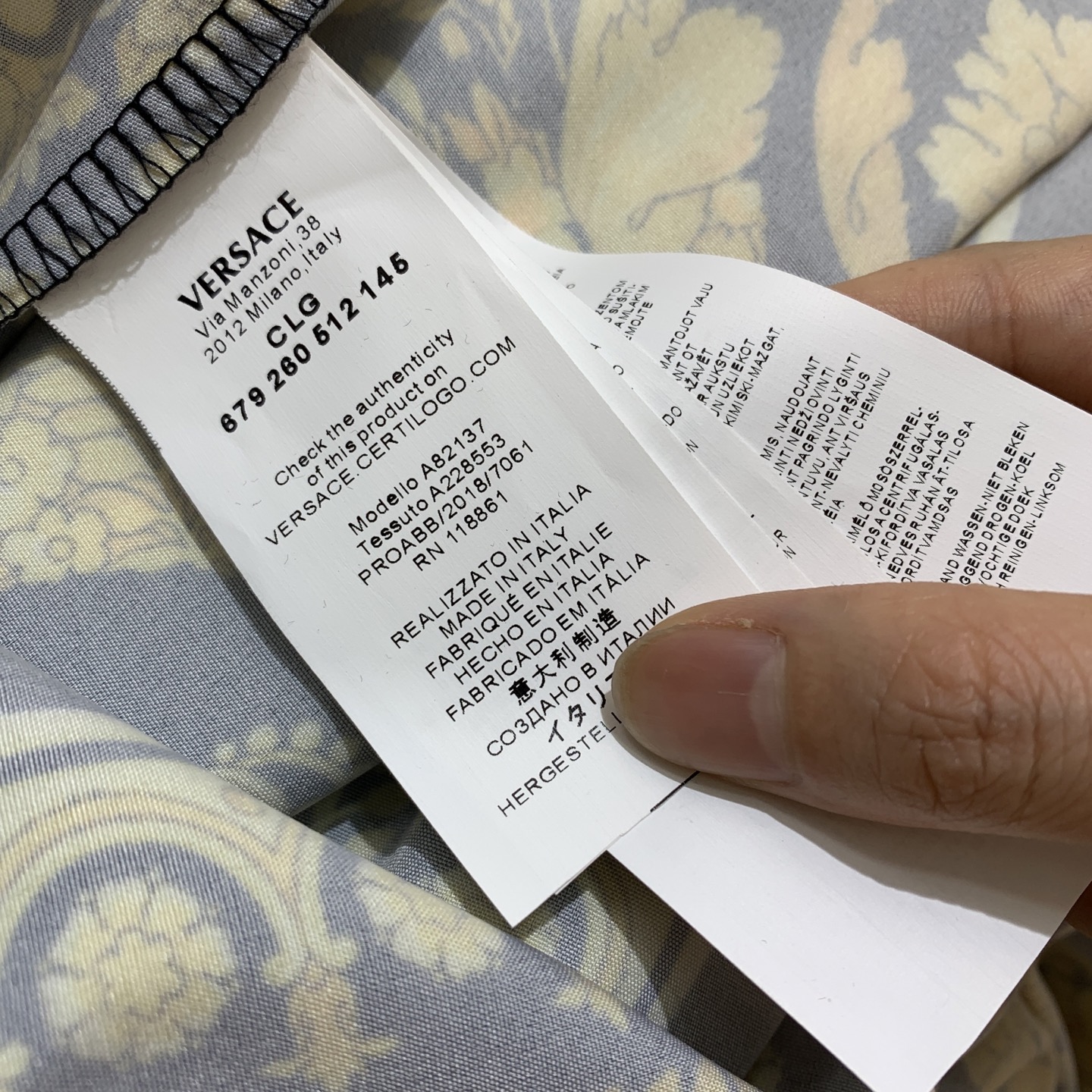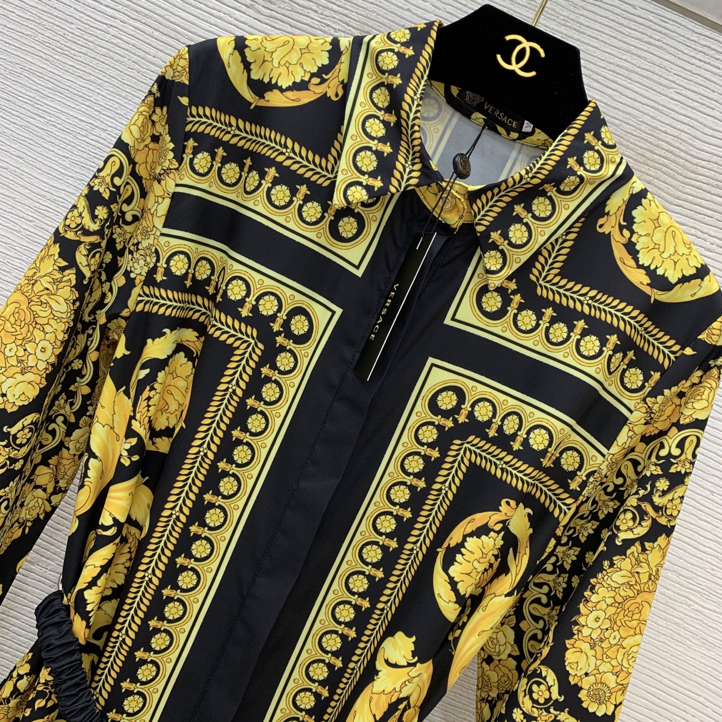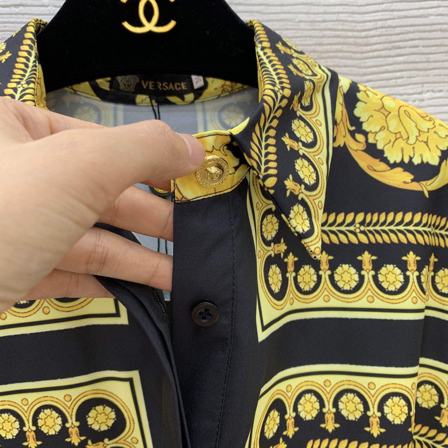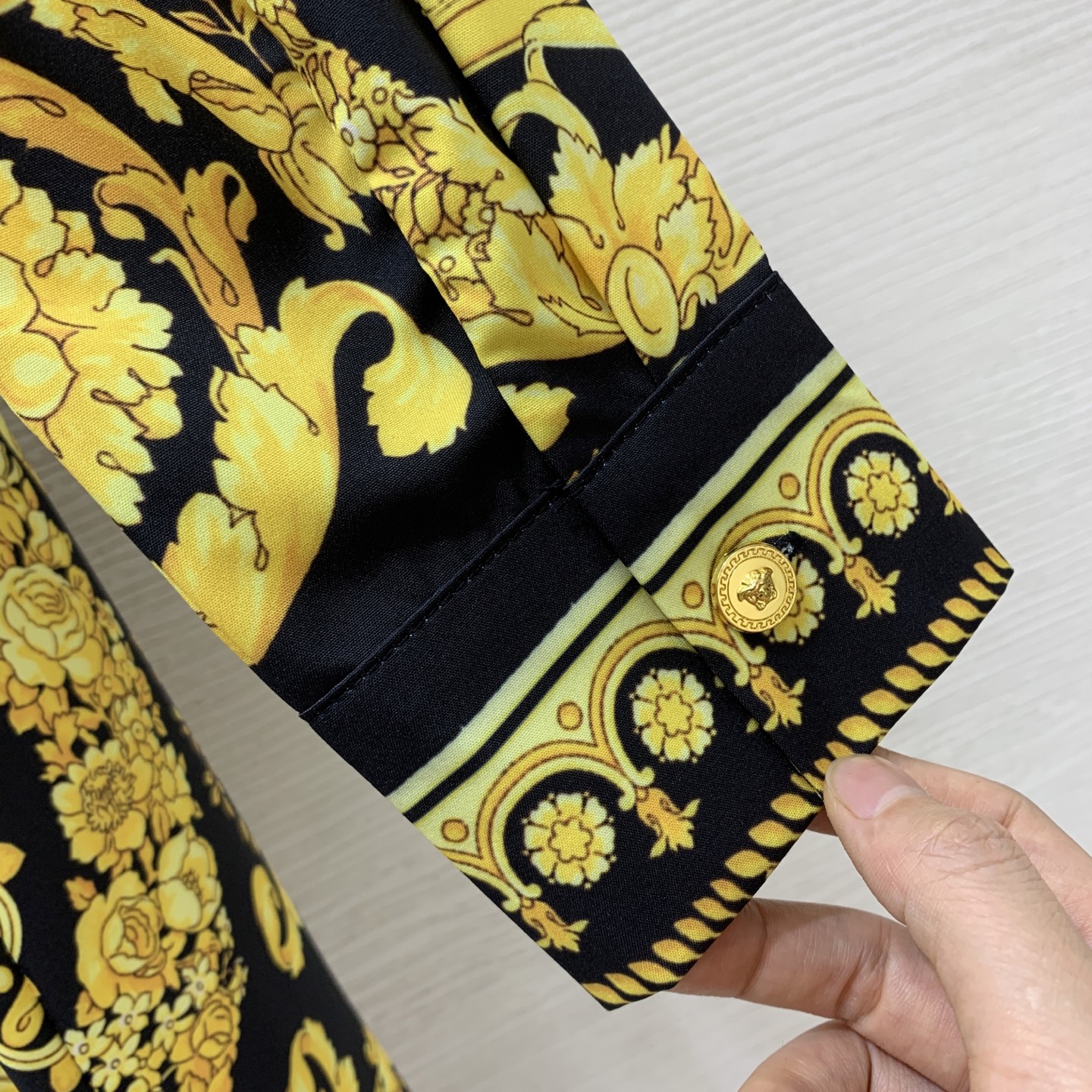 这款衣服是AAAAA 1:1 质量 (非常棒). 使用了和原版一模一样的材料. 商标部分也保持了和范思哲/Versace一样. 图片拍摄是实物衣服拍摄, 您所收到的实物保证和我们图片一模一样.