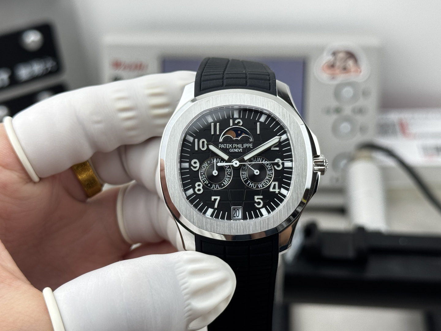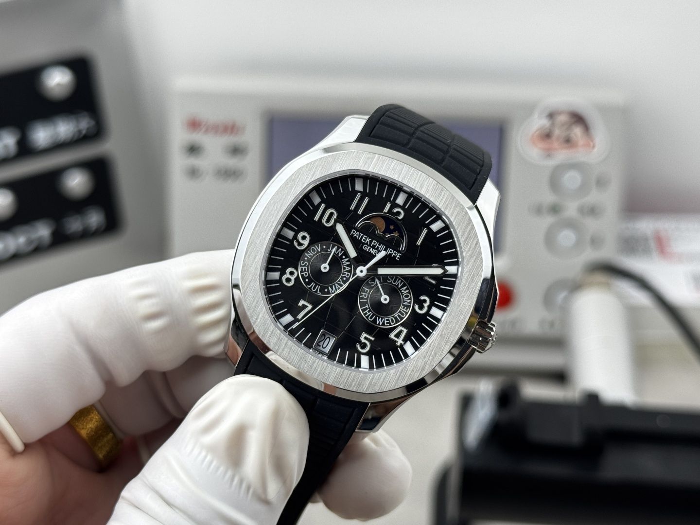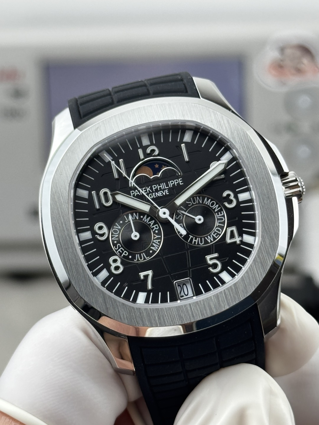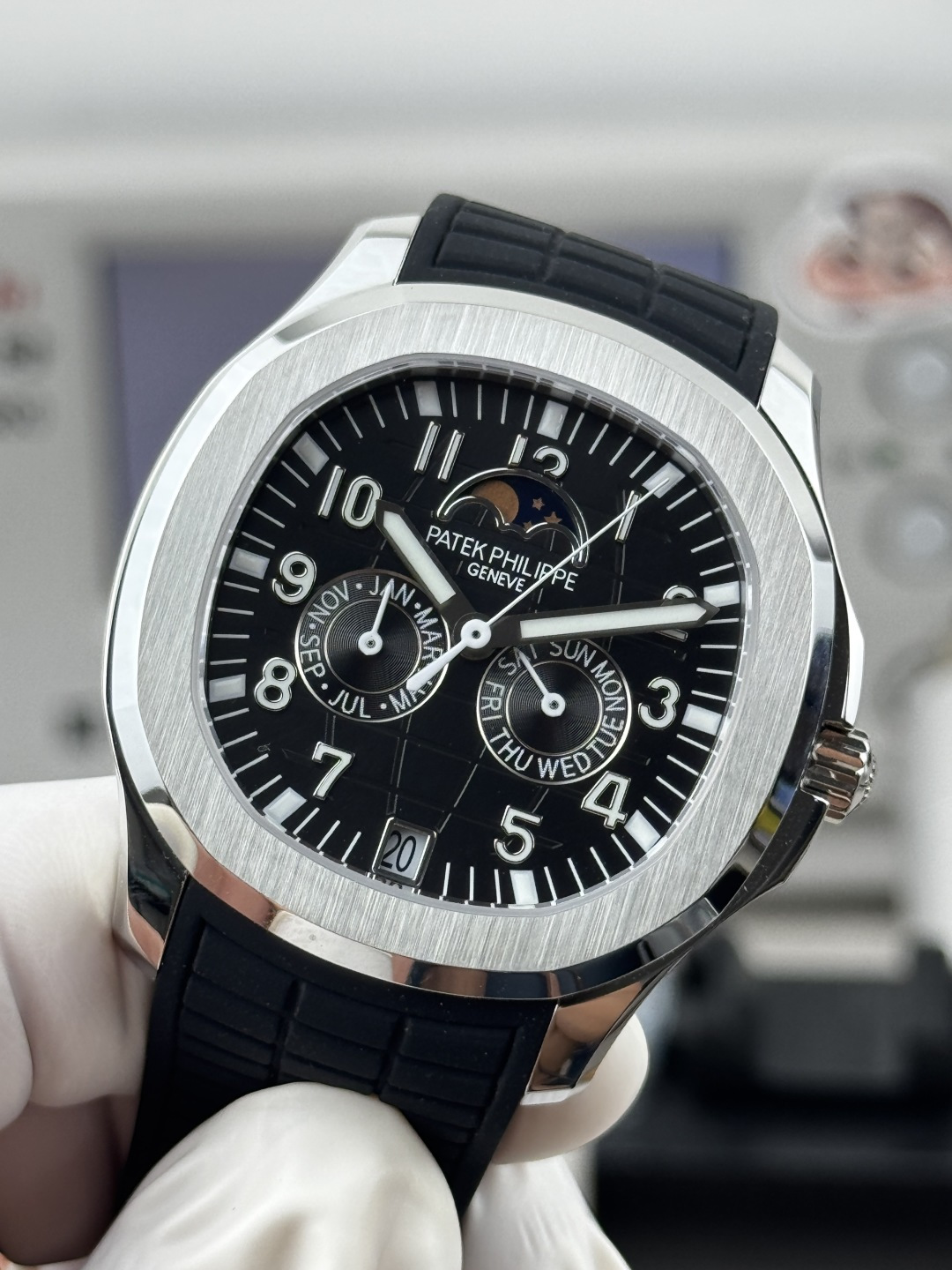 这款手表是AAAAA 1:1 质量 (非常棒). 使用了和原版一模一样的材料. 商标部分也保持了和百达翡丽/Patek Philippe一样. 图片拍摄是实物手表拍摄, 您所收到的实物保证和我们图片一模一样.