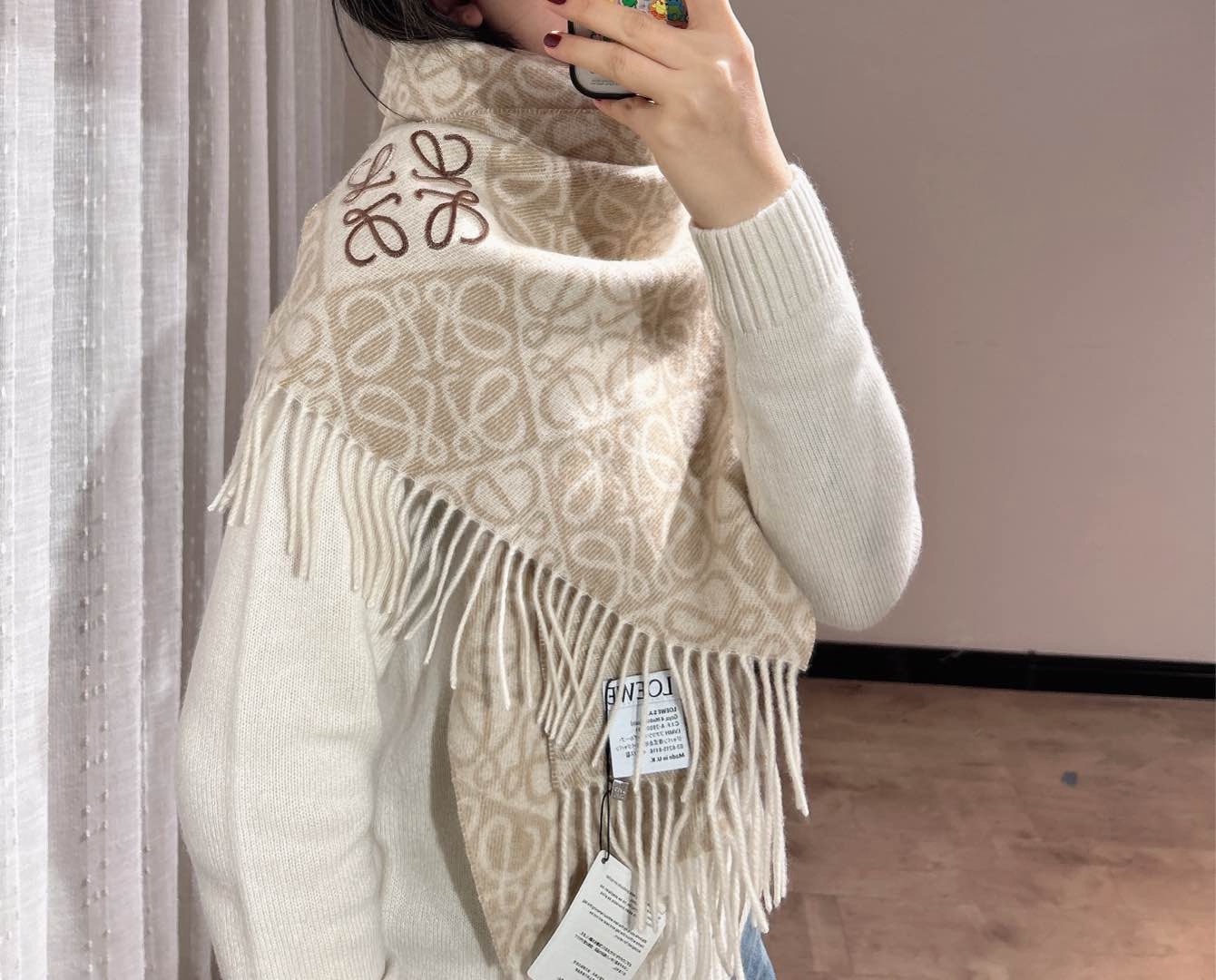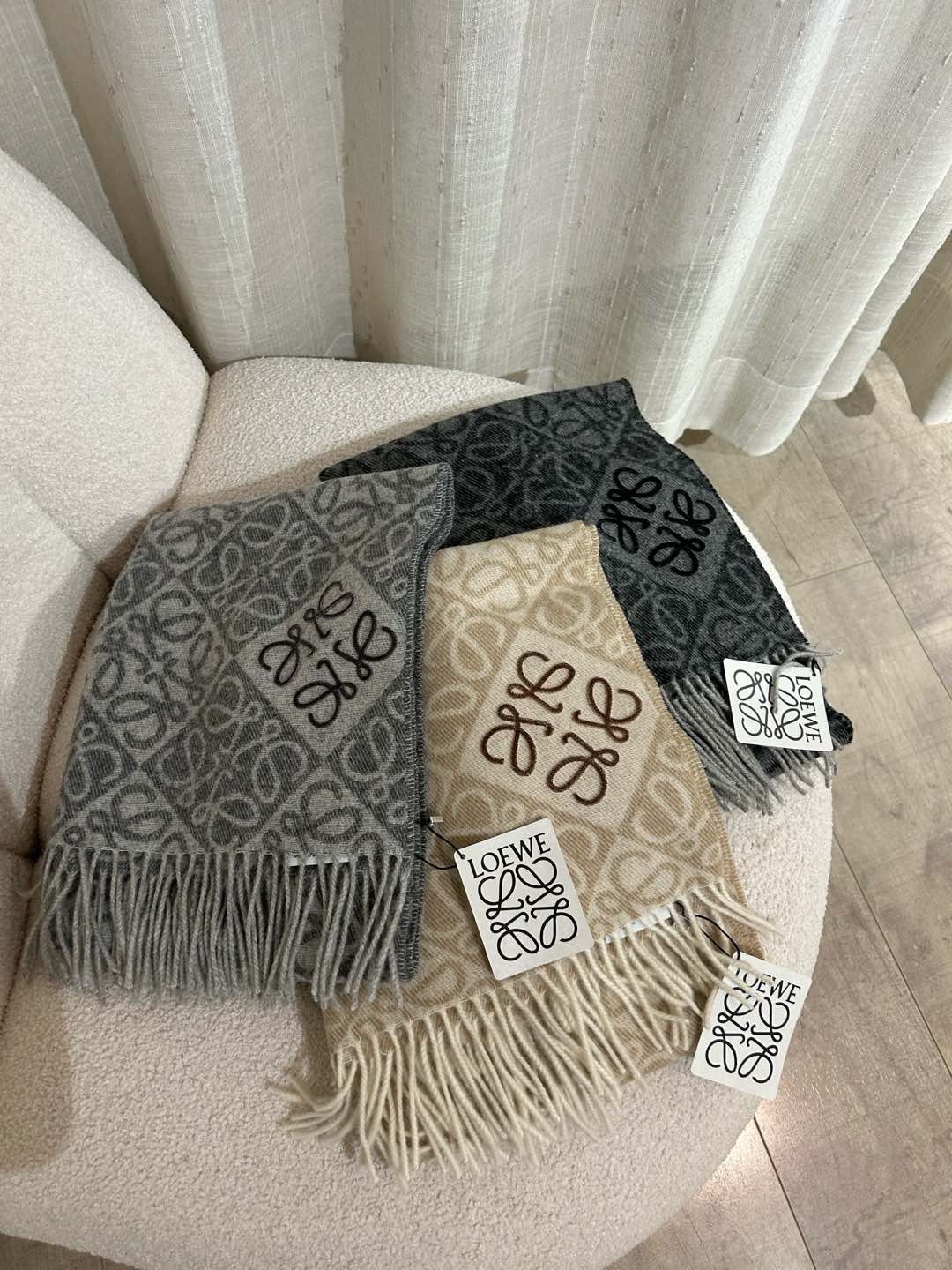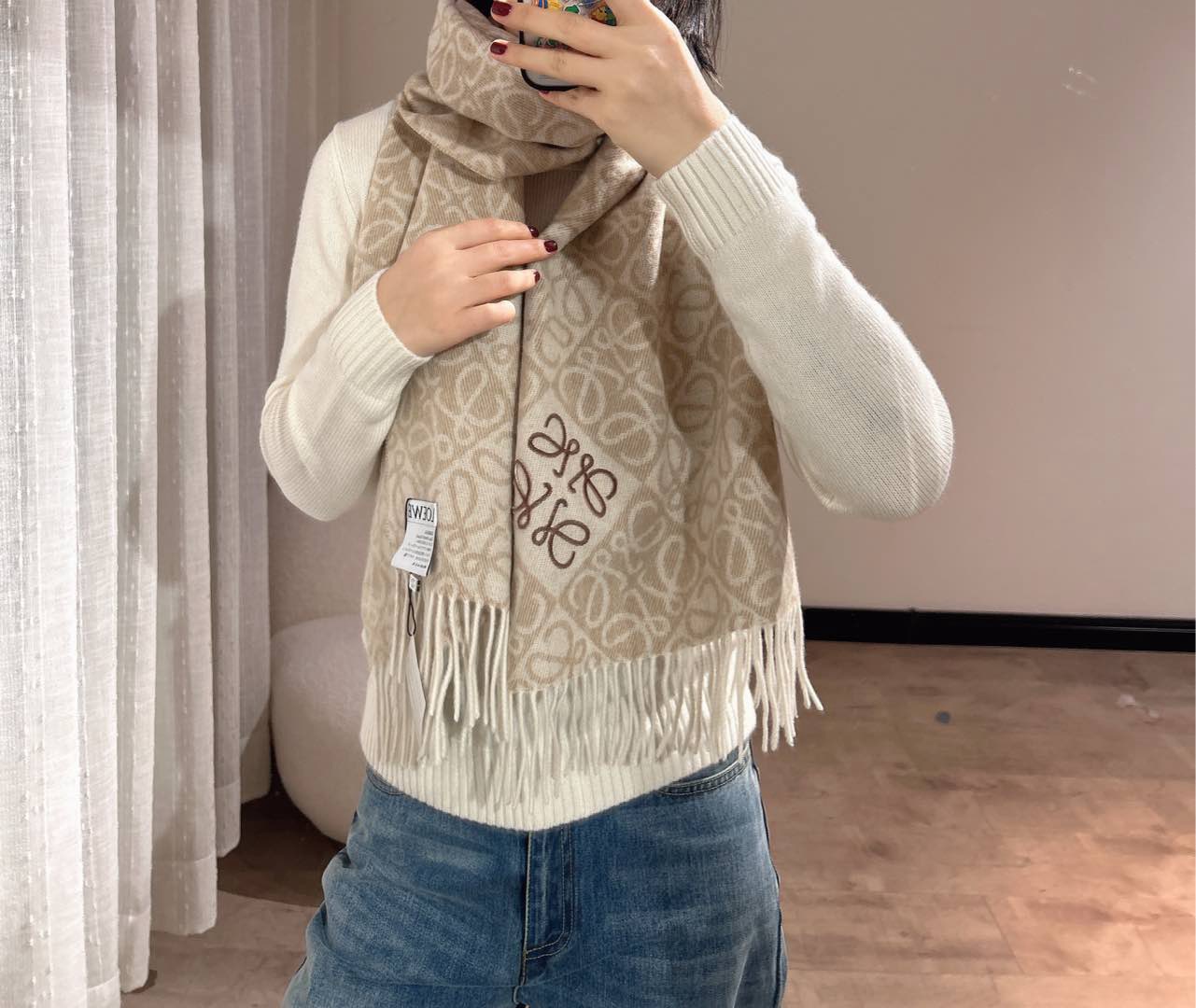 这款围巾是AAAAA 1:1 质量 (非常棒). 使用了和原版一模一样的材料. 商标部分也保持了和罗意威/Loewe一样. 图片拍摄是实物围巾拍摄, 您所收到的实物保证和我们图片一模一样.