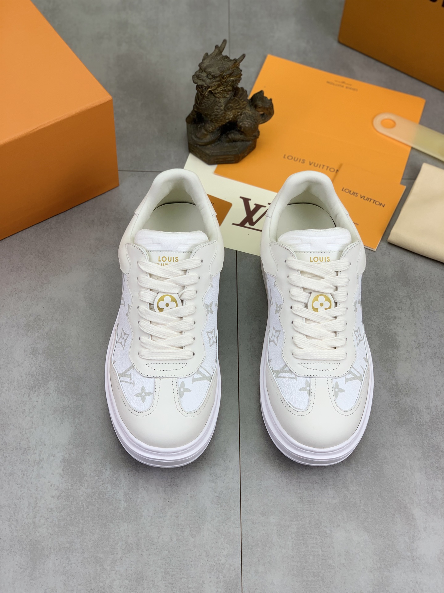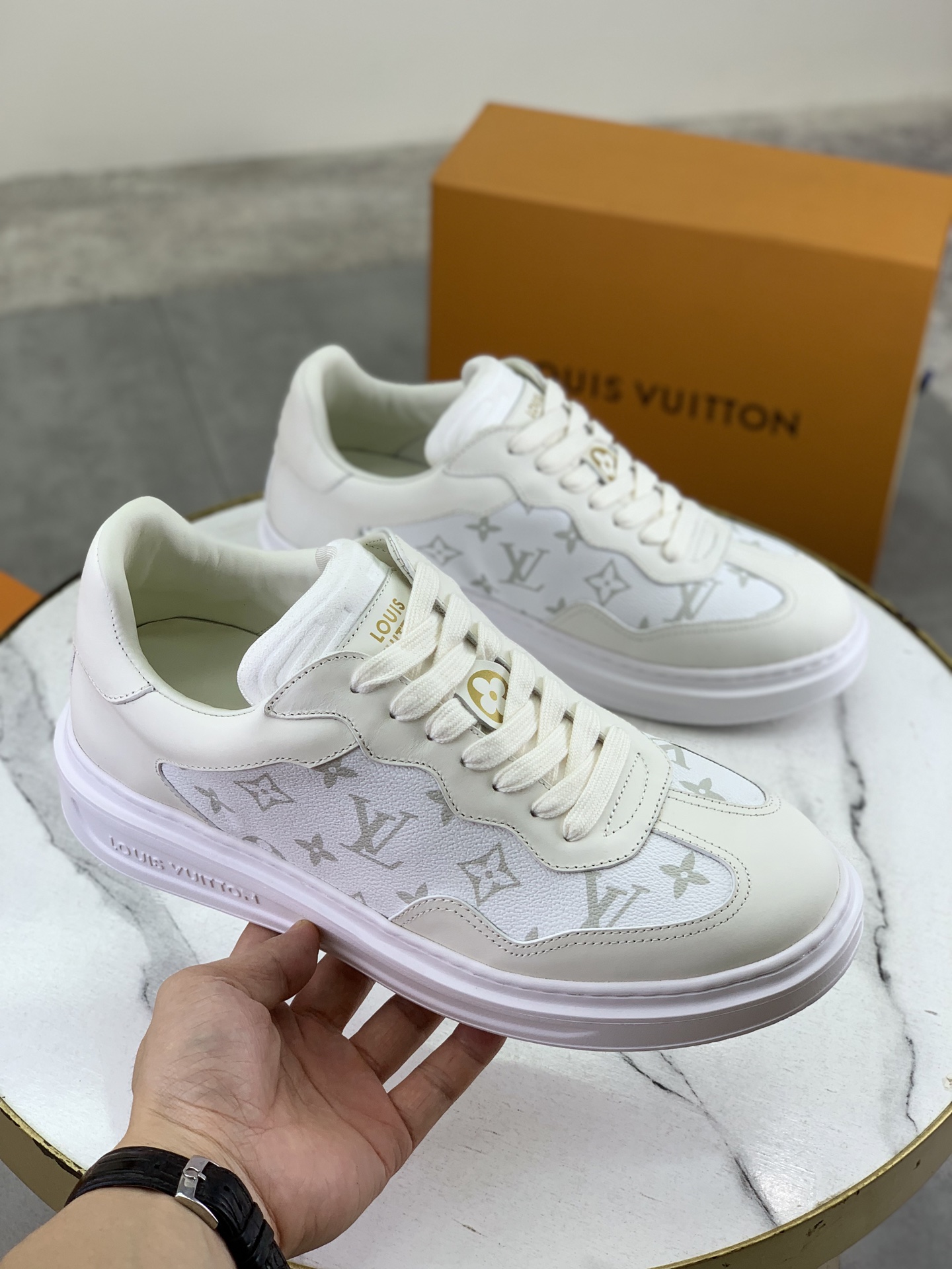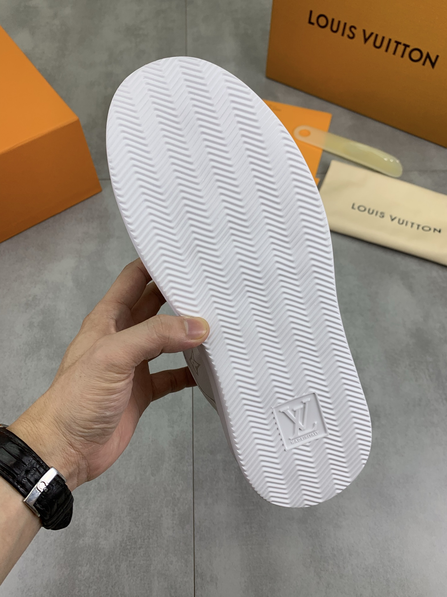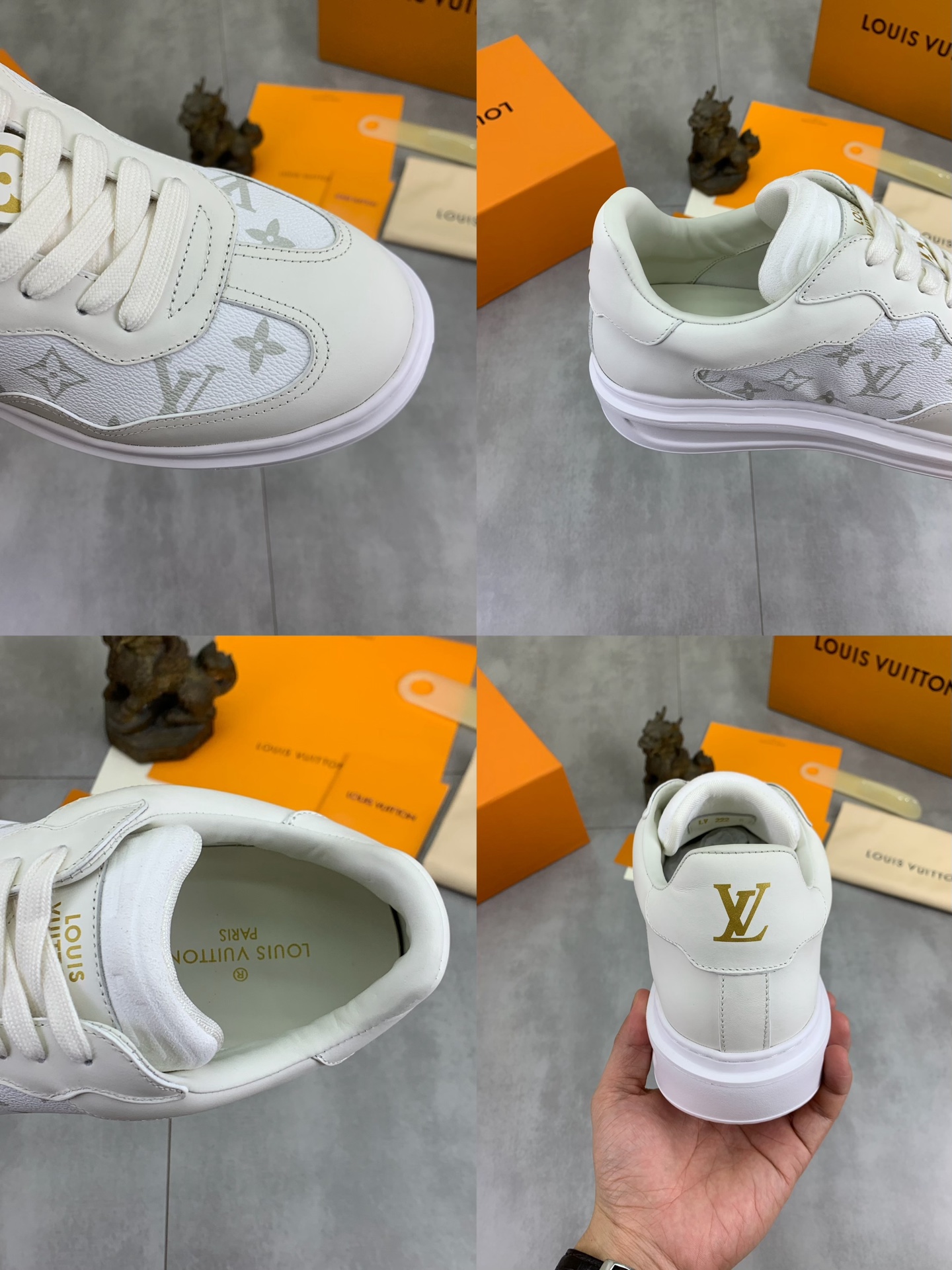 这款鞋子是AAAAA 1:1 质量 (非常棒). 使用了和原版一模一样的材料. 商标部分也保持了和路易威登/Louis Vuitton一样. 图片拍摄是实物鞋子拍摄, 您所收到的实物保证和我们图片一模一样.