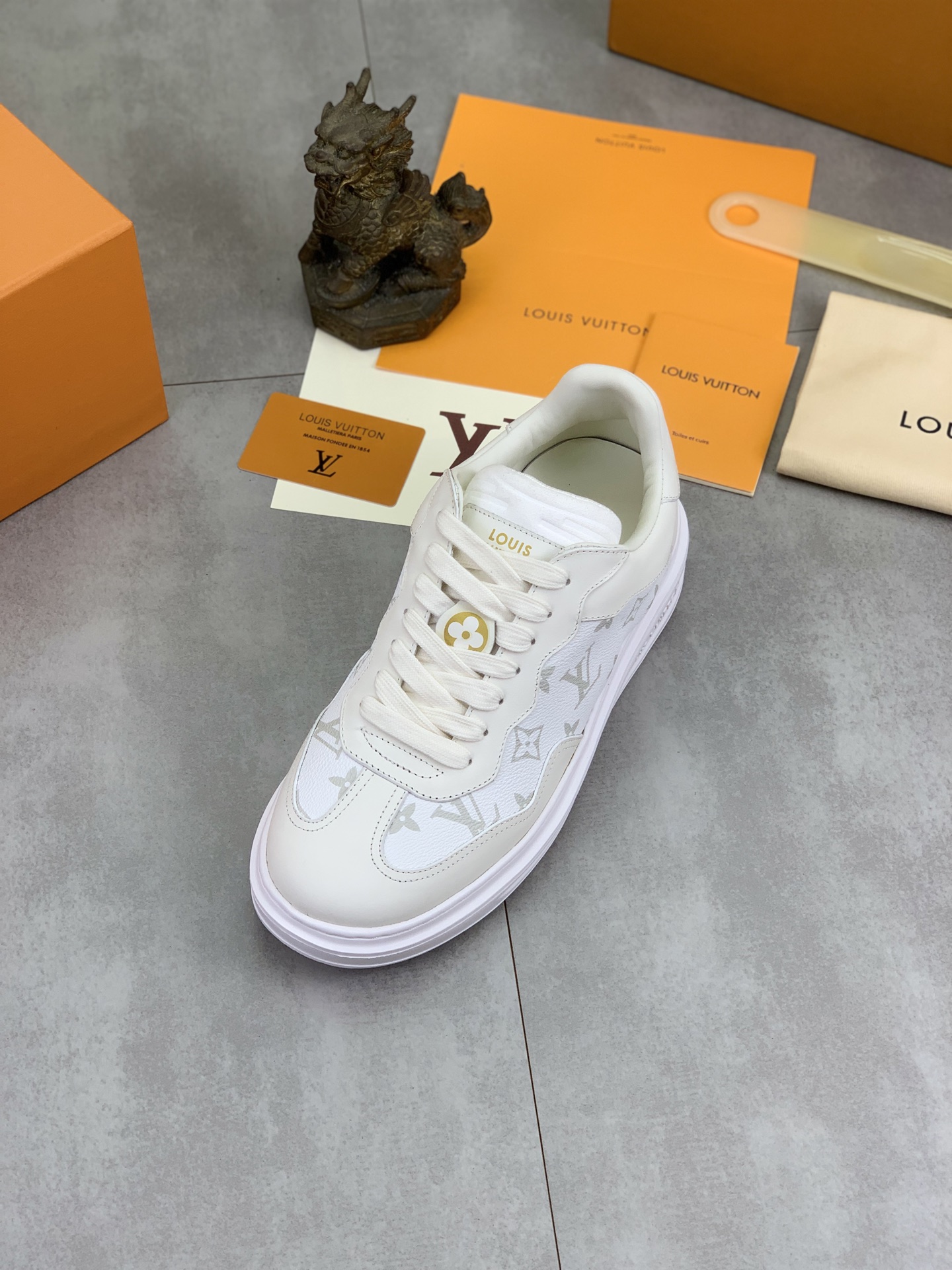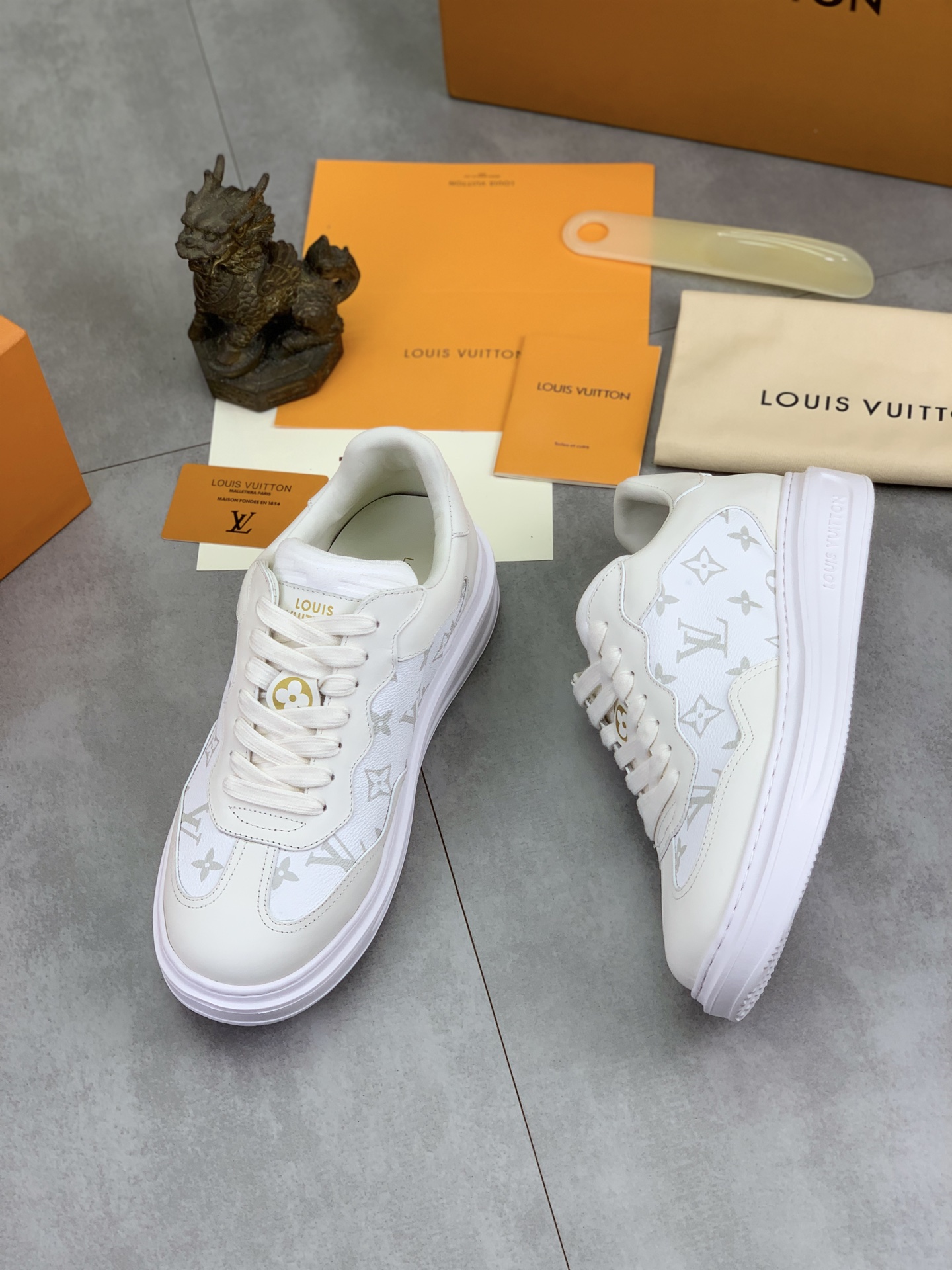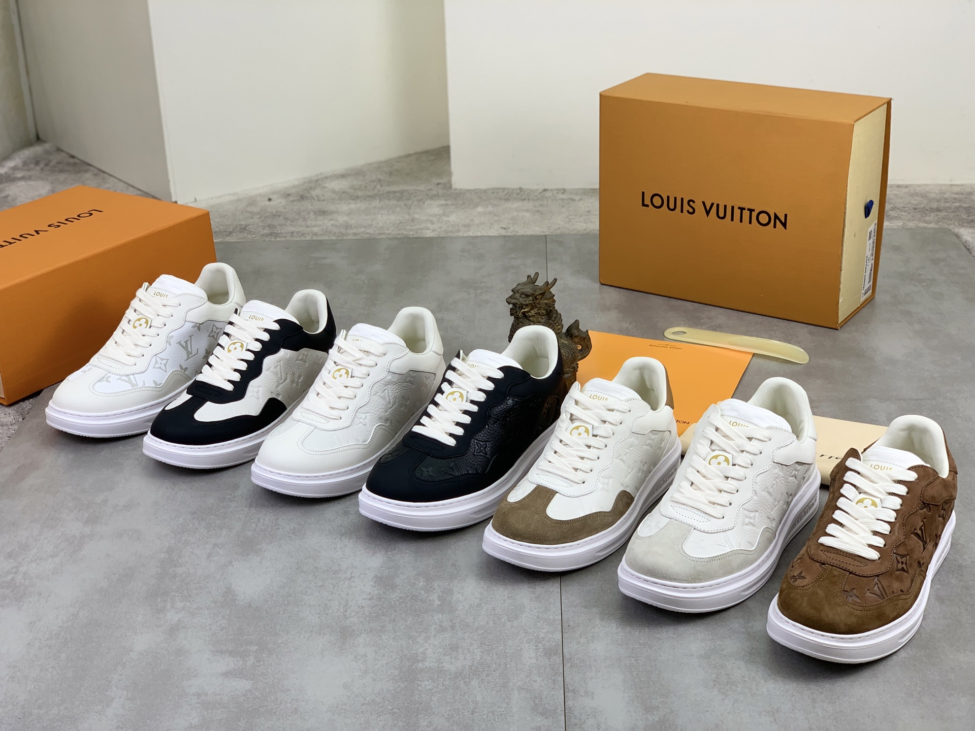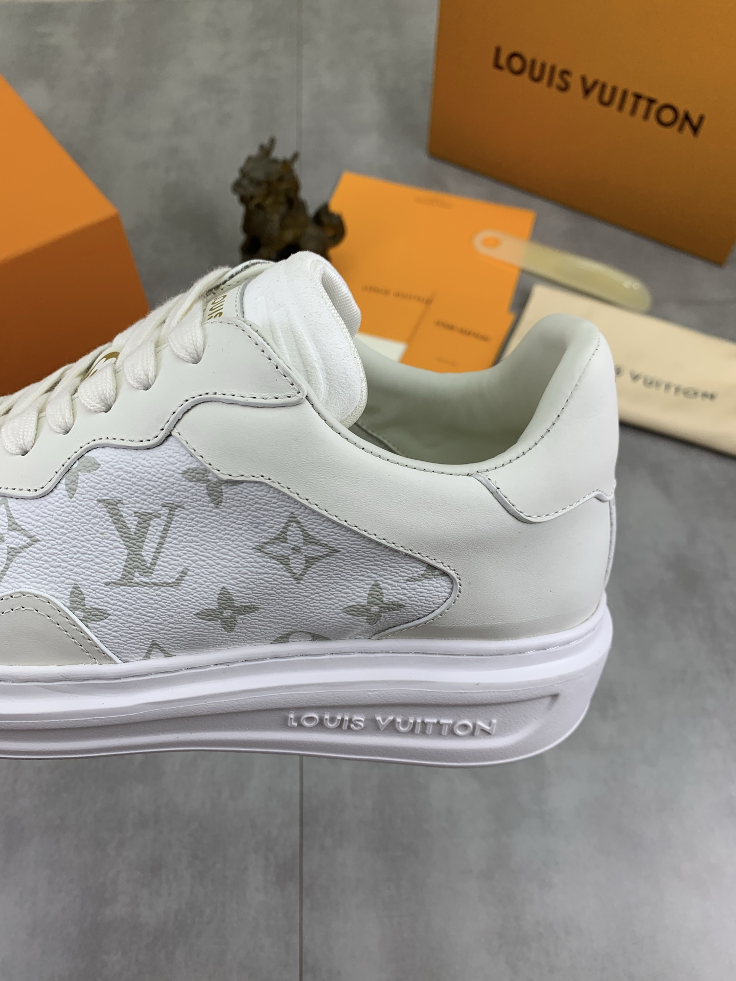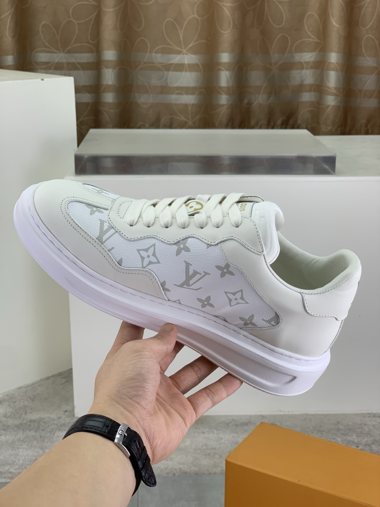这款鞋子是AAAAA 1:1 质量 (非常棒). 使用了和原版一模一样的材料. 商标部分也保持了和路易威登/Louis Vuitton一样. 图片拍摄是实物鞋子拍摄, 您所收到的实物保证和我们图片一模一样.