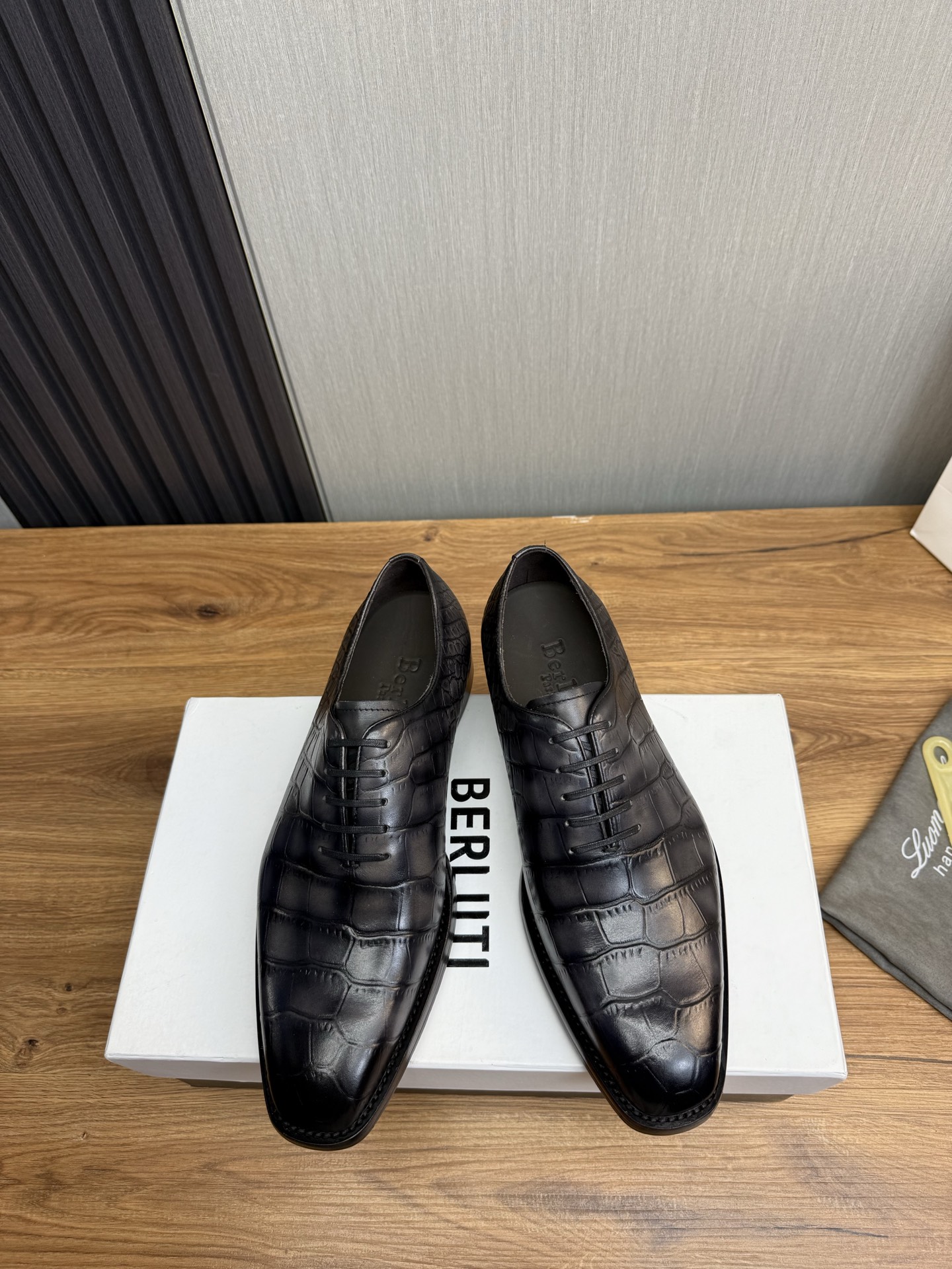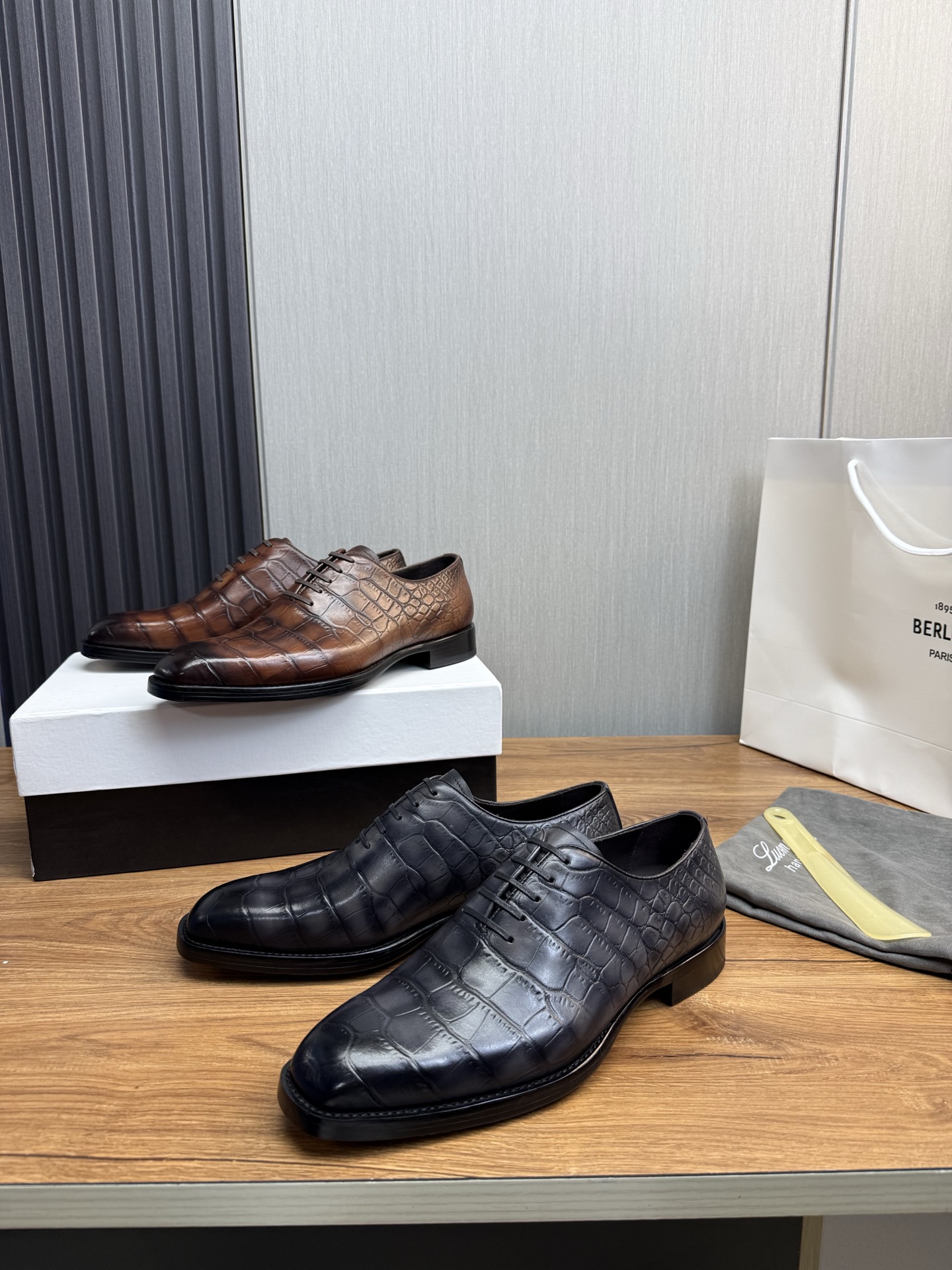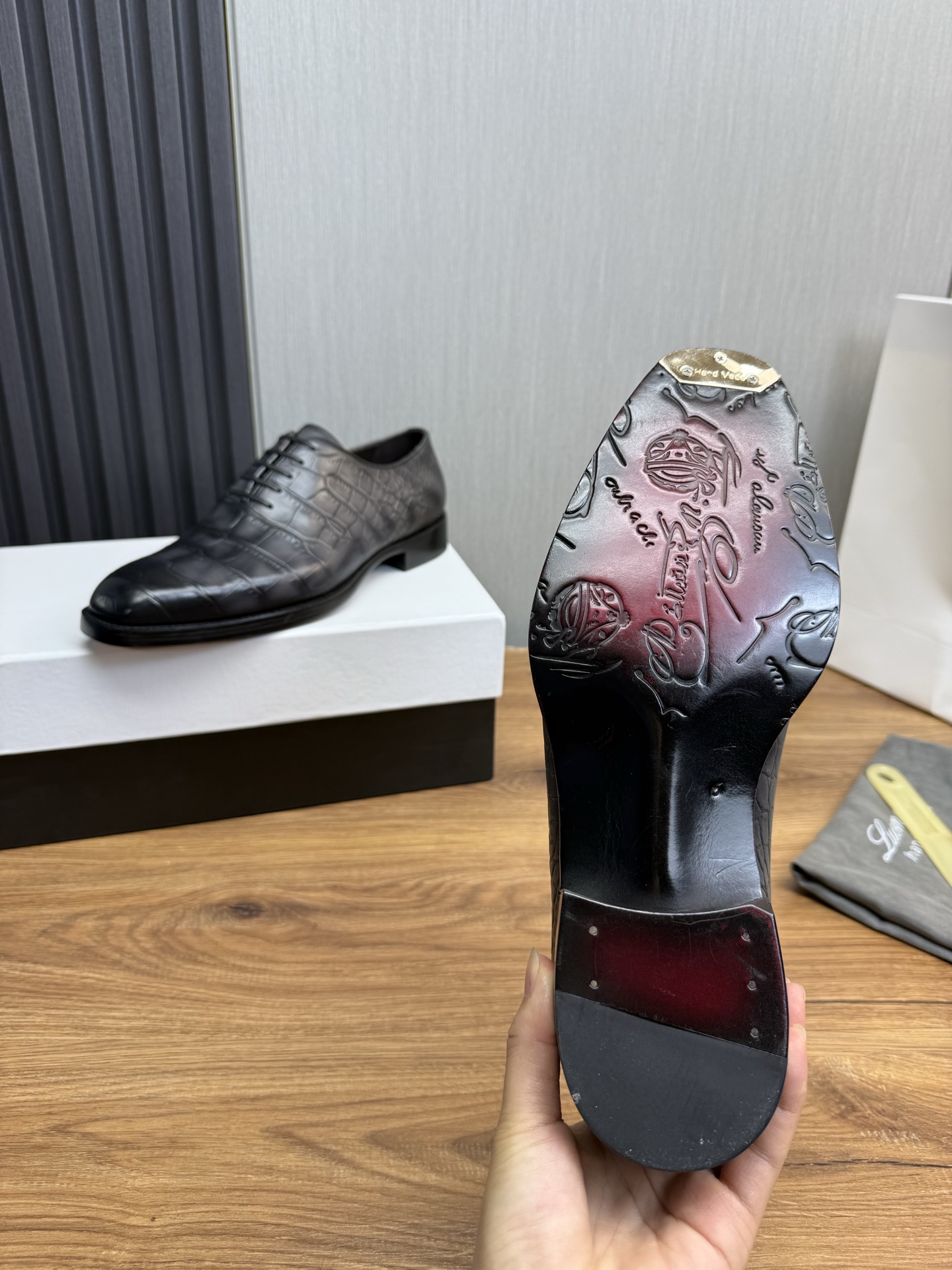 这款鞋子是AAAAA 1:1 质量 (非常棒). 使用了和原版一模一样的材料. 商标部分也保持了和Berluti一样. 图片拍摄是实物鞋子拍摄, 您所收到的实物保证和我们图片一模一样.