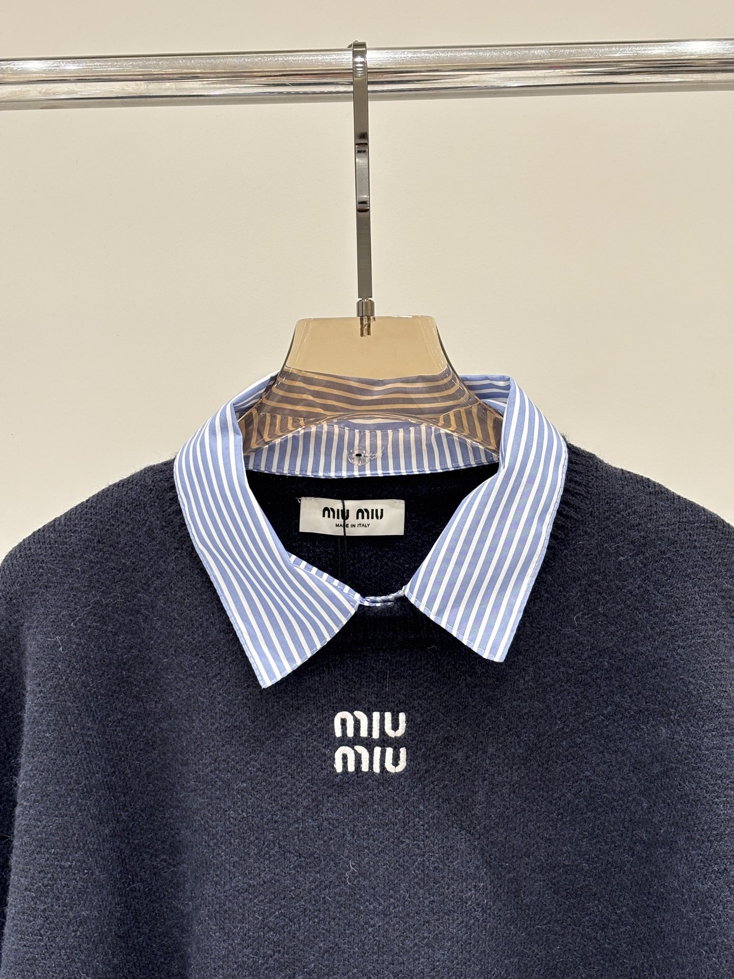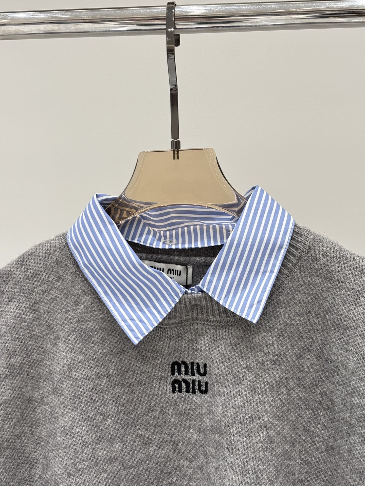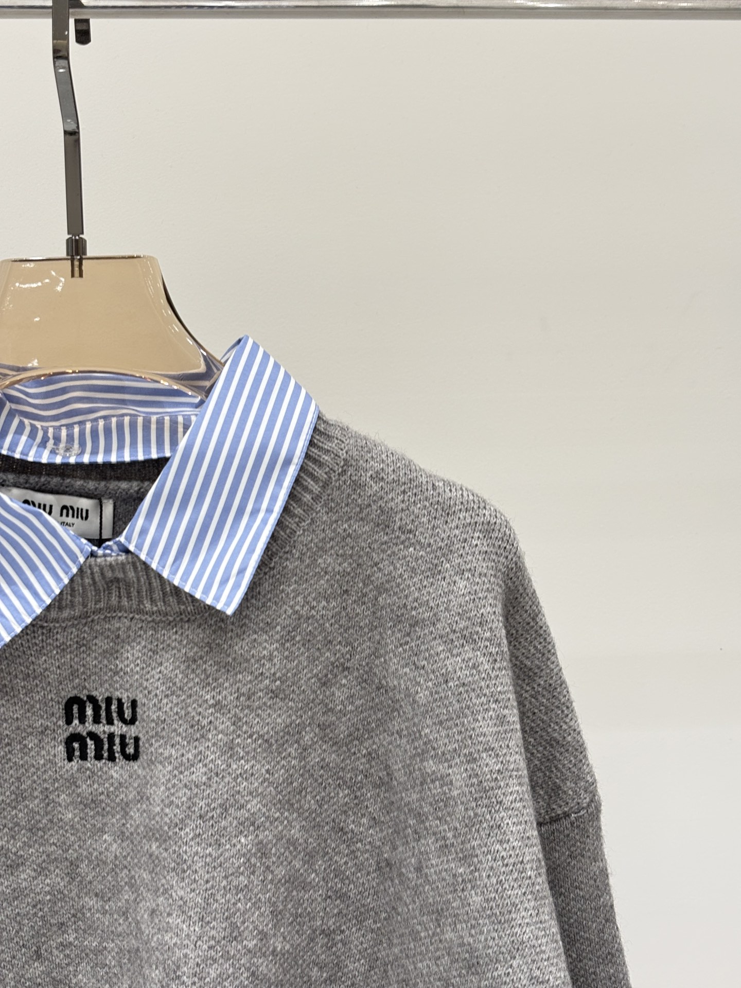 这款衣服是AAAAA 1:1 质量 (非常棒). 使用了和原版一模一样的材料. 商标部分也保持了和缪缪/Miu Miu一样. 图片拍摄是实物衣服拍摄, 您所收到的实物保证和我们图片一模一样.