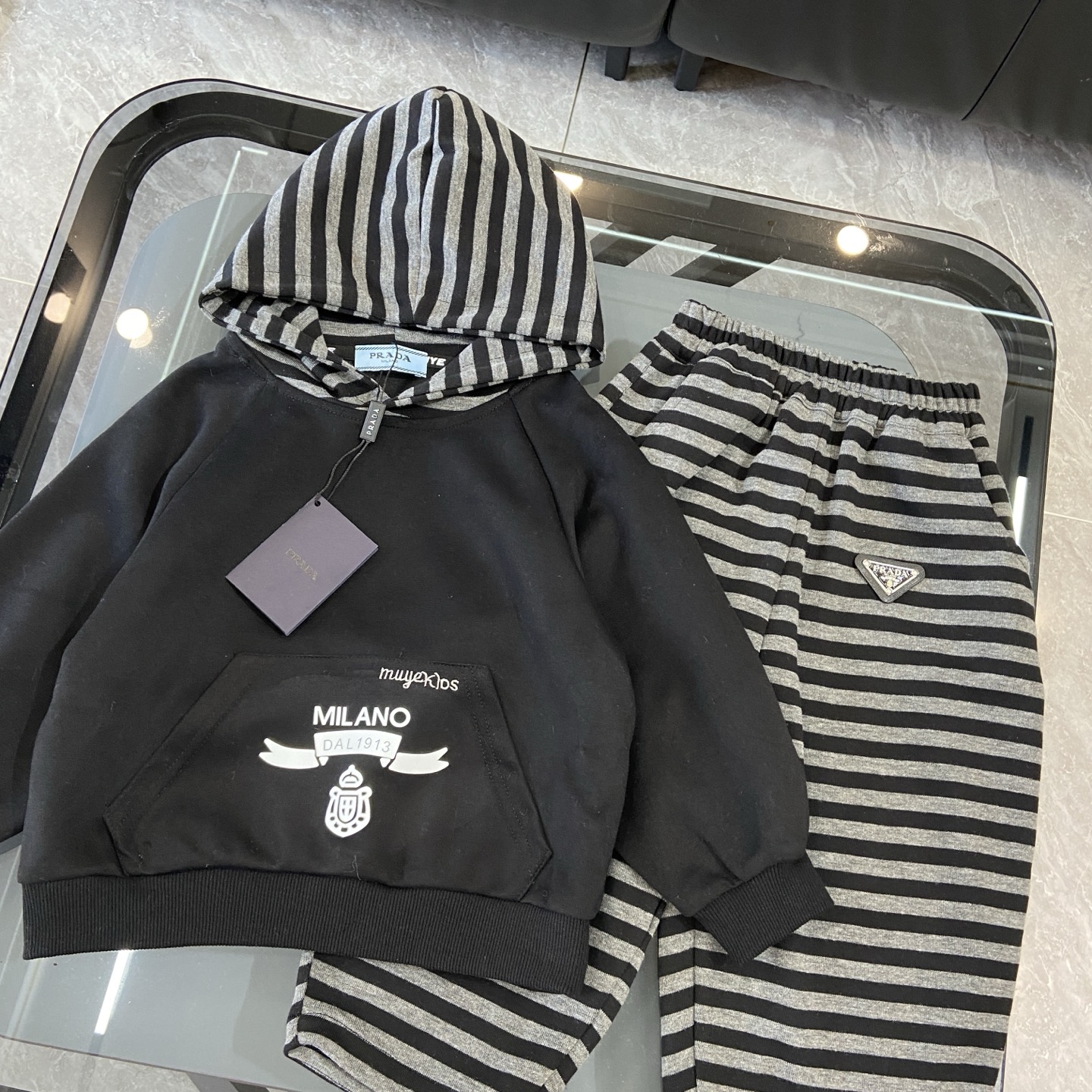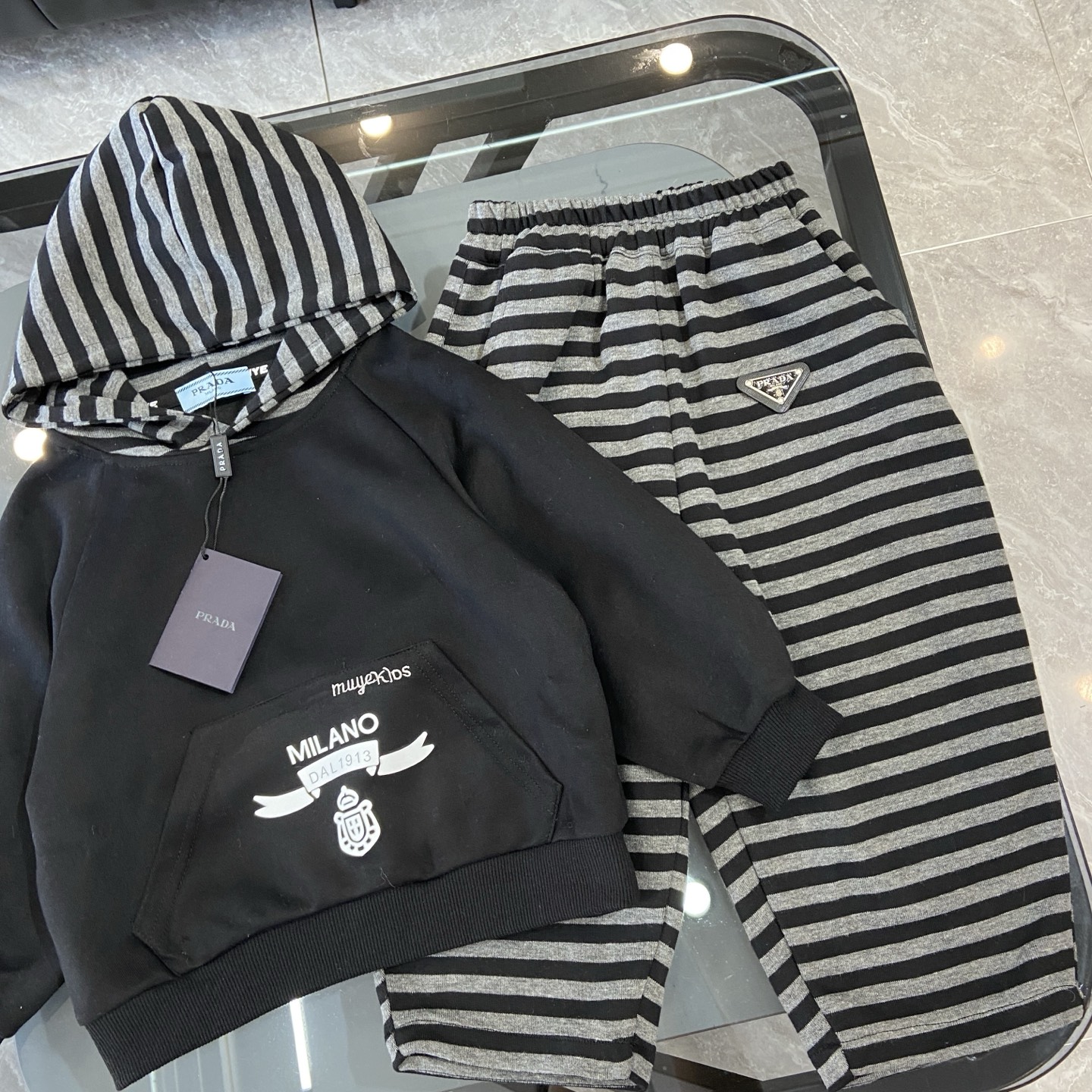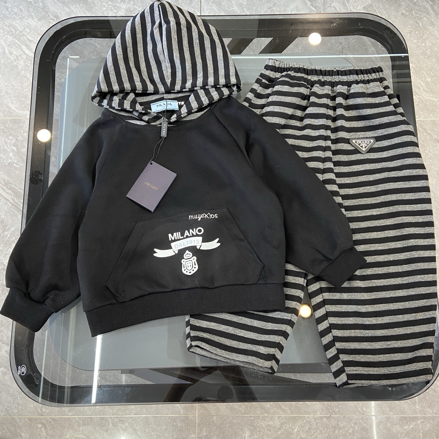 这款children's clothes是AAAAA 1:1 质量 (非常棒). 使用了和原版一模一样的材料. 商标部分也保持了和普拉达/Prada一样. 图片拍摄是实物children's clothes拍摄, 您所收到的实物保证和我们图片一模一样.