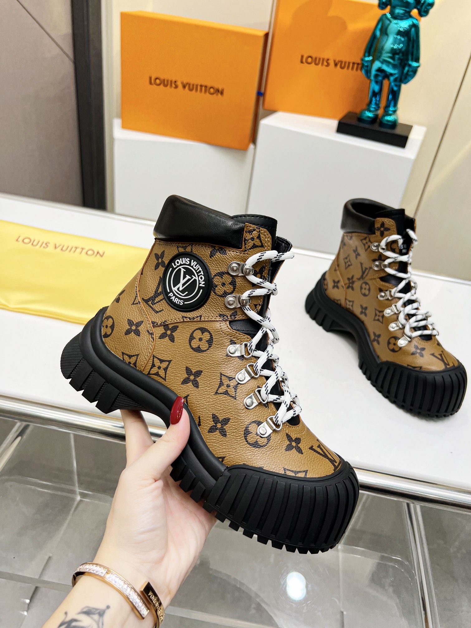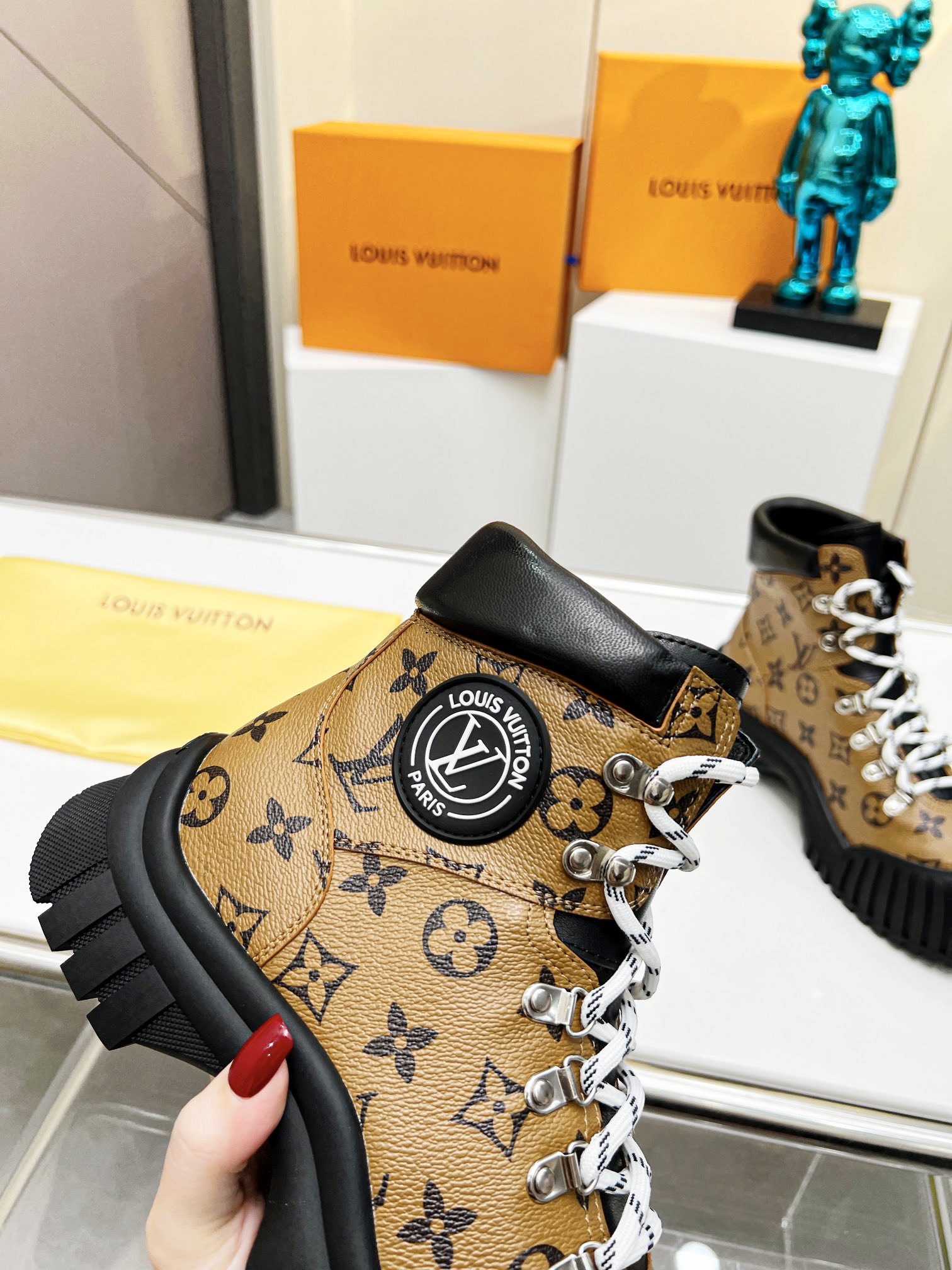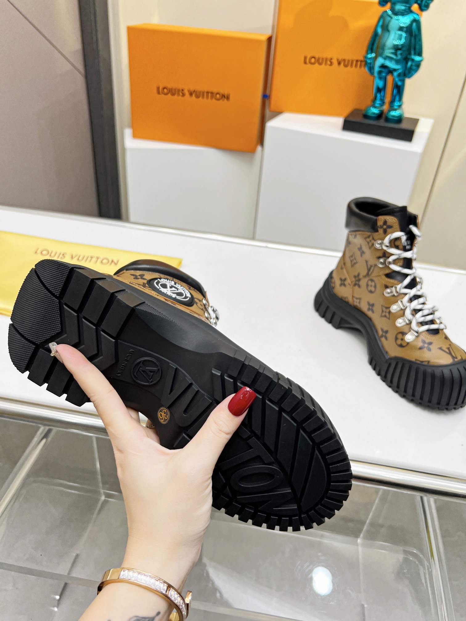 这款鞋子是AAAAA 1:1 质量 (非常棒). 使用了和原版一模一样的材料. 商标部分也保持了和路易威登/Louis Vuitton一样. 图片拍摄是实物鞋子拍摄, 您所收到的实物保证和我们图片一模一样.