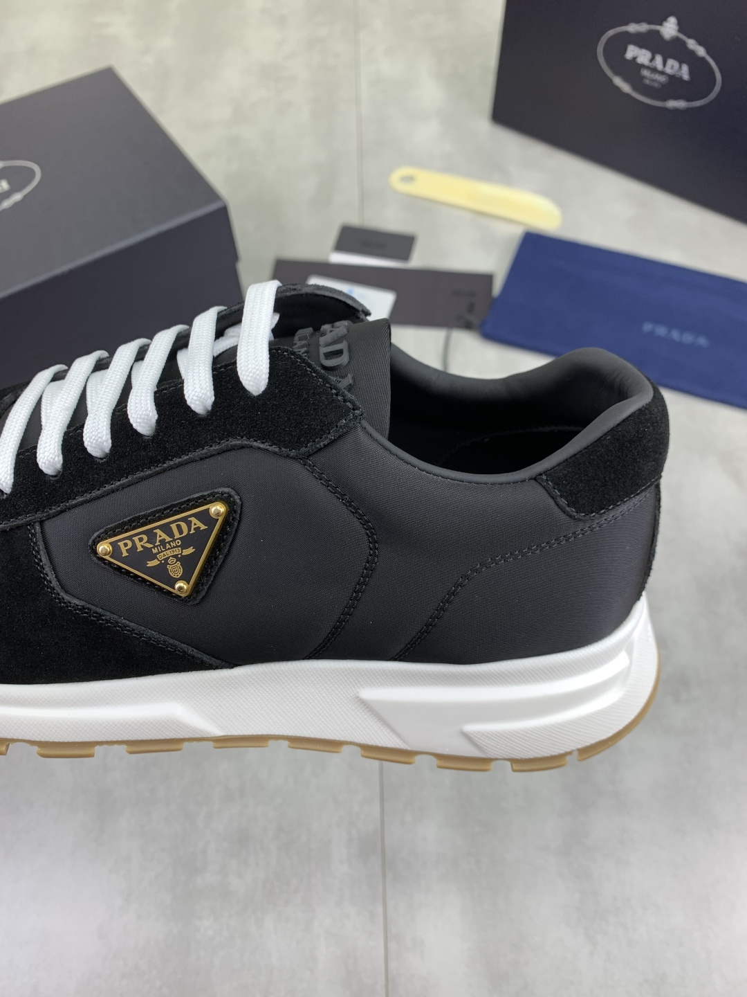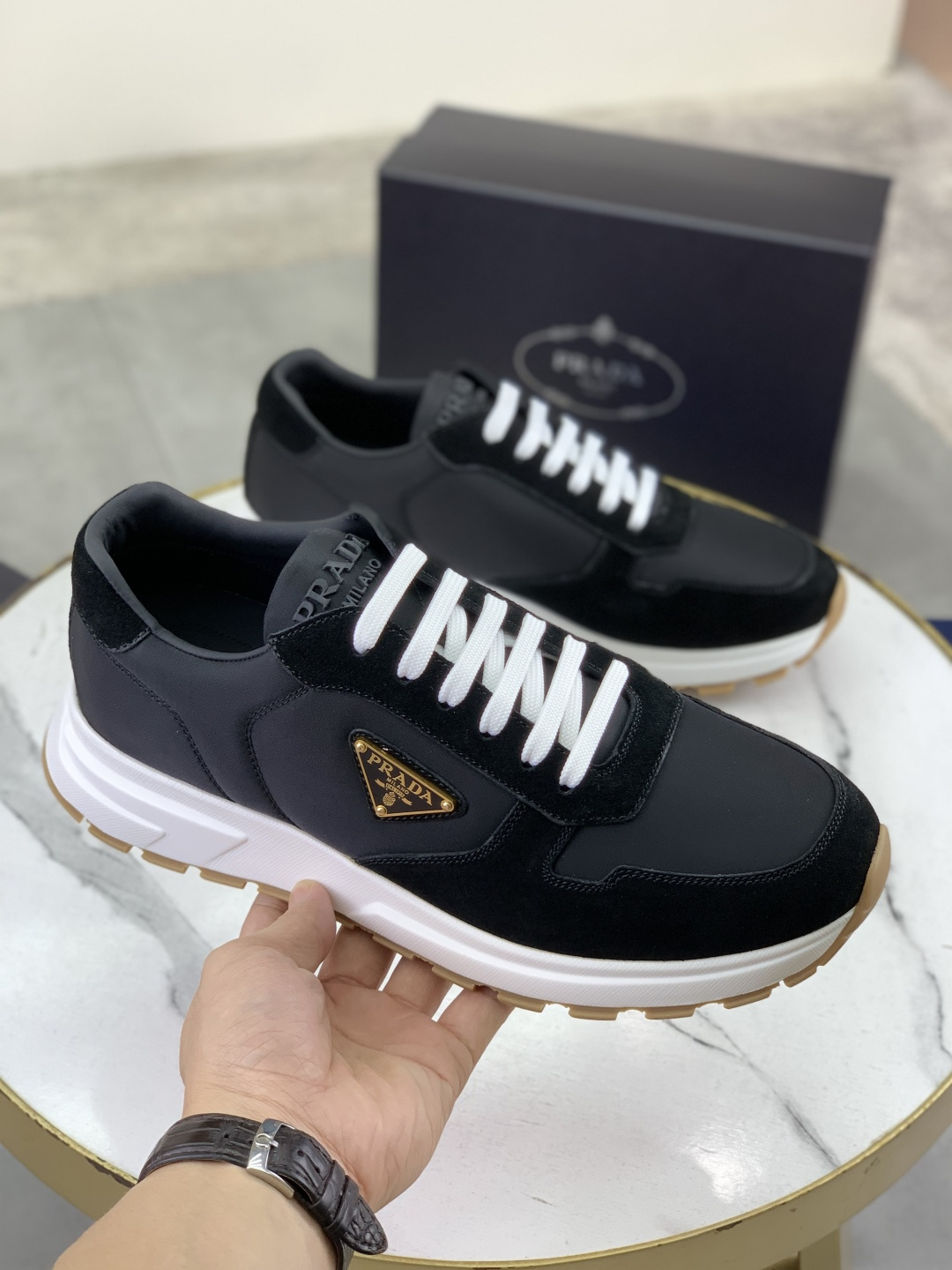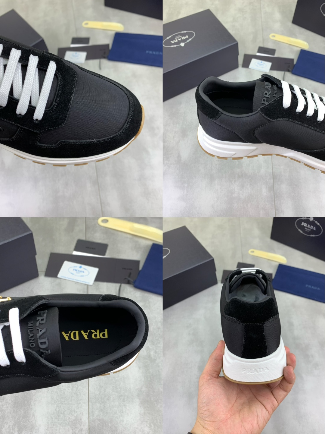 这款鞋子是AAAAA 1:1 质量 (非常棒). 使用了和原版一模一样的材料. 商标部分也保持了和普拉达/Prada一样. 图片拍摄是实物鞋子拍摄, 您所收到的实物保证和我们图片一模一样.