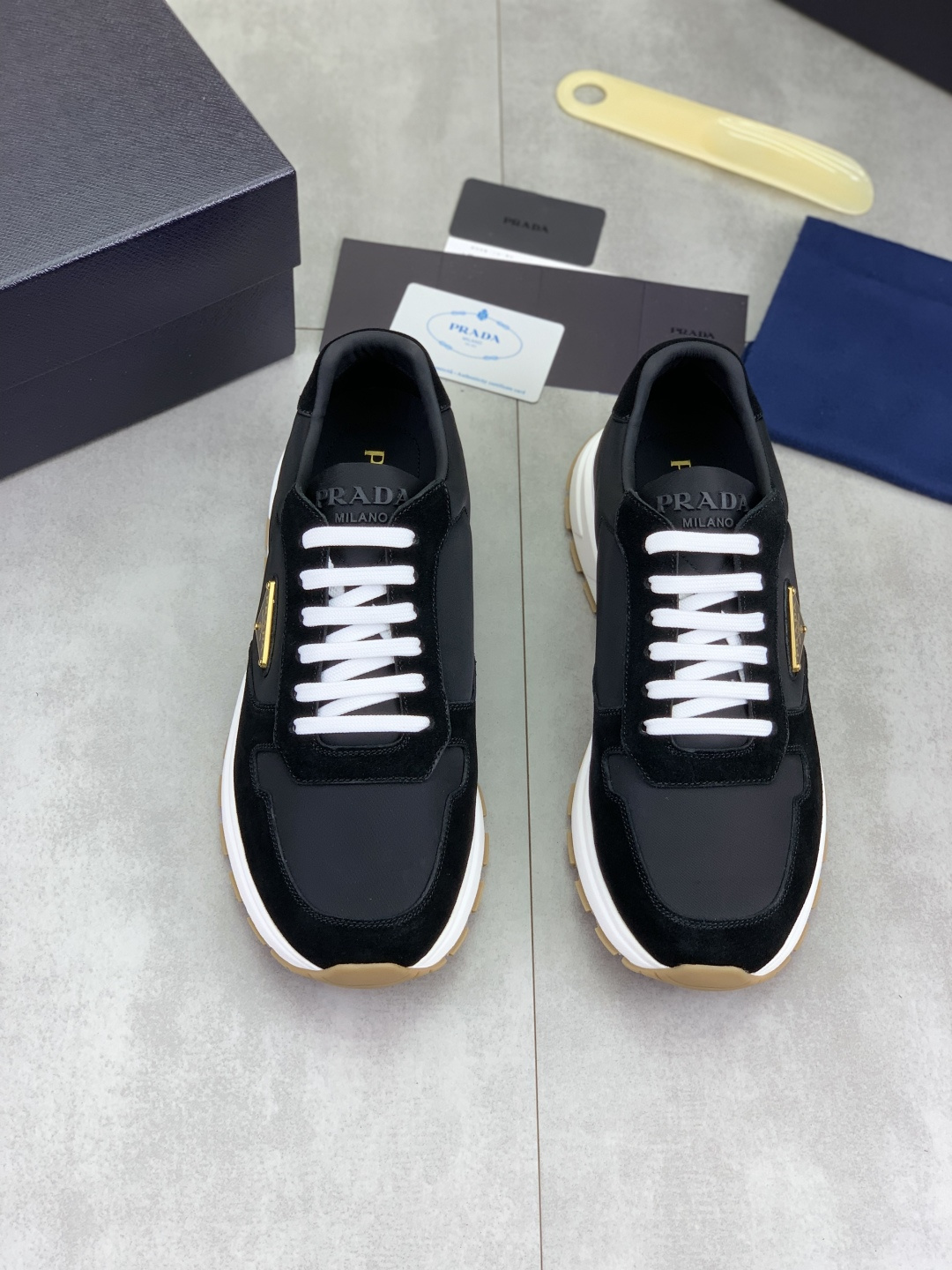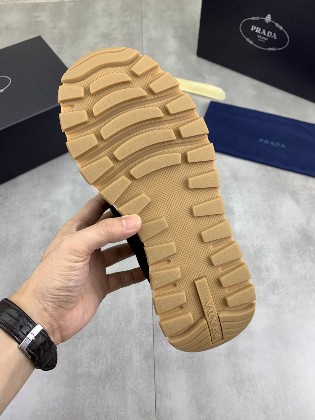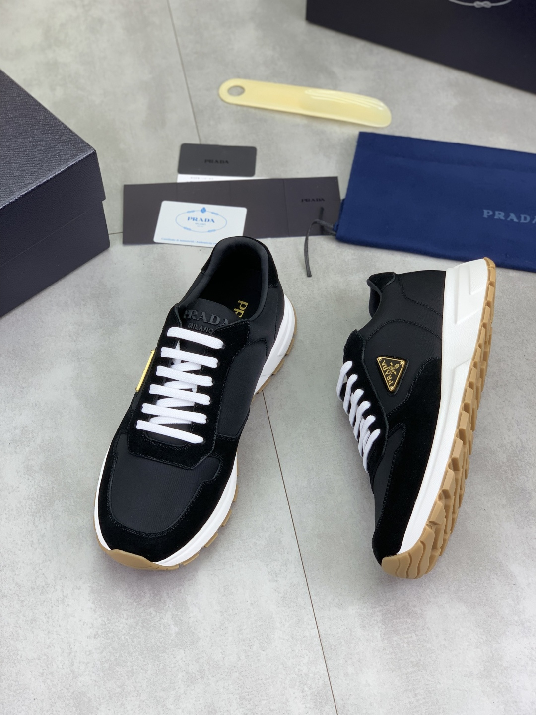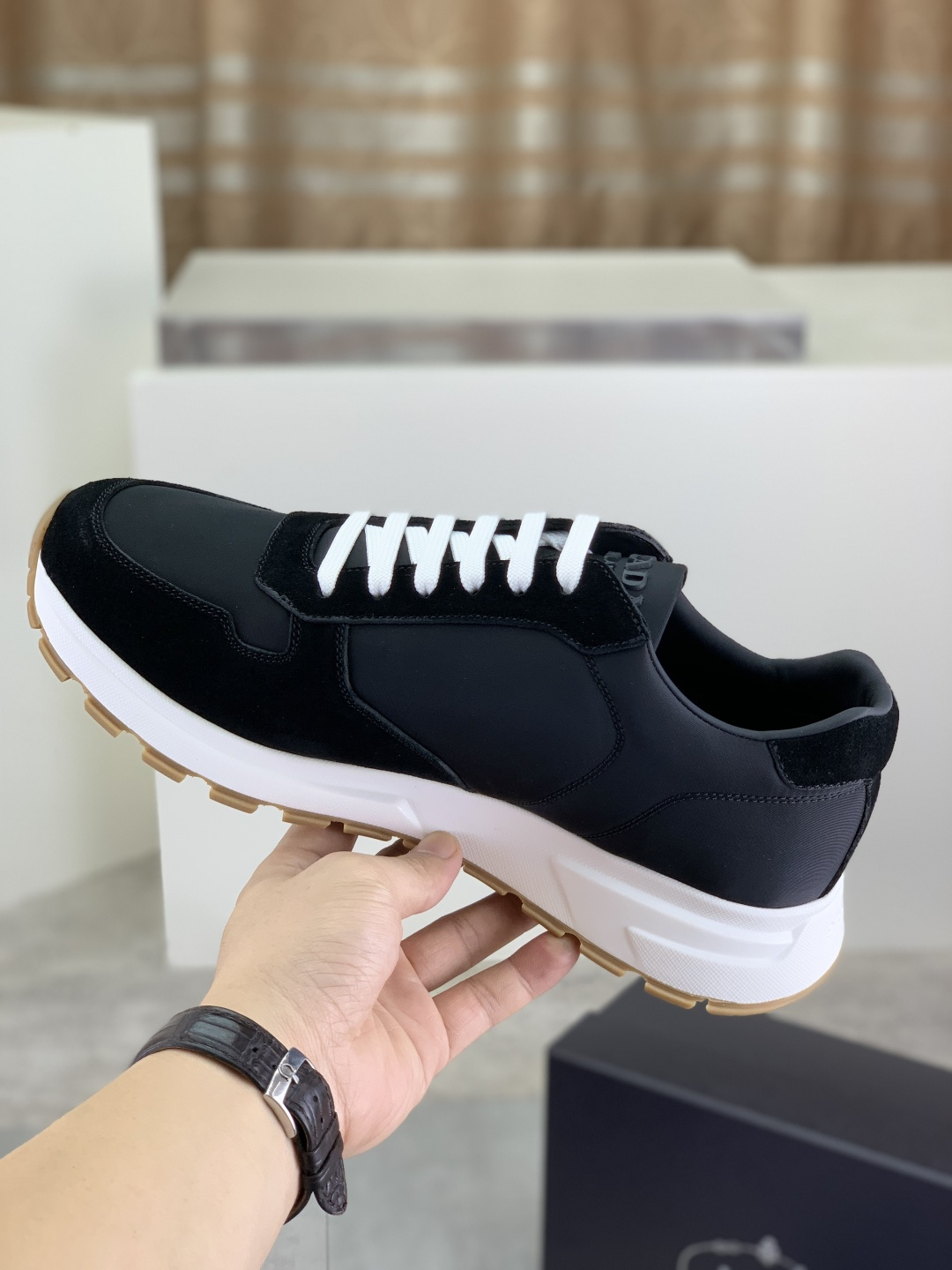 这款鞋子是AAAAA 1:1 质量 (非常棒). 使用了和原版一模一样的材料. 商标部分也保持了和普拉达/Prada一样. 图片拍摄是实物鞋子拍摄, 您所收到的实物保证和我们图片一模一样.