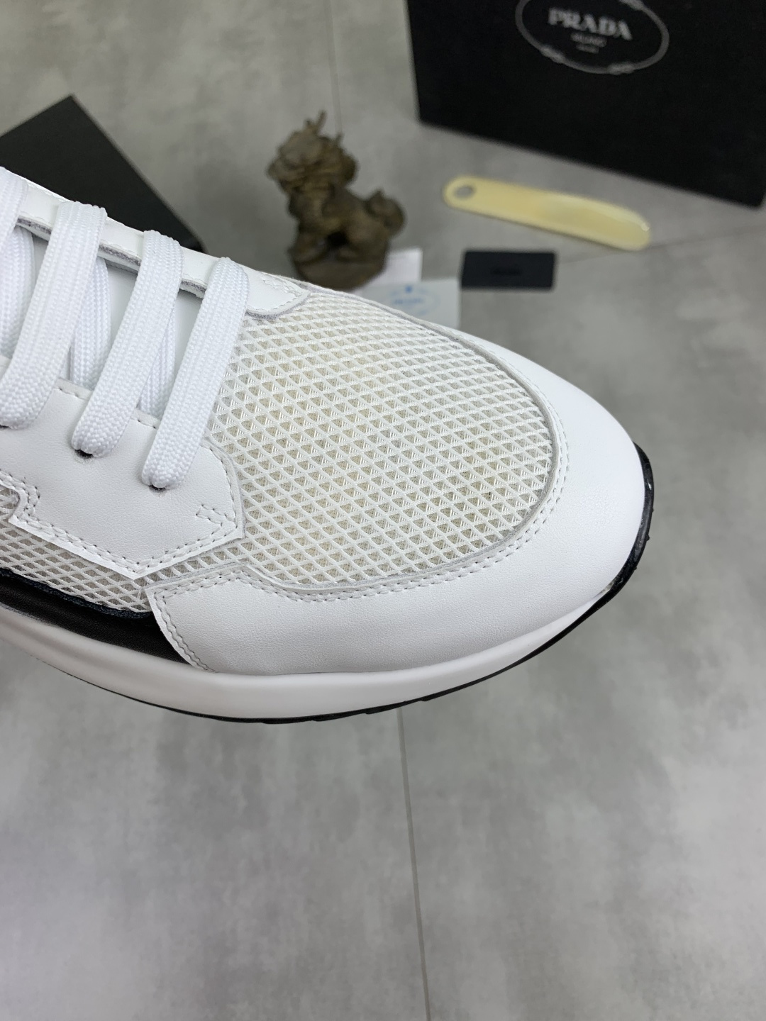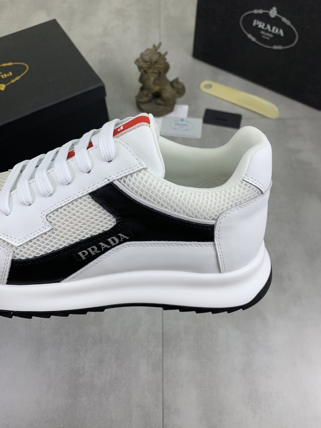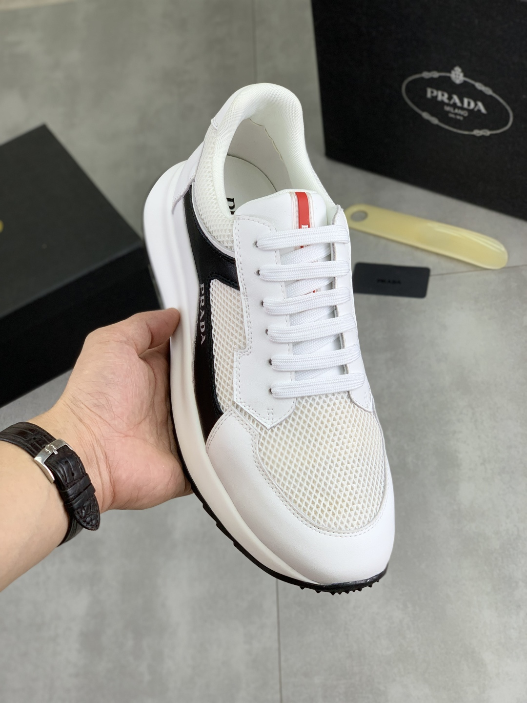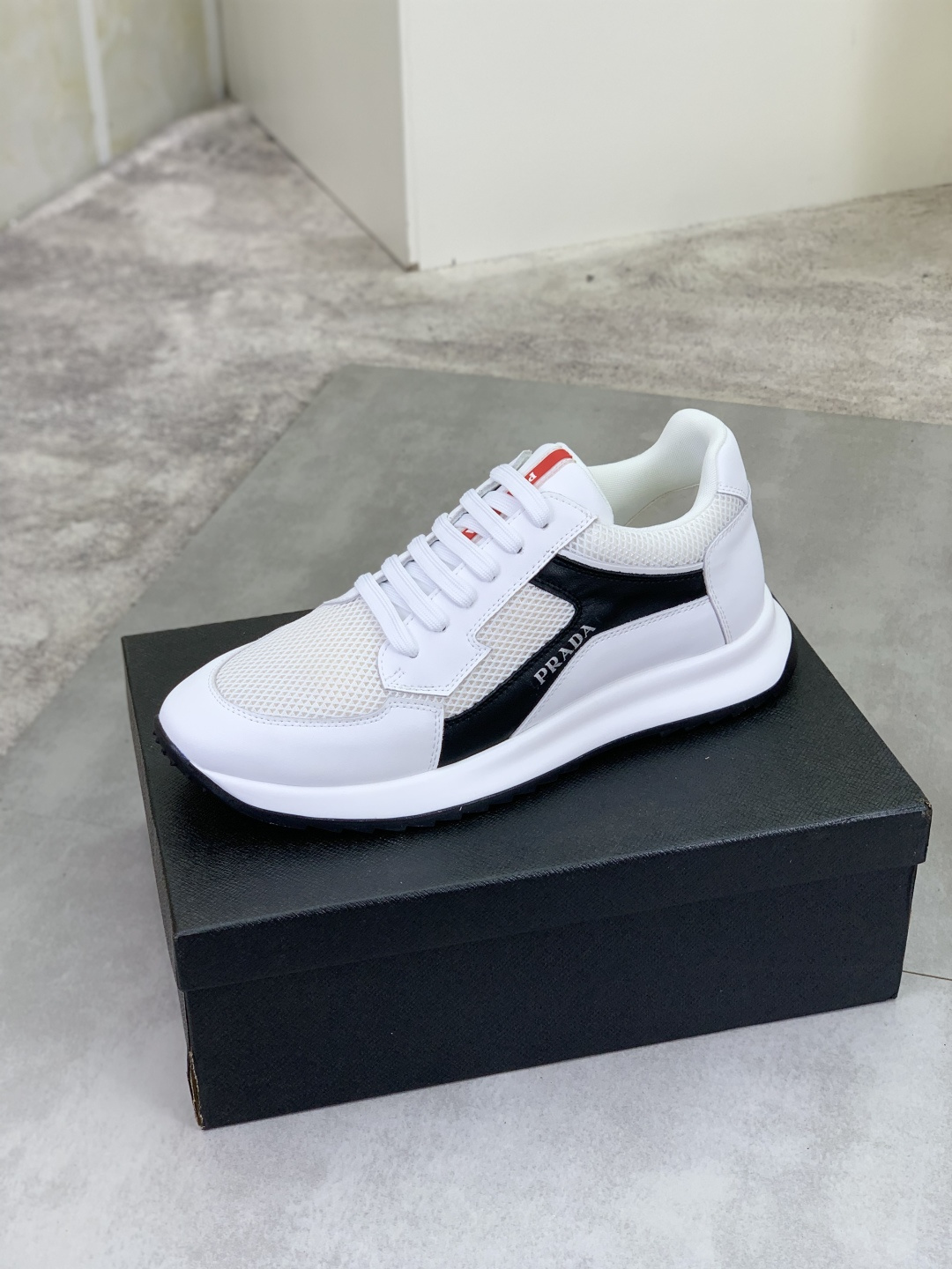 这款鞋子是AAAAA 1:1 质量 (非常棒). 使用了和原版一模一样的材料. 商标部分也保持了和普拉达/Prada一样. 图片拍摄是实物鞋子拍摄, 您所收到的实物保证和我们图片一模一样.