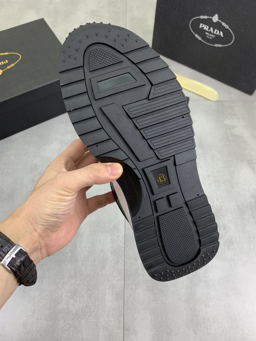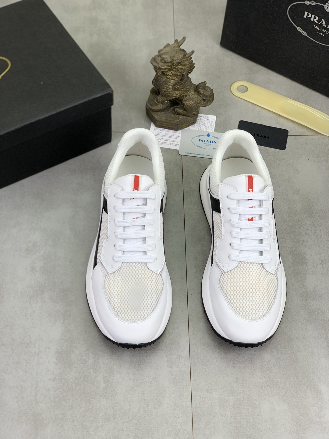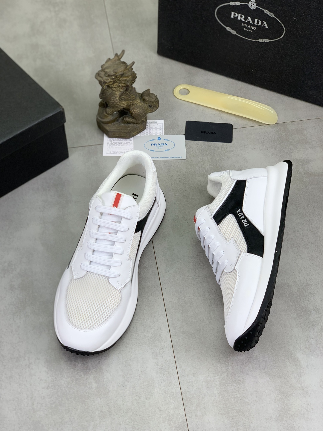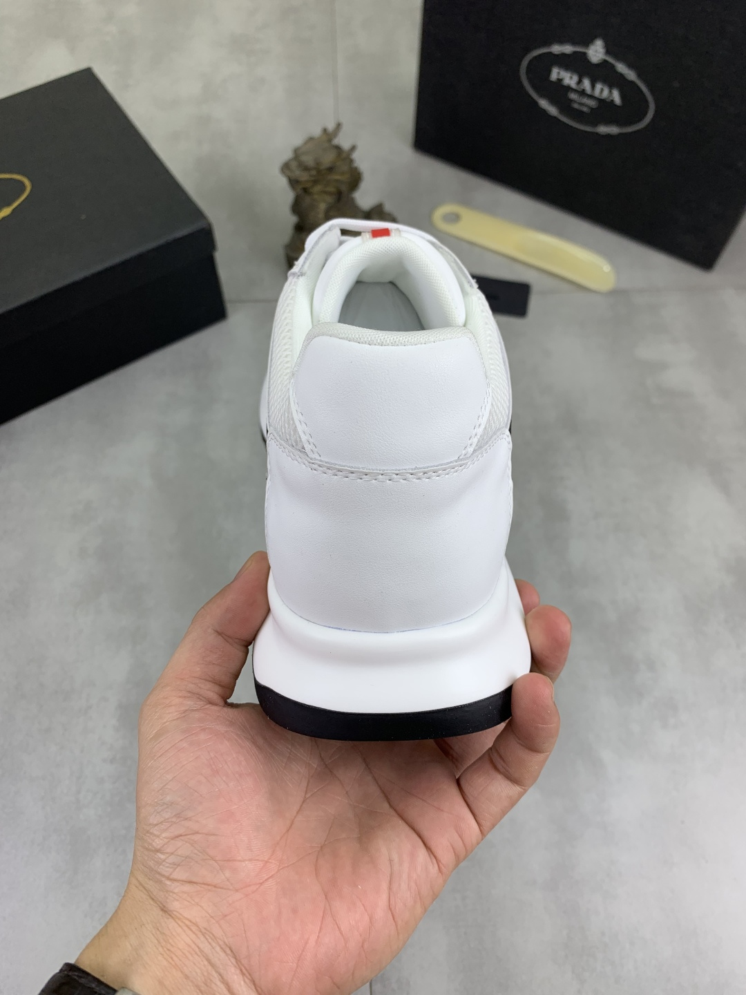 这款鞋子是AAAAA 1:1 质量 (非常棒). 使用了和原版一模一样的材料. 商标部分也保持了和普拉达/Prada一样. 图片拍摄是实物鞋子拍摄, 您所收到的实物保证和我们图片一模一样.