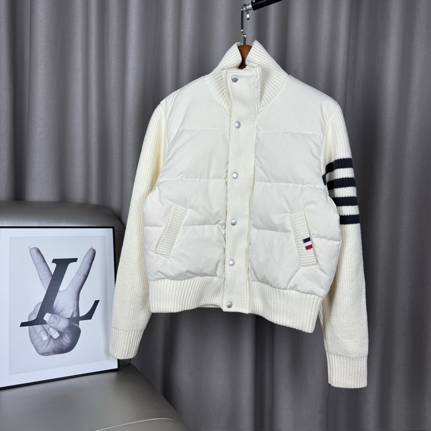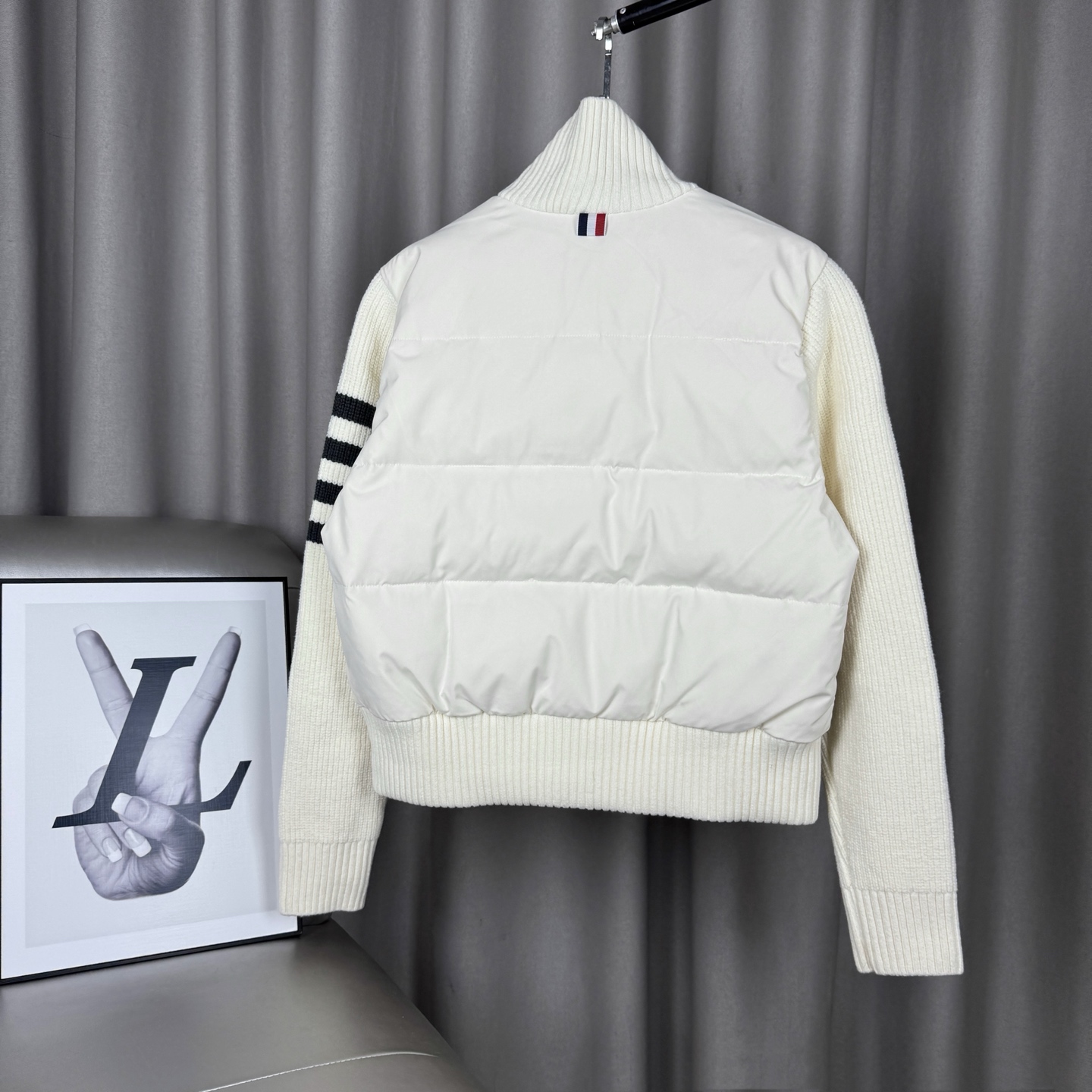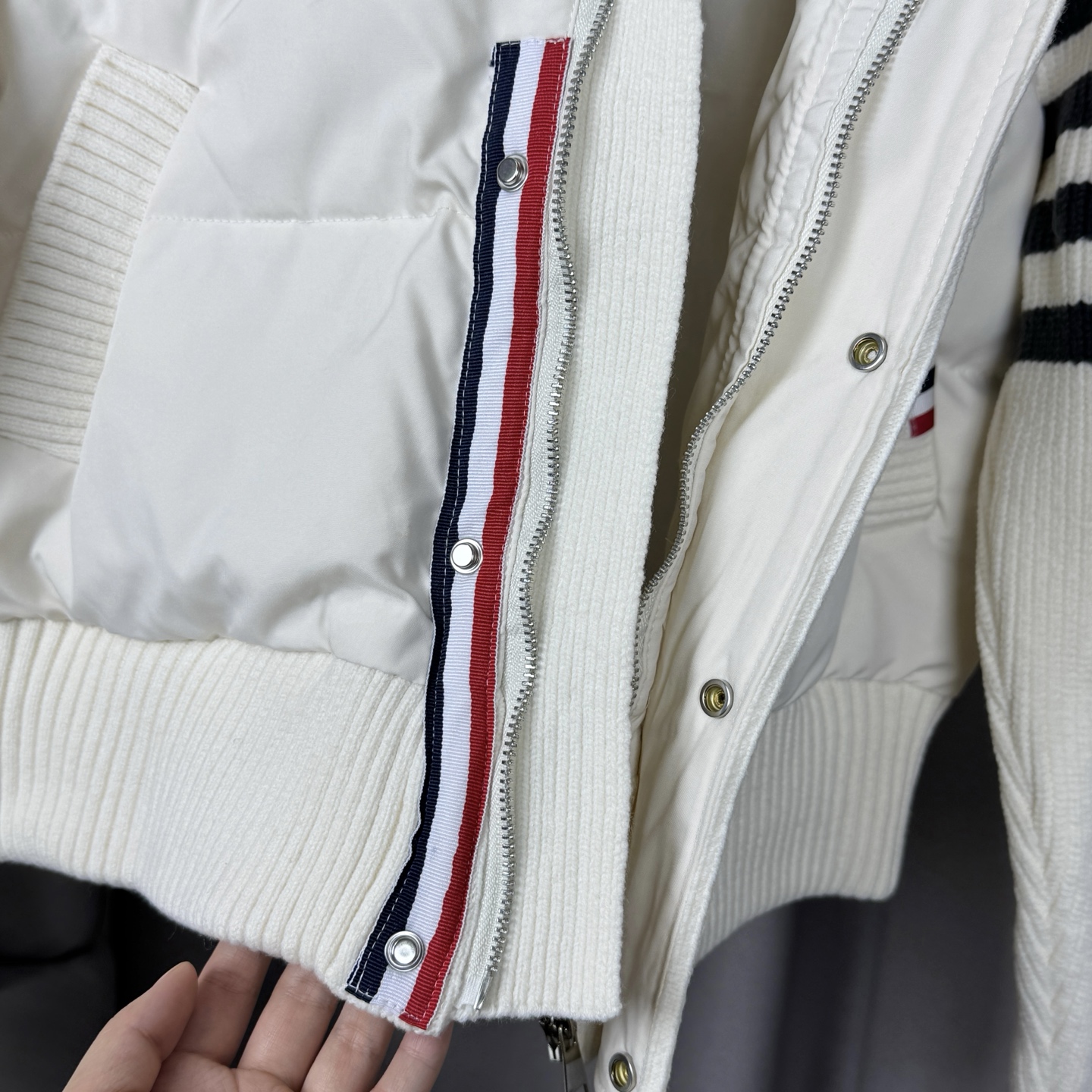 这款衣服是AAAAA 1:1 质量 (非常棒). 使用了和原版一模一样的材料. 商标部分也保持了和汤姆布朗/Thom Browne一样. 图片拍摄是实物衣服拍摄, 您所收到的实物保证和我们图片一模一样.