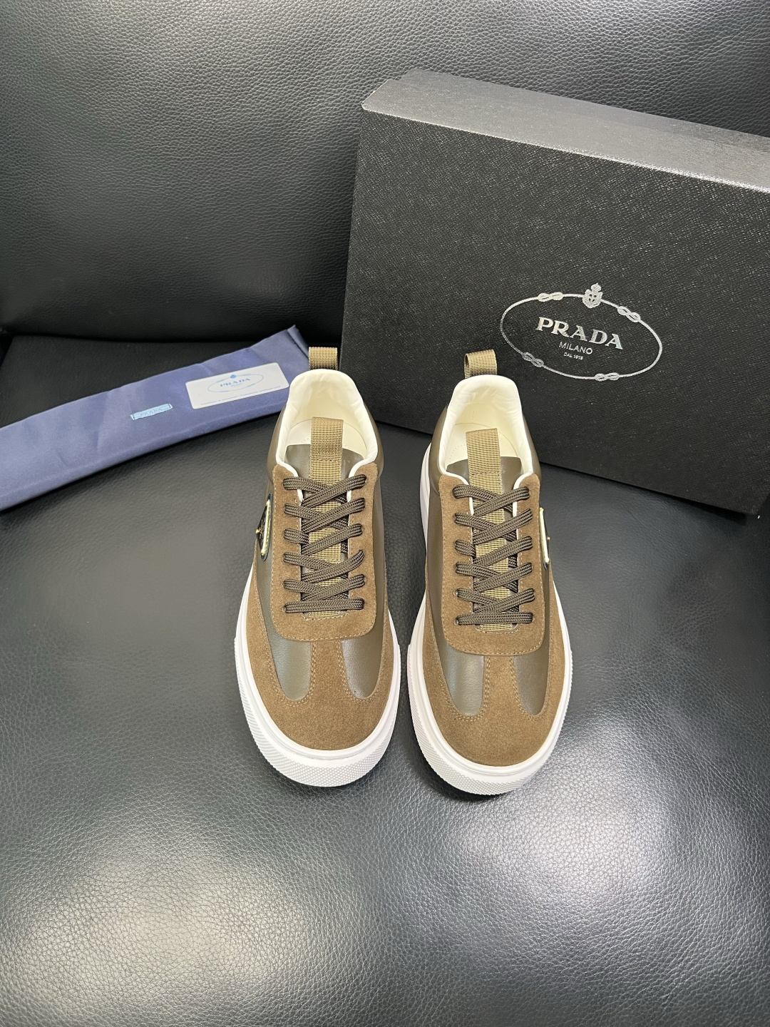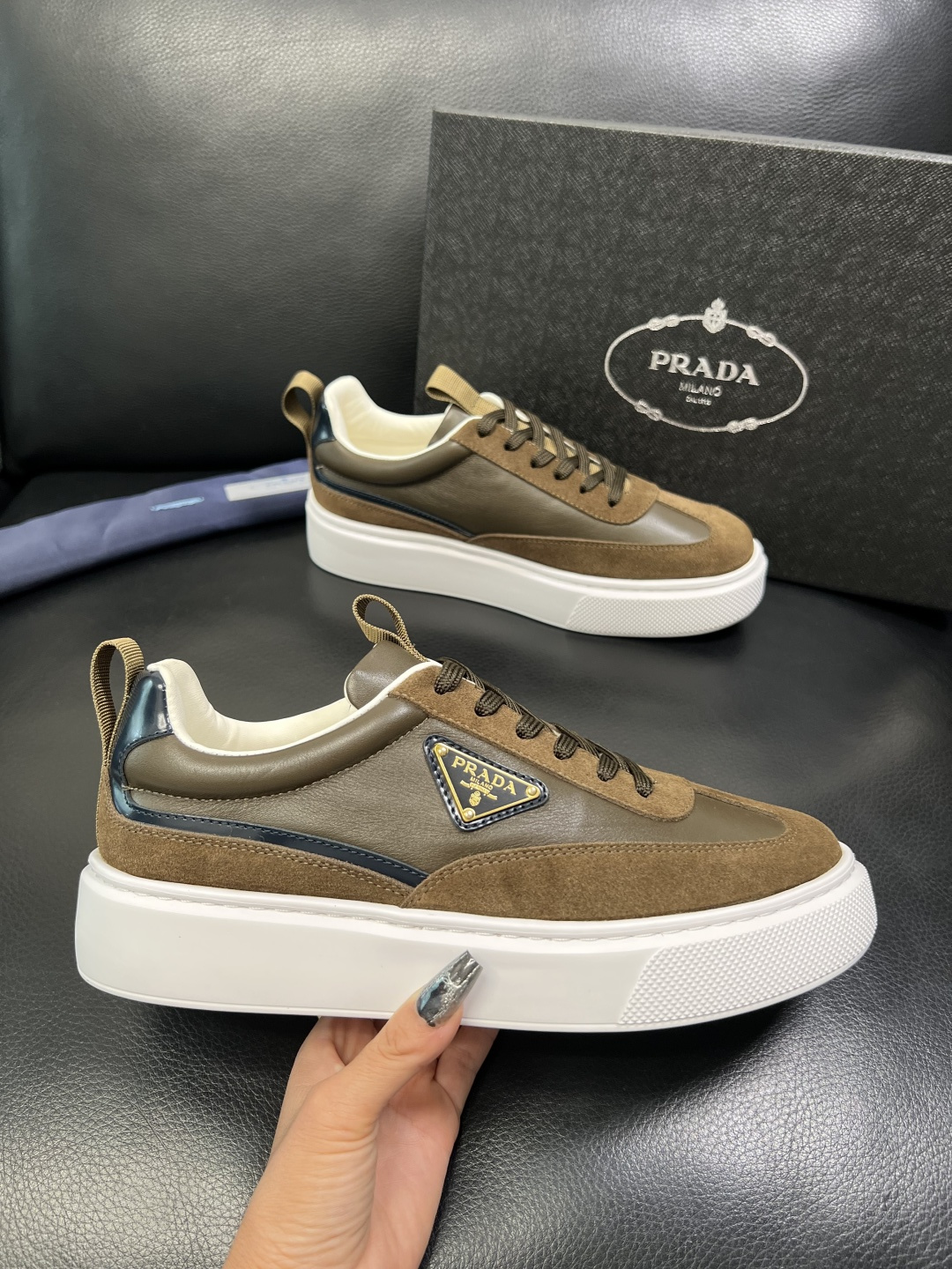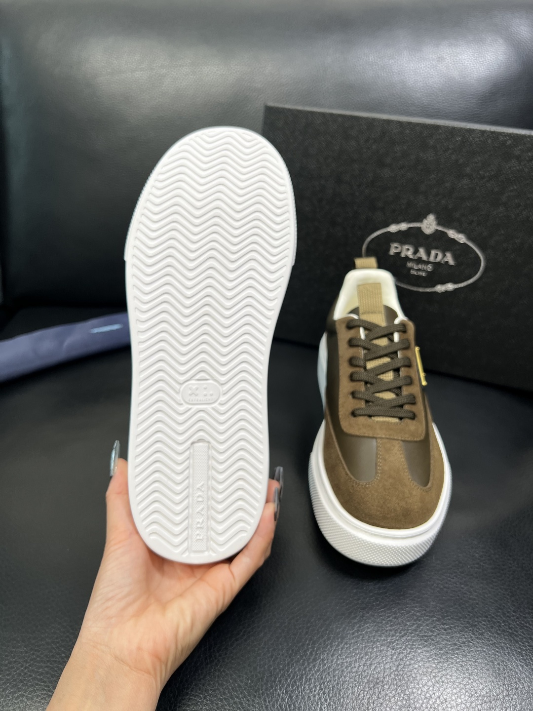 这款鞋子是AAAAA 1:1 质量 (非常棒). 使用了和原版一模一样的材料. 商标部分也保持了和普拉达/Prada一样. 图片拍摄是实物鞋子拍摄, 您所收到的实物保证和我们图片一模一样.