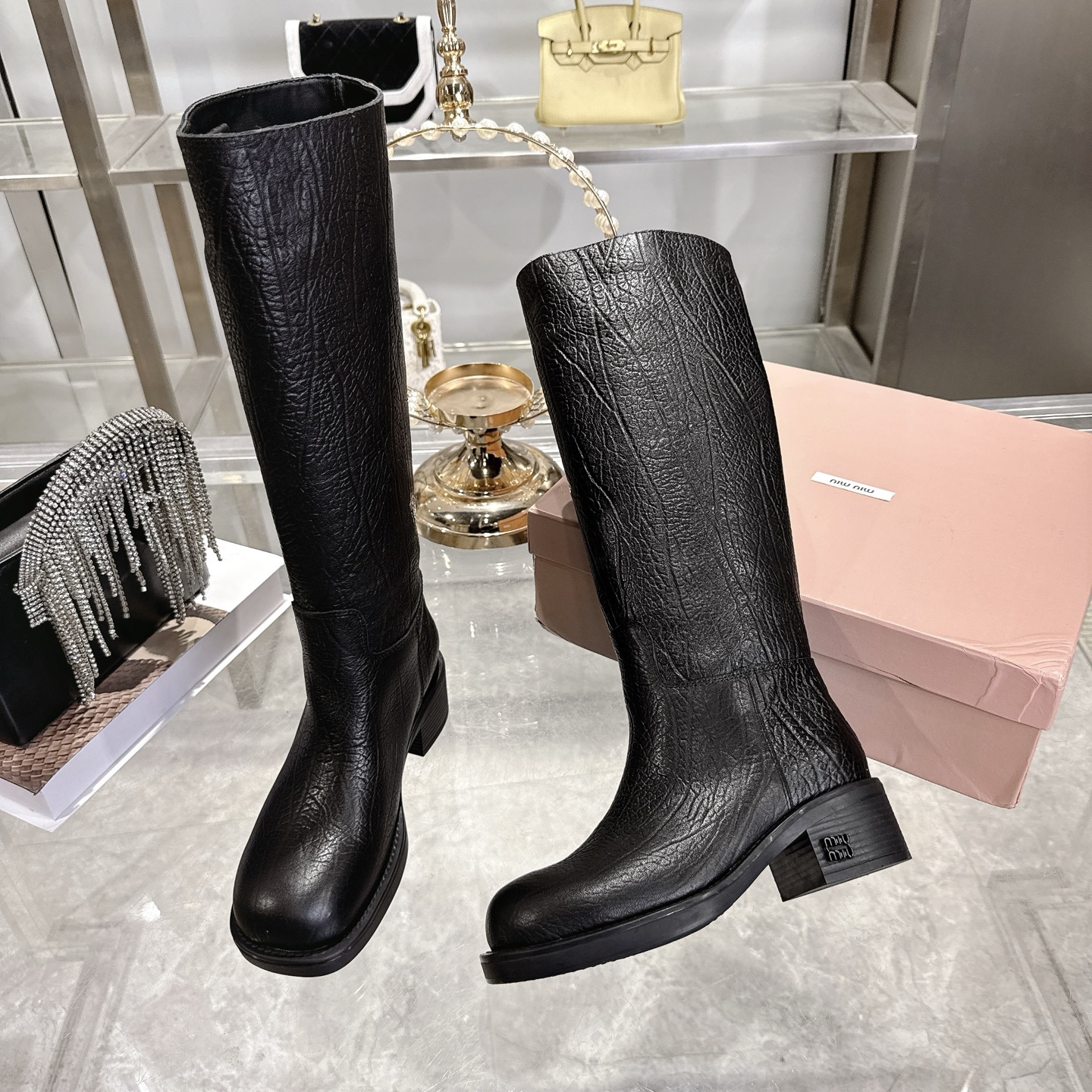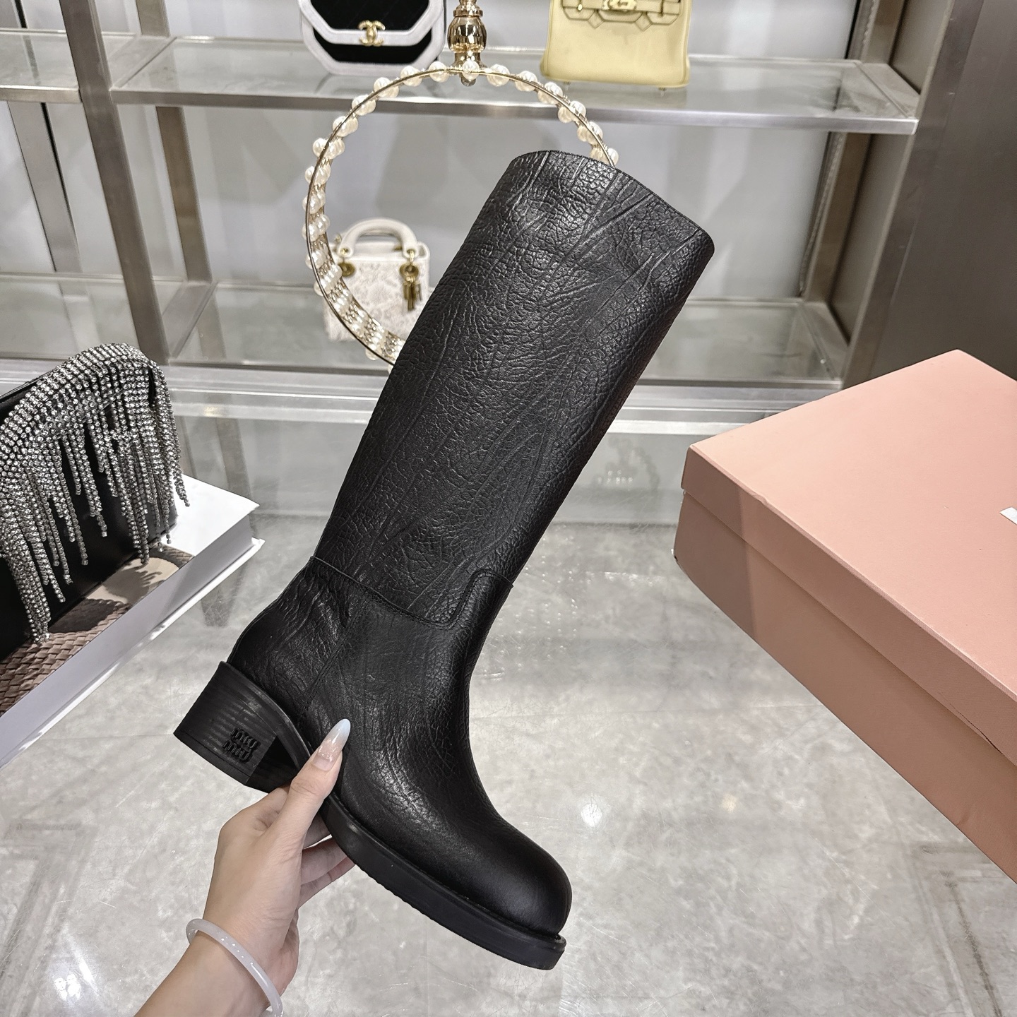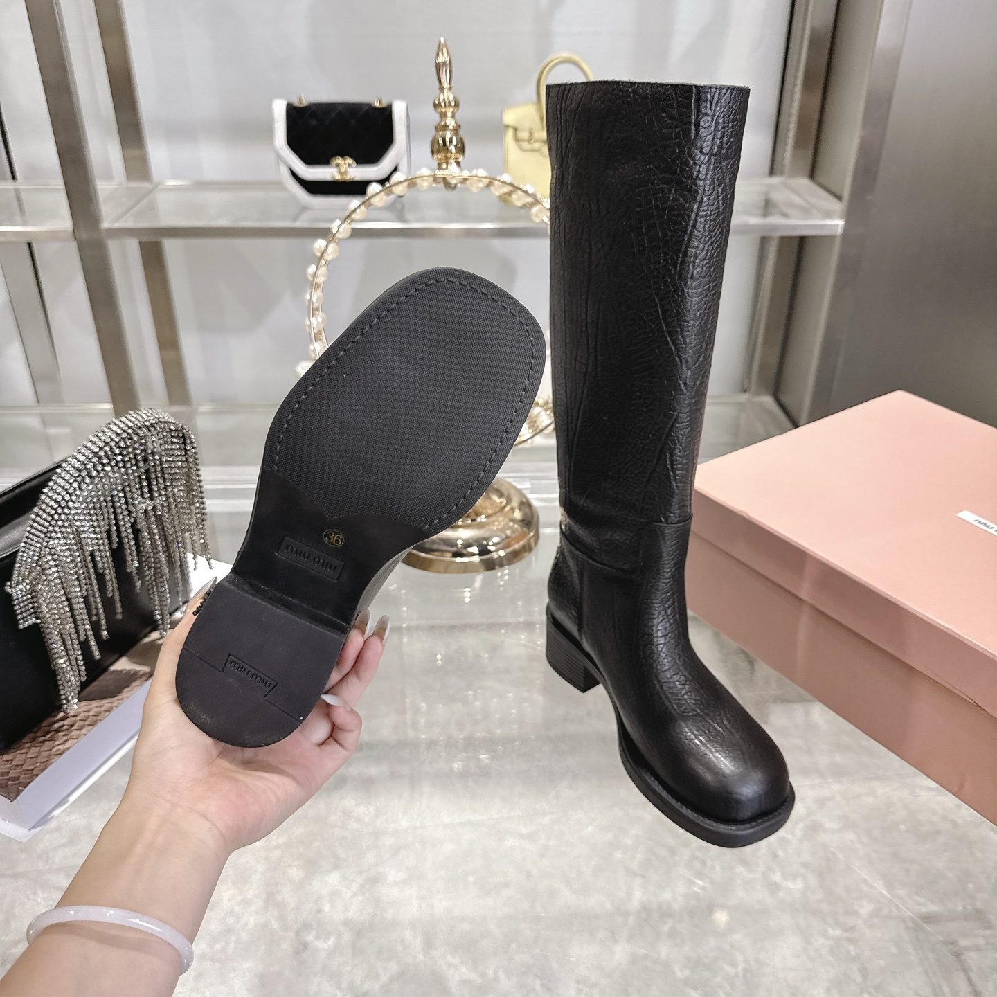这款鞋子是AAAAA 1:1 质量 (非常棒). 使用了和原版一模一样的材料. 商标部分也保持了和缪缪/Miu Miu一样. 图片拍摄是实物鞋子拍摄, 您所收到的实物保证和我们图片一模一样.