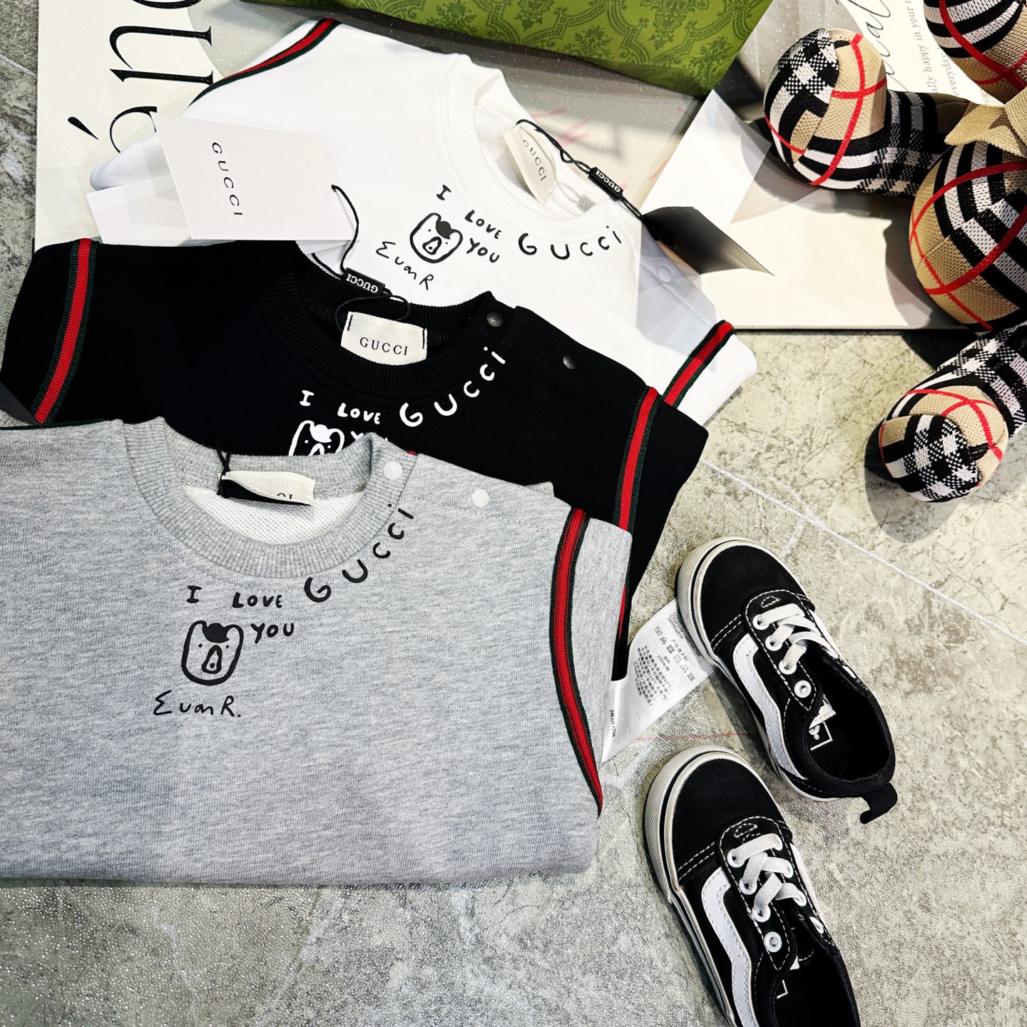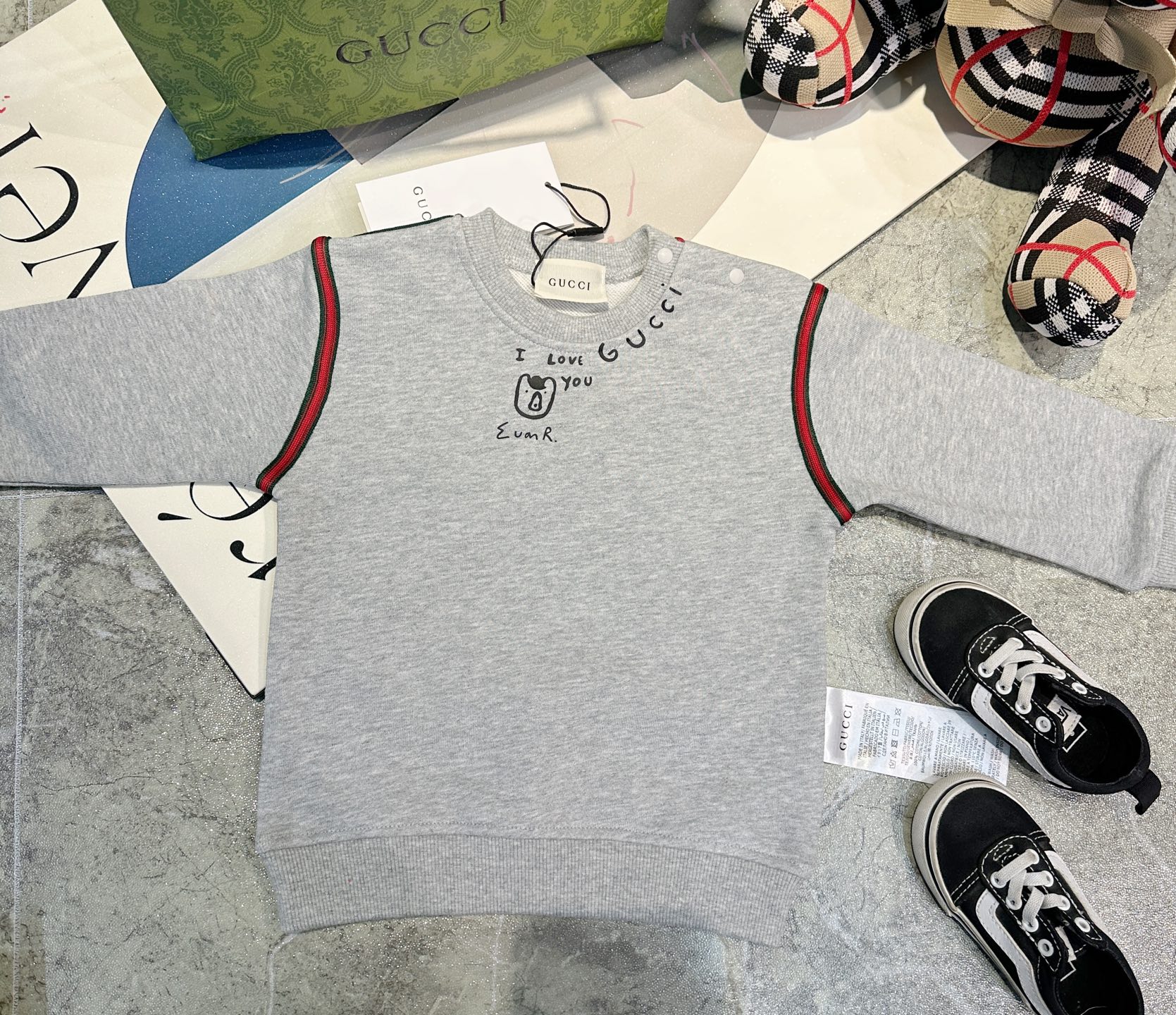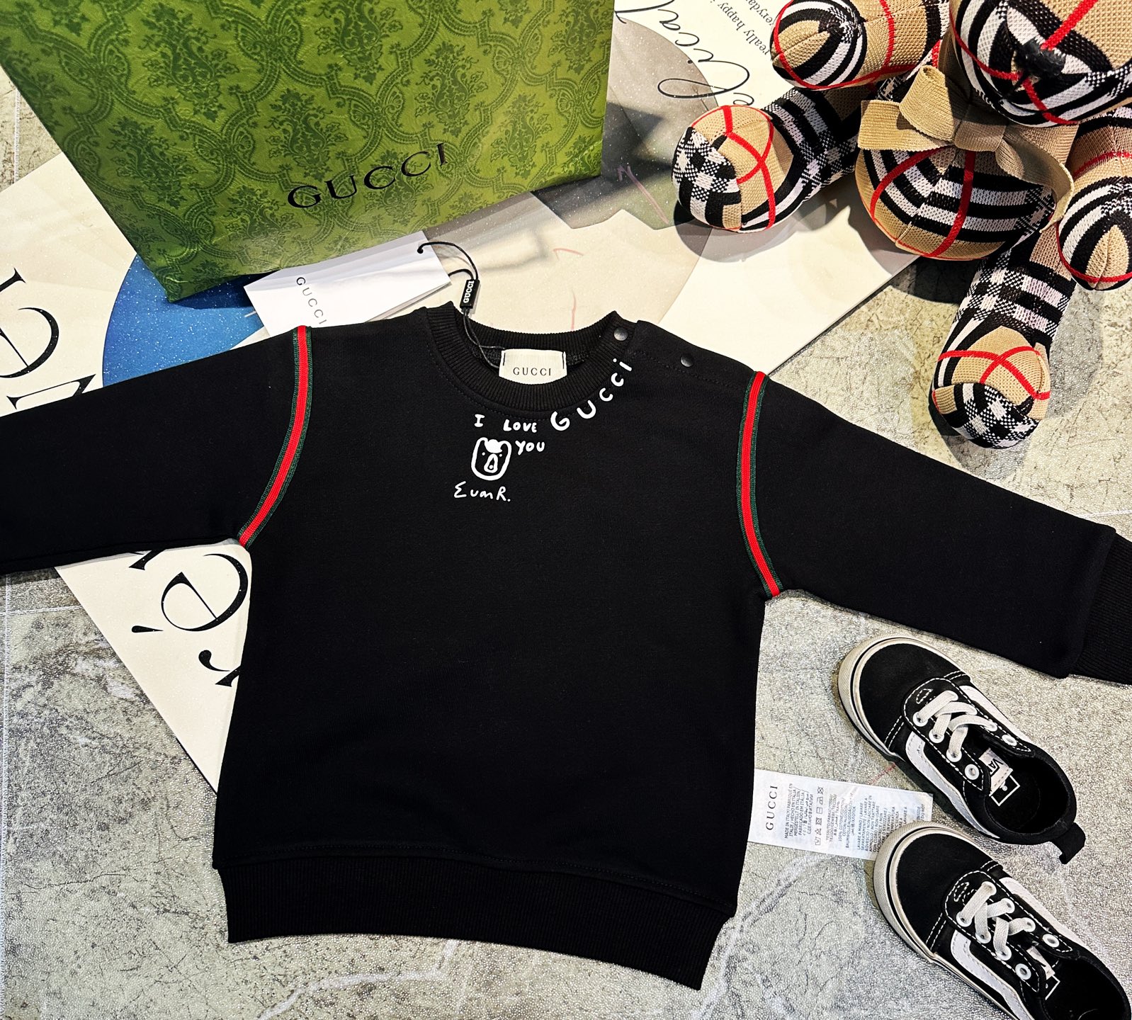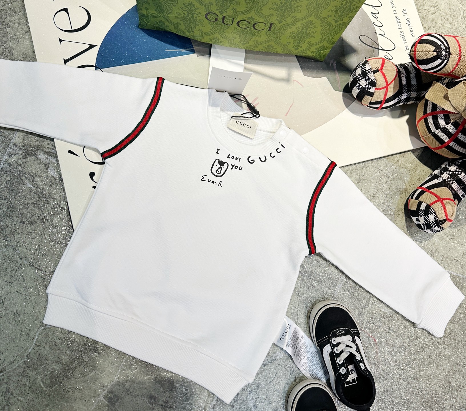 这款children's clothes是AAAAA 1:1 质量 (非常棒). 使用了和原版一模一样的材料. 商标部分也保持了和古奇/Gucci一样. 图片拍摄是实物children's clothes拍摄, 您所收到的实物保证和我们图片一模一样.