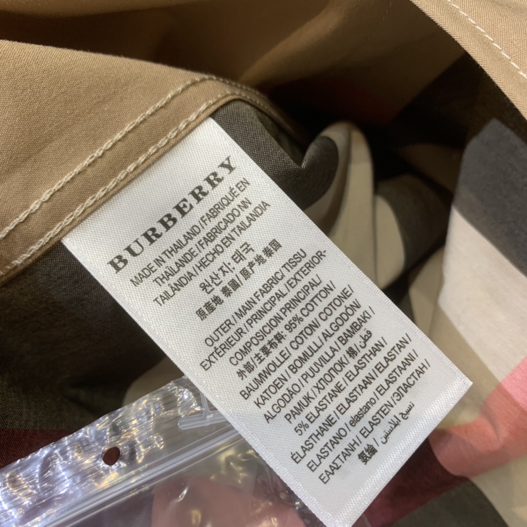 这款衣服是AAAAA 1:1 质量 (非常棒). 使用了和原版一模一样的材料. 商标部分也保持了和巴宝莉/Burberry一样. 图片拍摄是实物衣服拍摄, 您所收到的实物保证和我们图片一模一样.