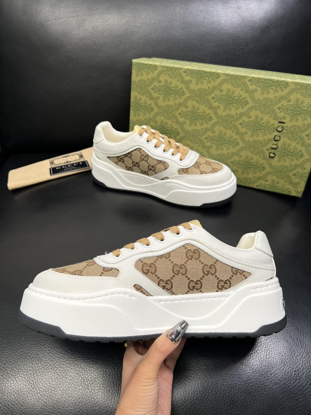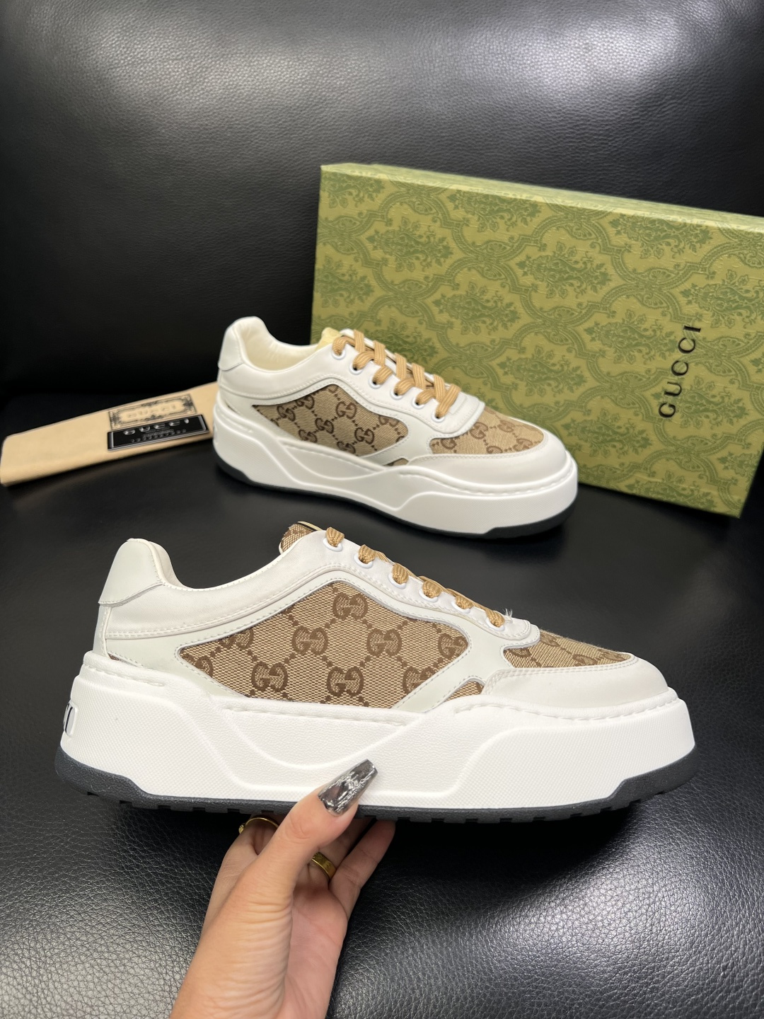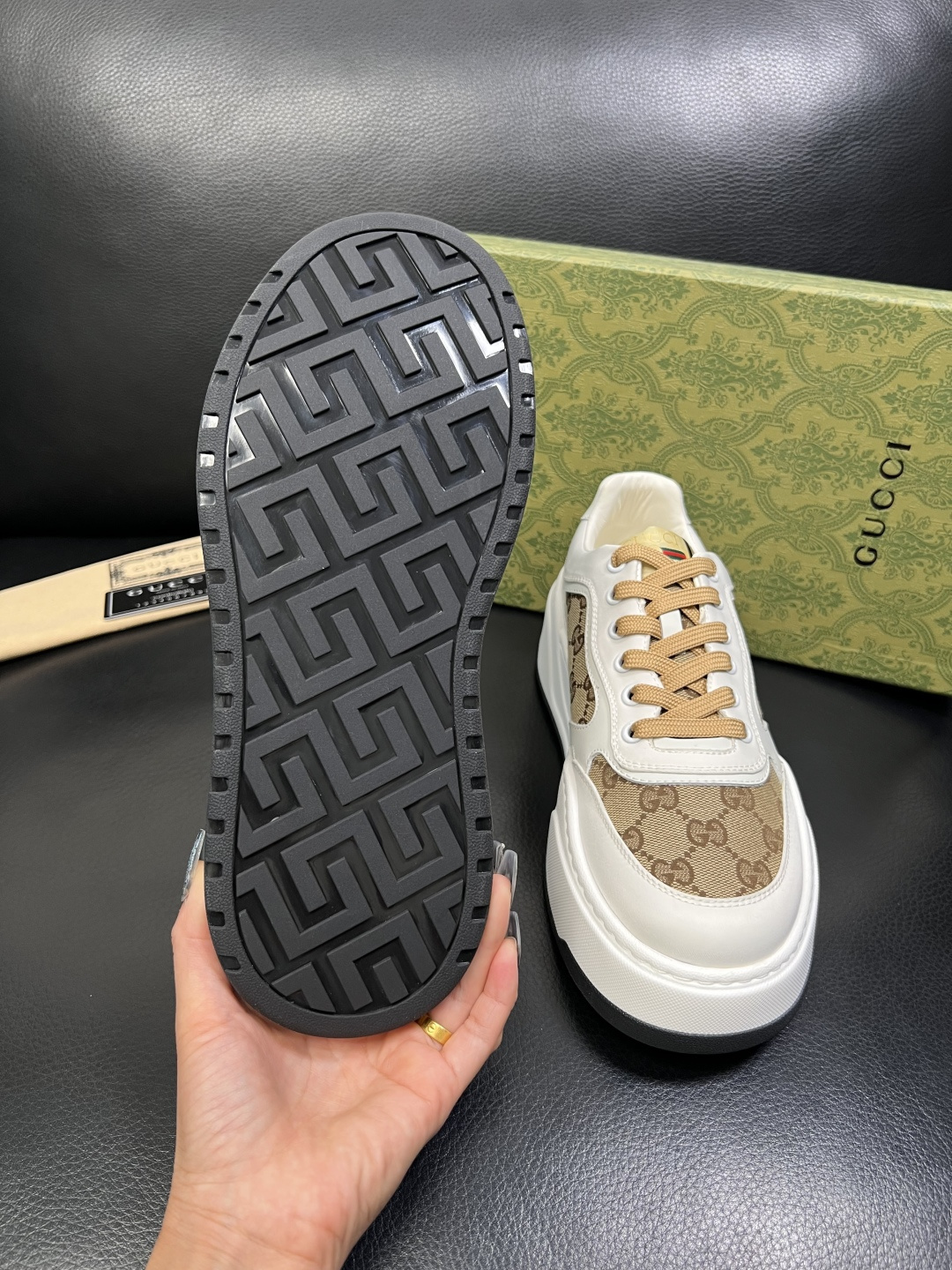 这款鞋子是AAAAA 1:1 质量 (非常棒). 使用了和原版一模一样的材料. 商标部分也保持了和古奇/Gucci一样. 图片拍摄是实物鞋子拍摄, 您所收到的实物保证和我们图片一模一样.