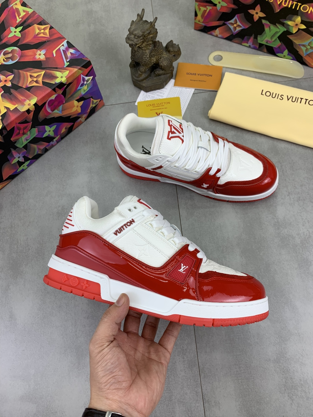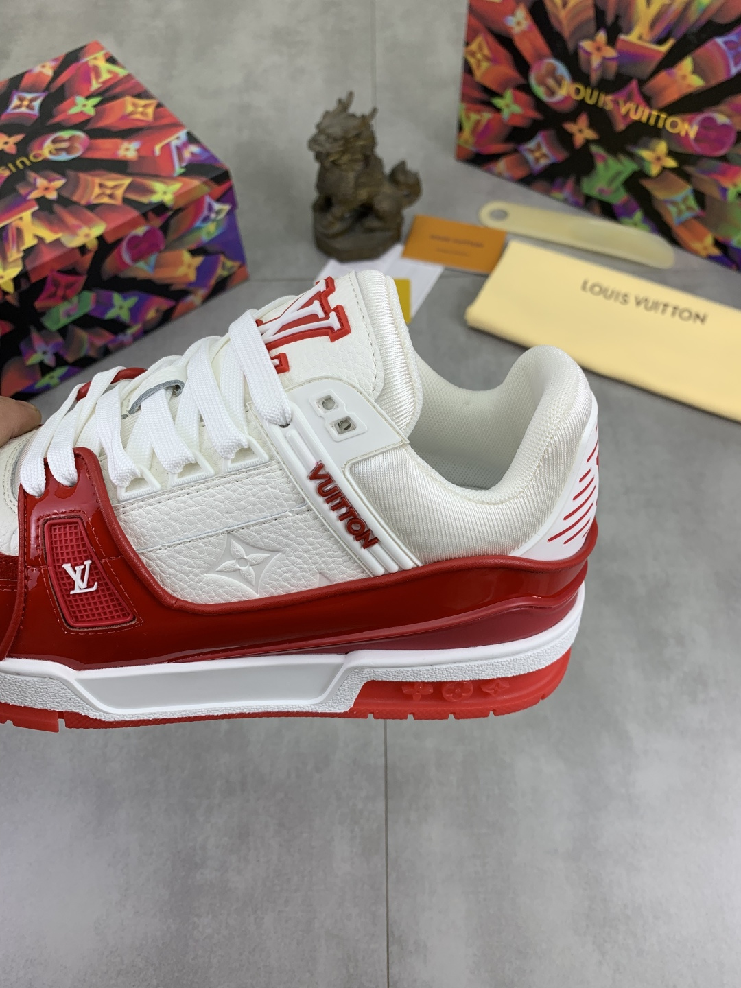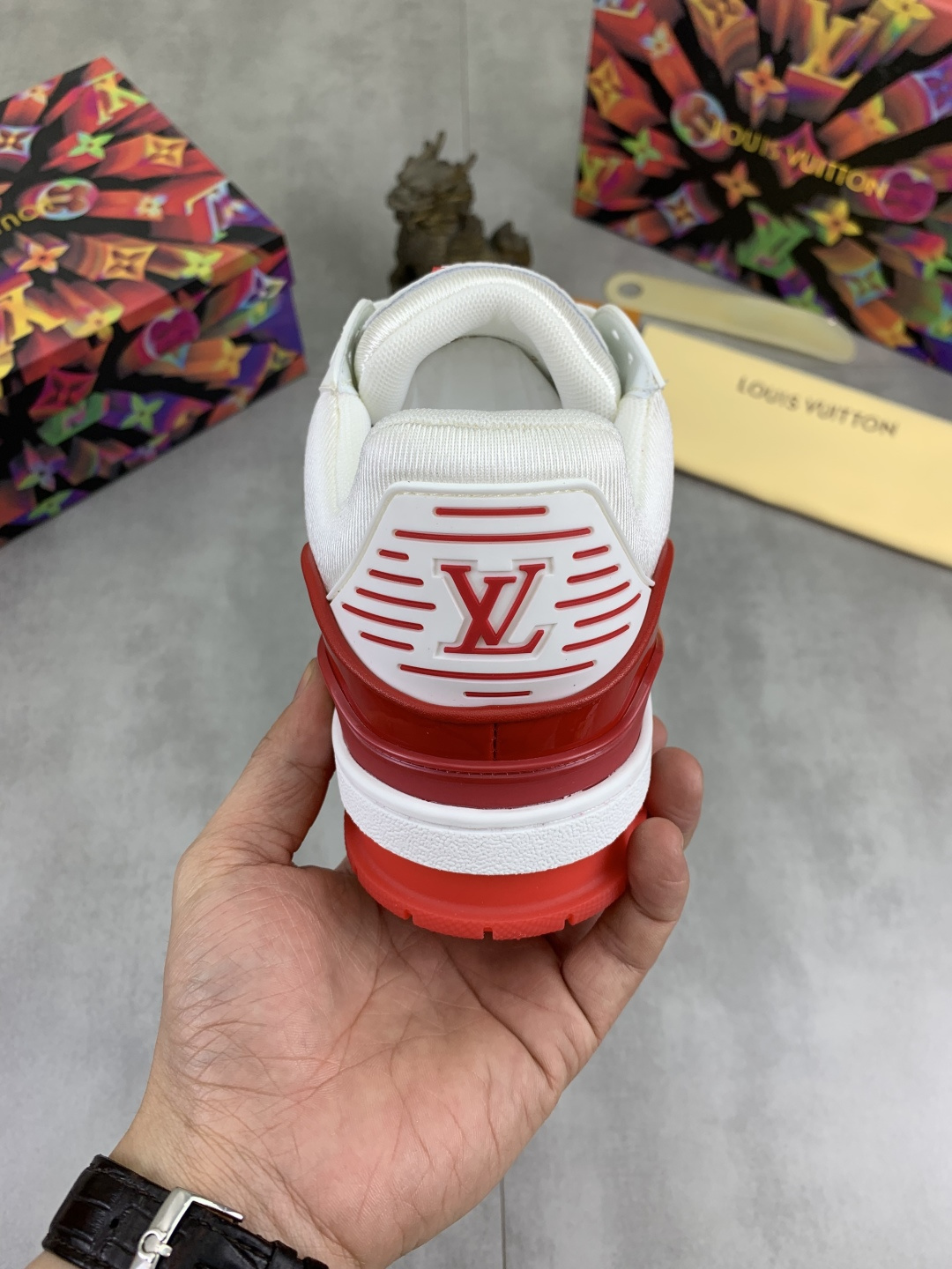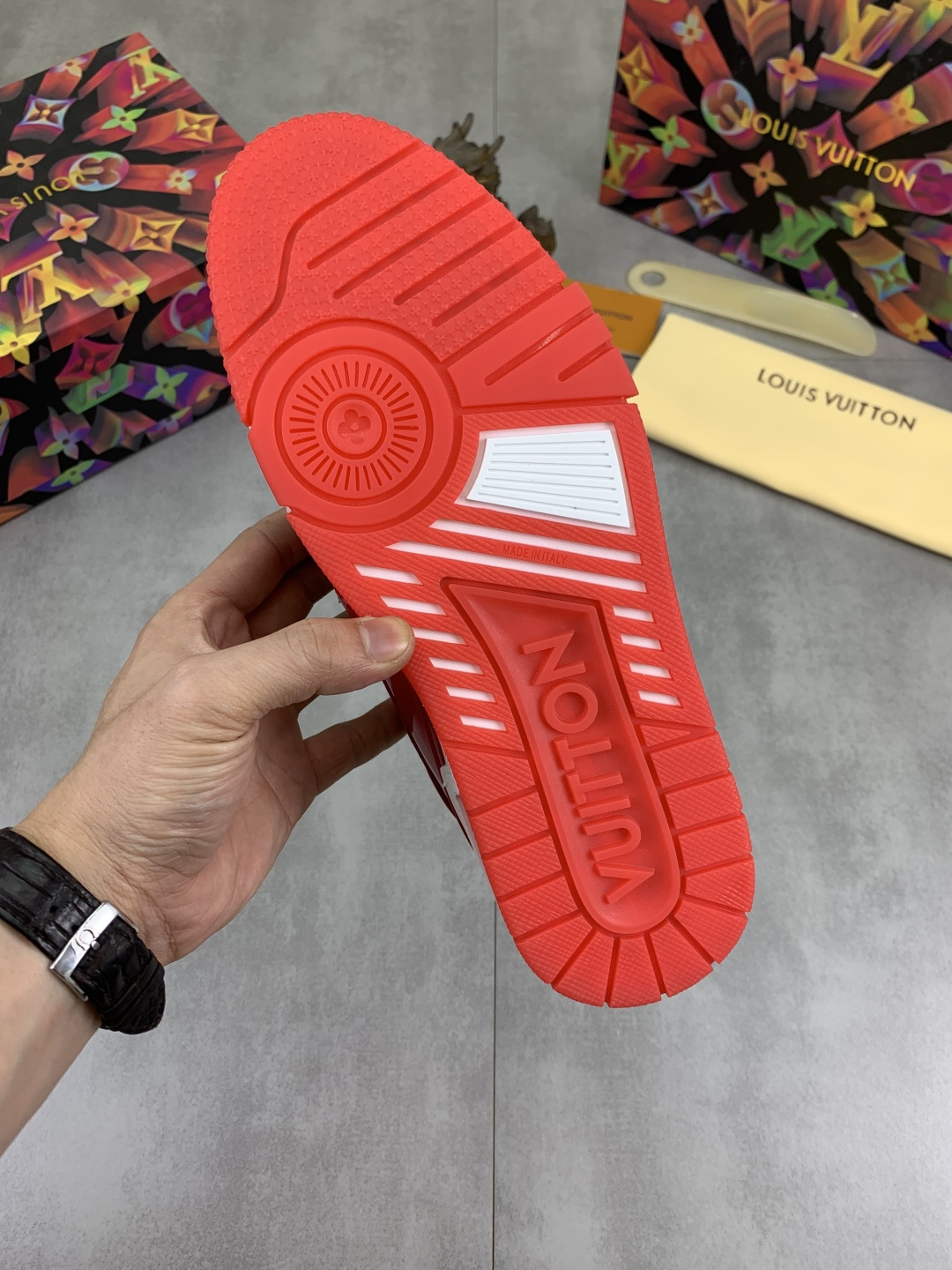 这款鞋子是AAAAA 1:1 质量 (非常棒). 使用了和原版一模一样的材料. 商标部分也保持了和路易威登/Louis Vuitton一样. 图片拍摄是实物鞋子拍摄, 您所收到的实物保证和我们图片一模一样.