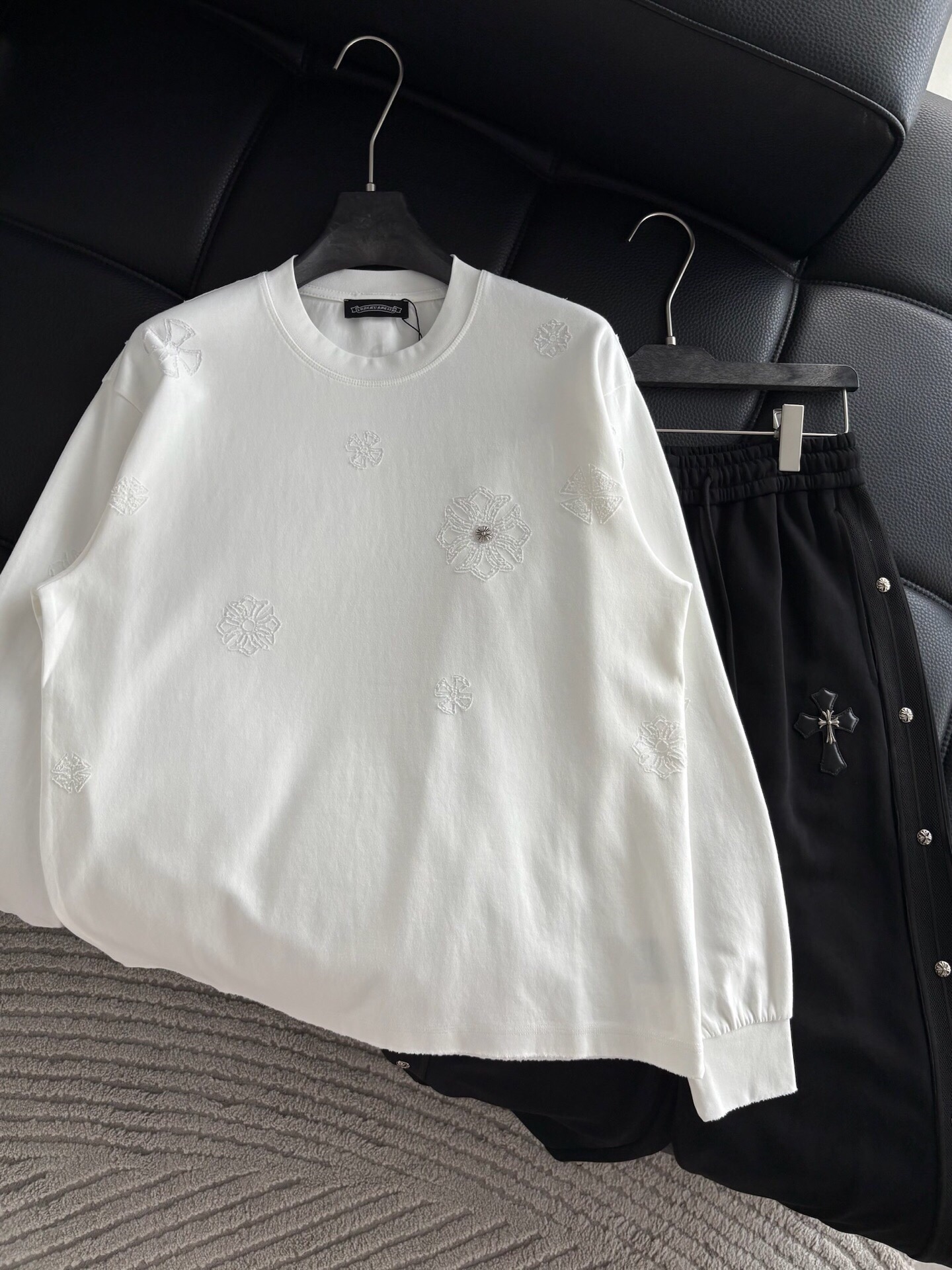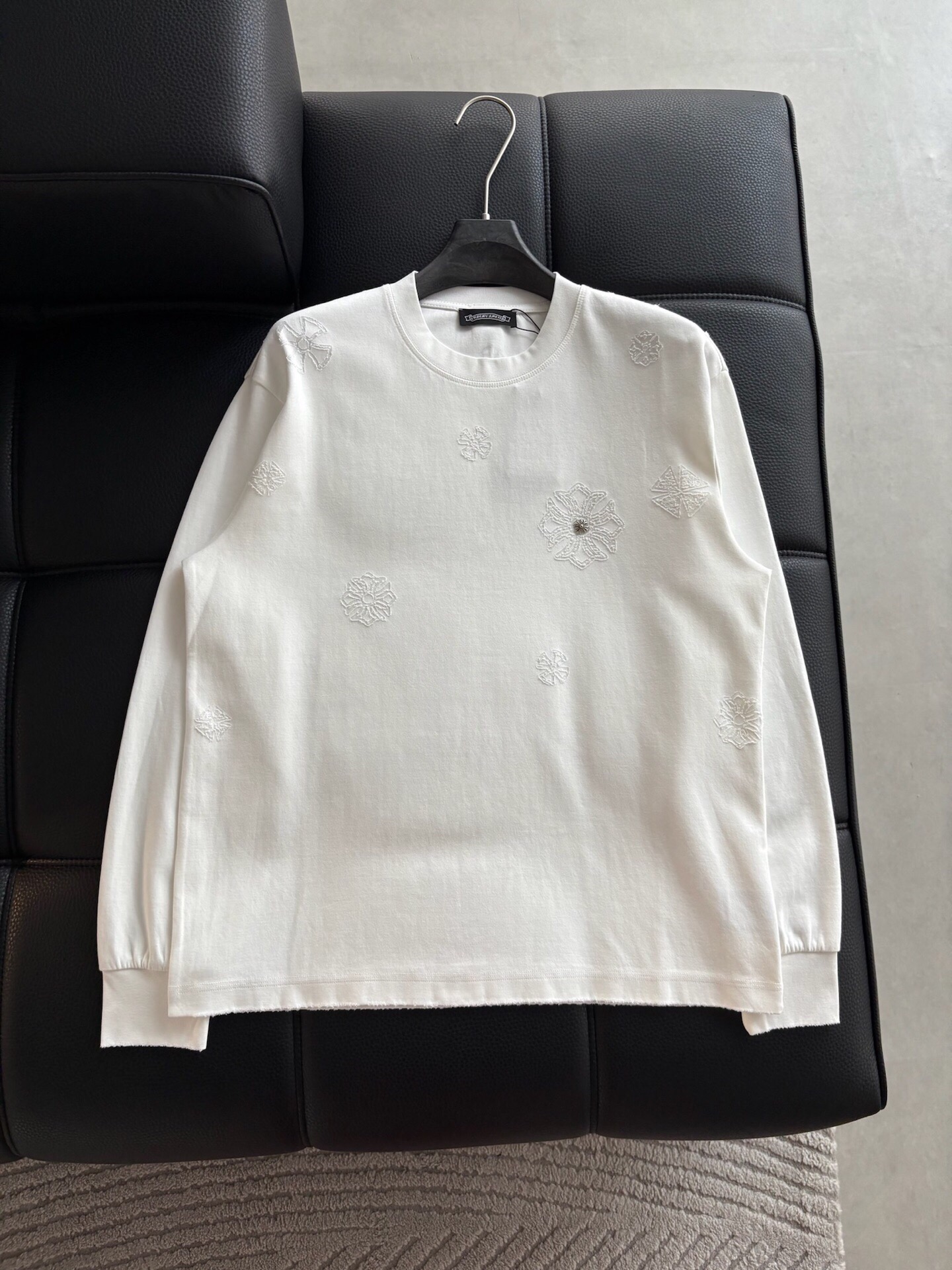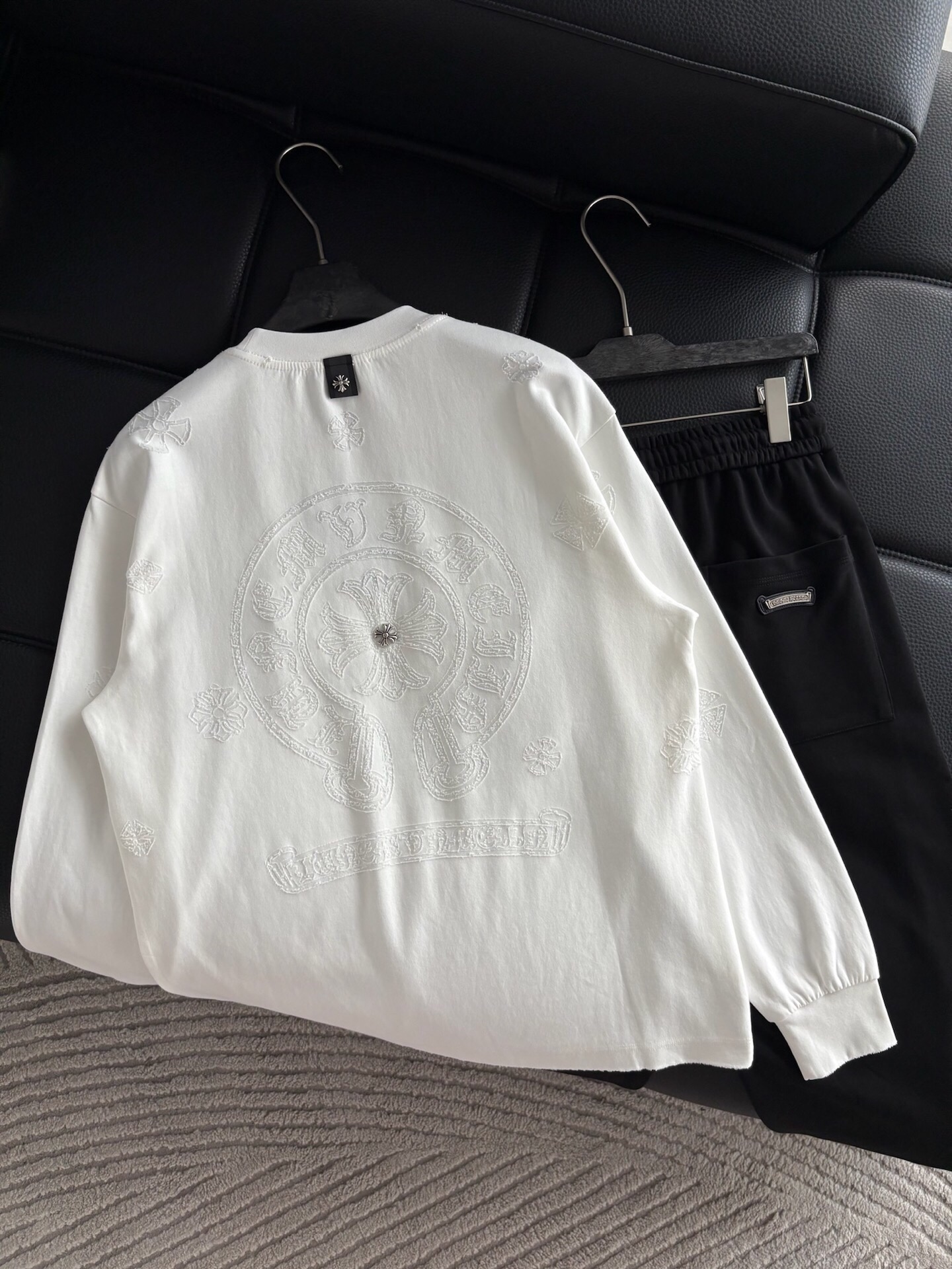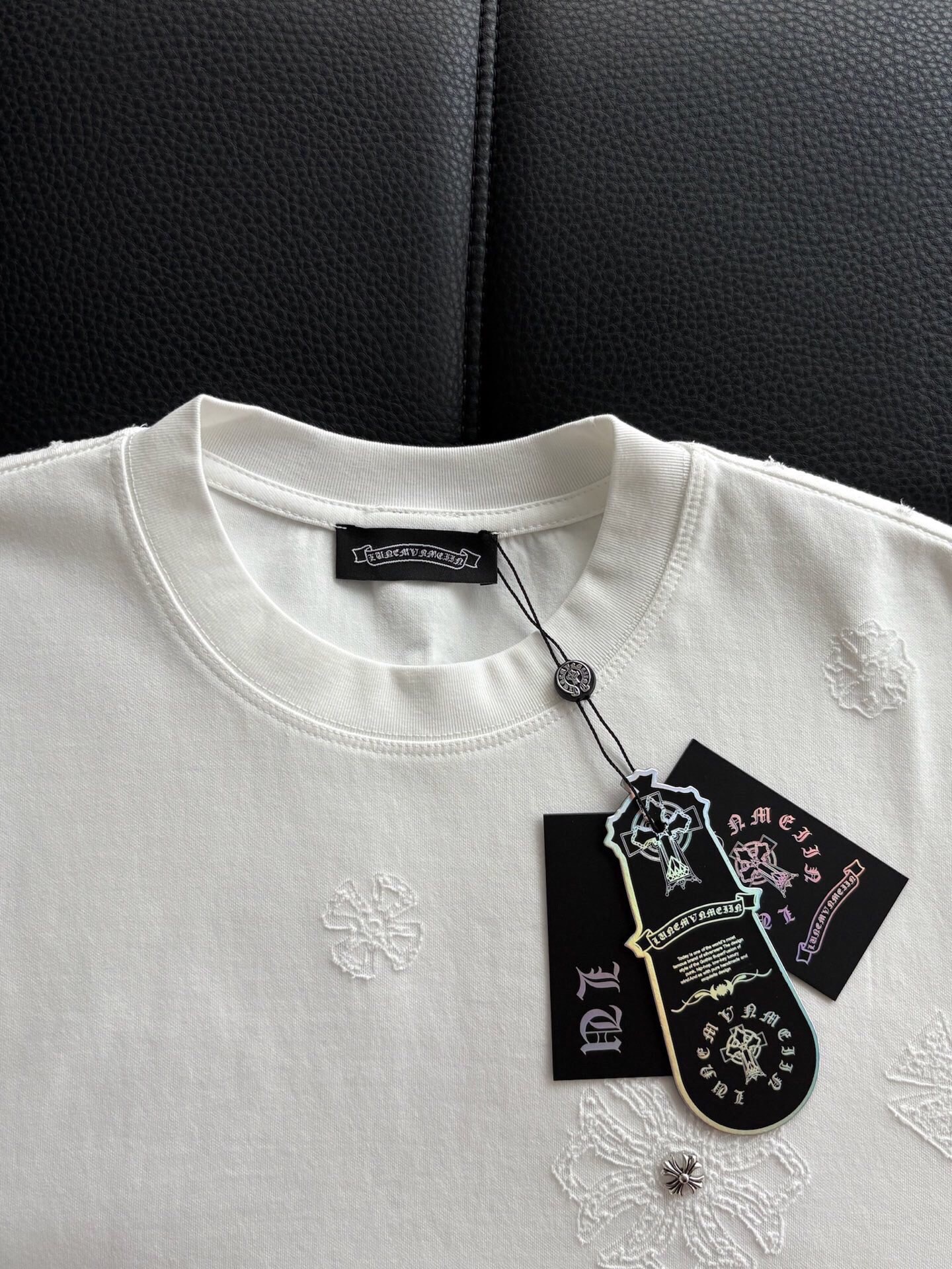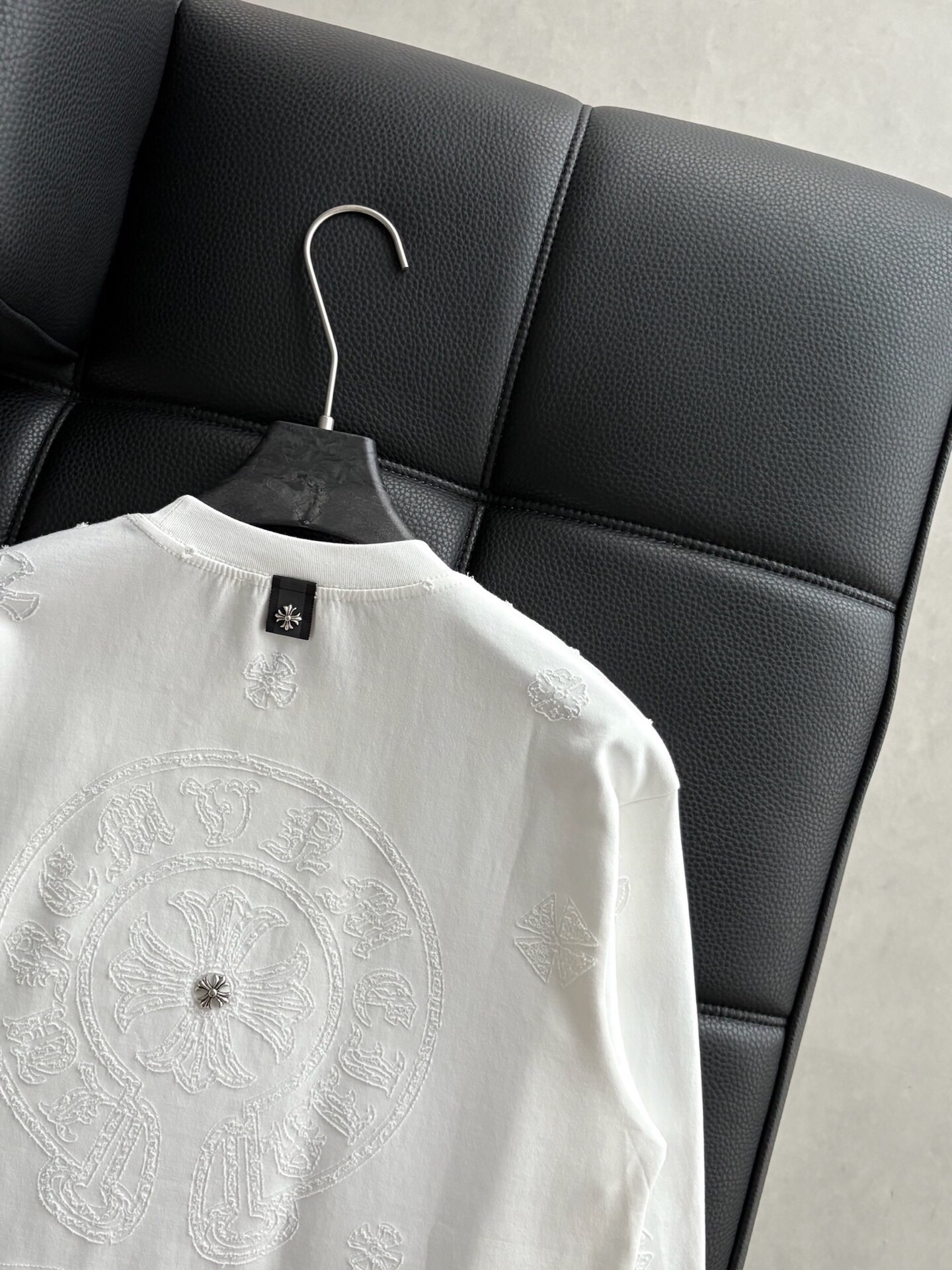 这款衣服是AAAAA 1:1 质量 (非常棒). 使用了和原版一模一样的材料. 商标部分也保持了和克罗心/Chrome Hearts一样. 图片拍摄是实物衣服拍摄, 您所收到的实物保证和我们图片一模一样.