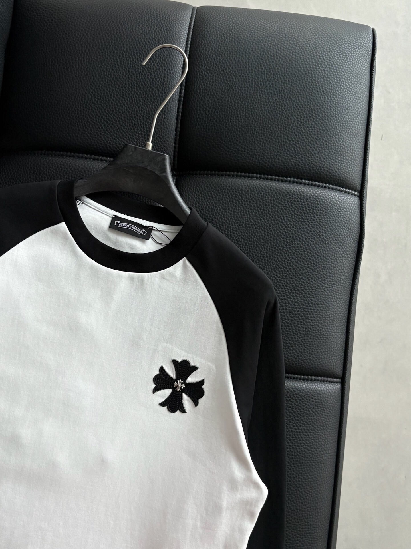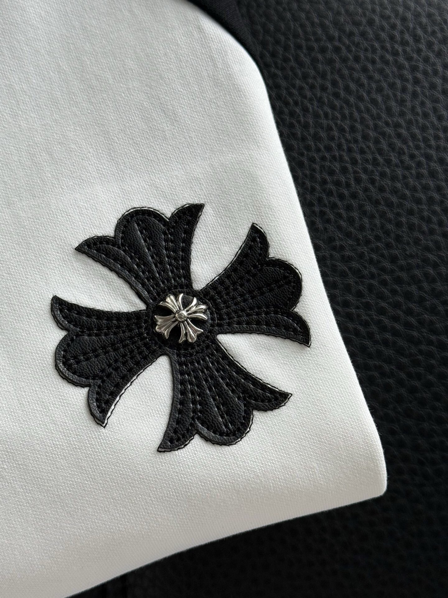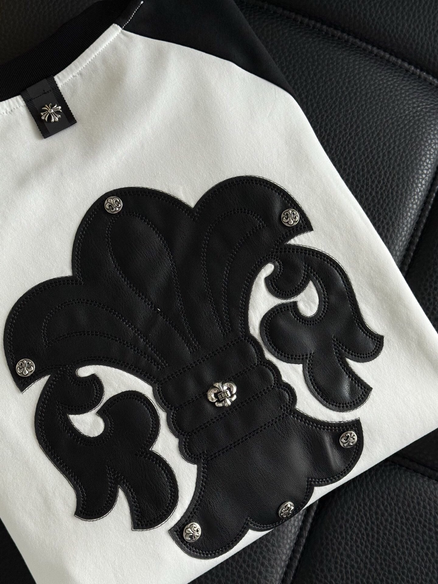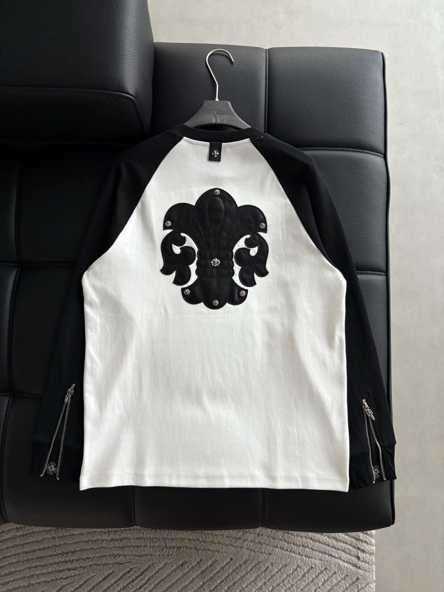 这款衣服是AAAAA 1:1 质量 (非常棒). 使用了和原版一模一样的材料. 商标部分也保持了和克罗心/Chrome Hearts一样. 图片拍摄是实物衣服拍摄, 您所收到的实物保证和我们图片一模一样.