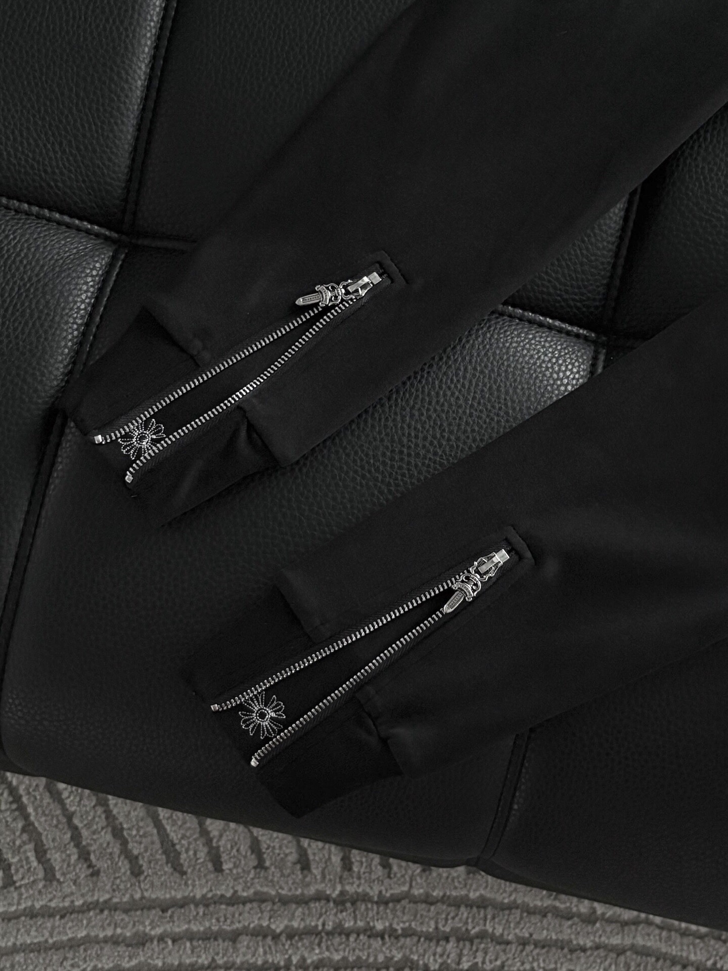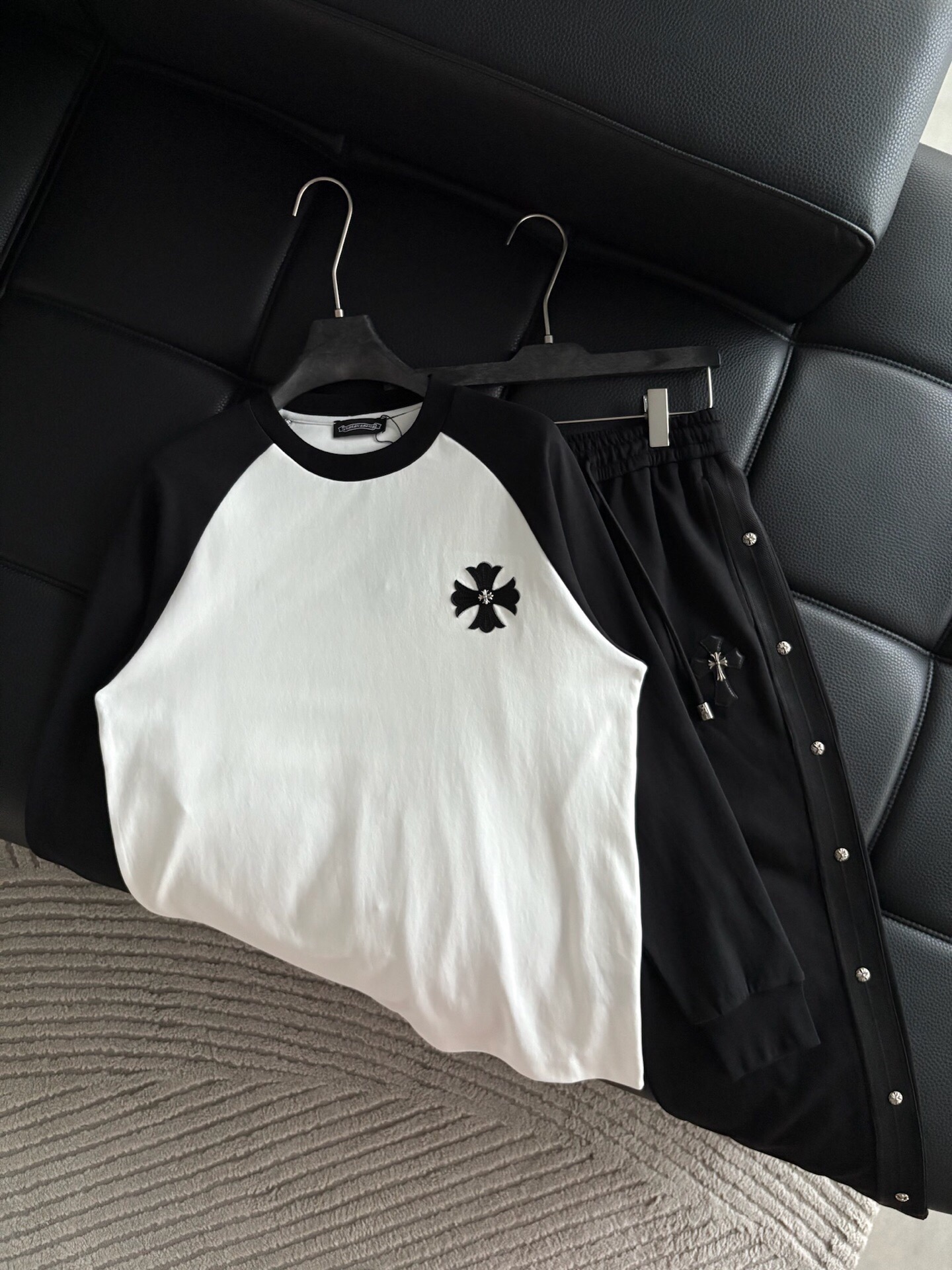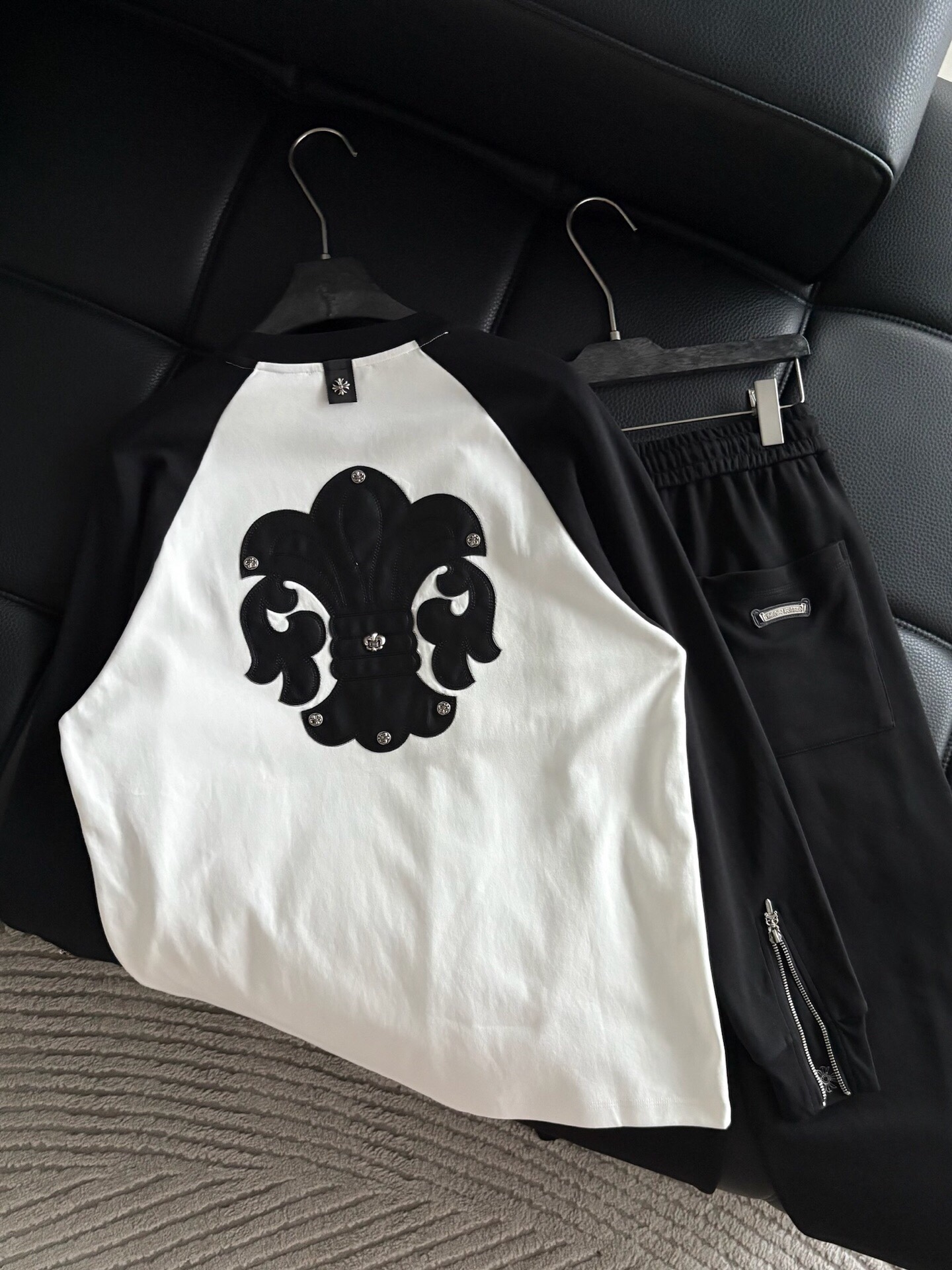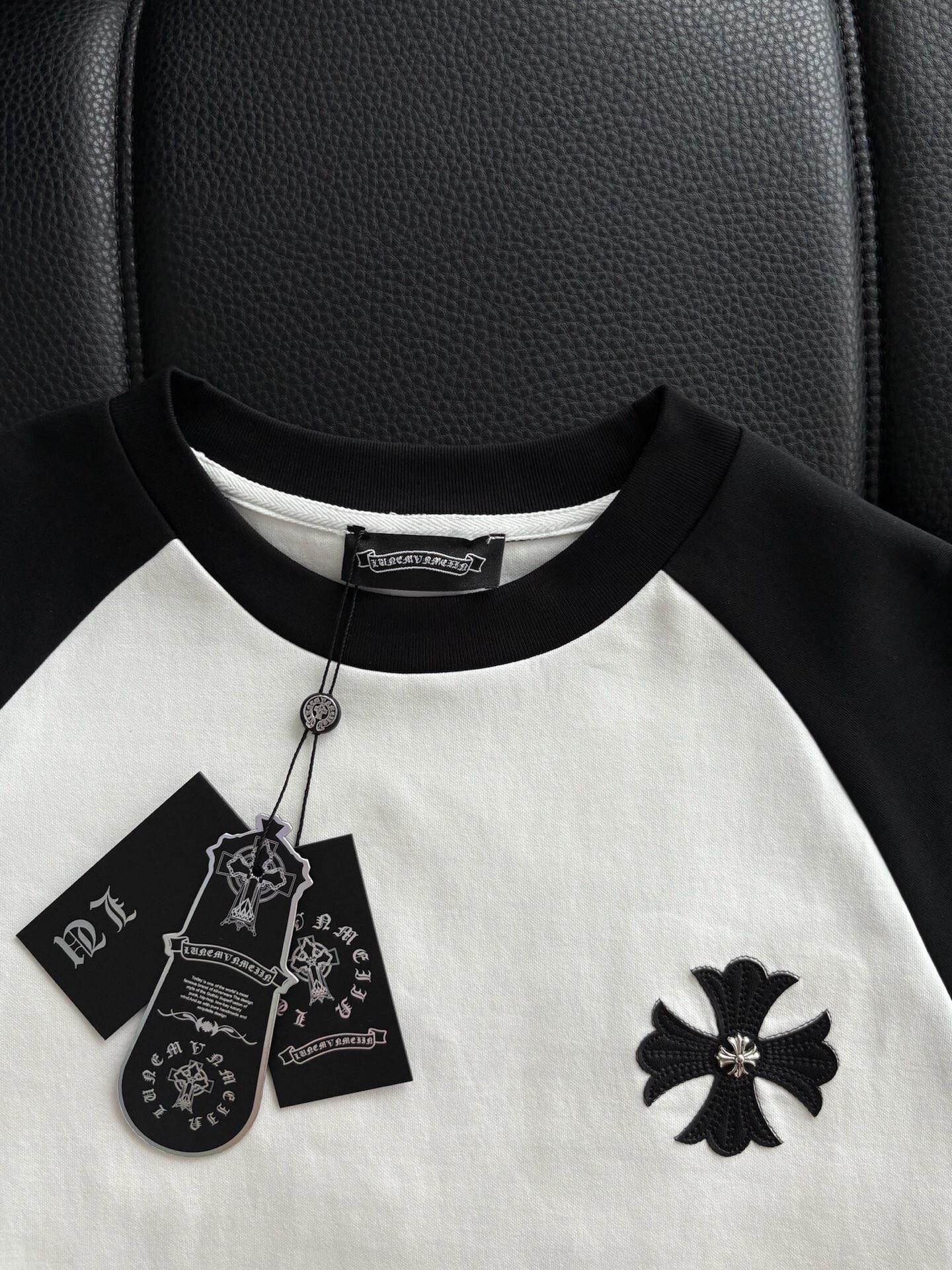 这款衣服是AAAAA 1:1 质量 (非常棒). 使用了和原版一模一样的材料. 商标部分也保持了和克罗心/Chrome Hearts一样. 图片拍摄是实物衣服拍摄, 您所收到的实物保证和我们图片一模一样.