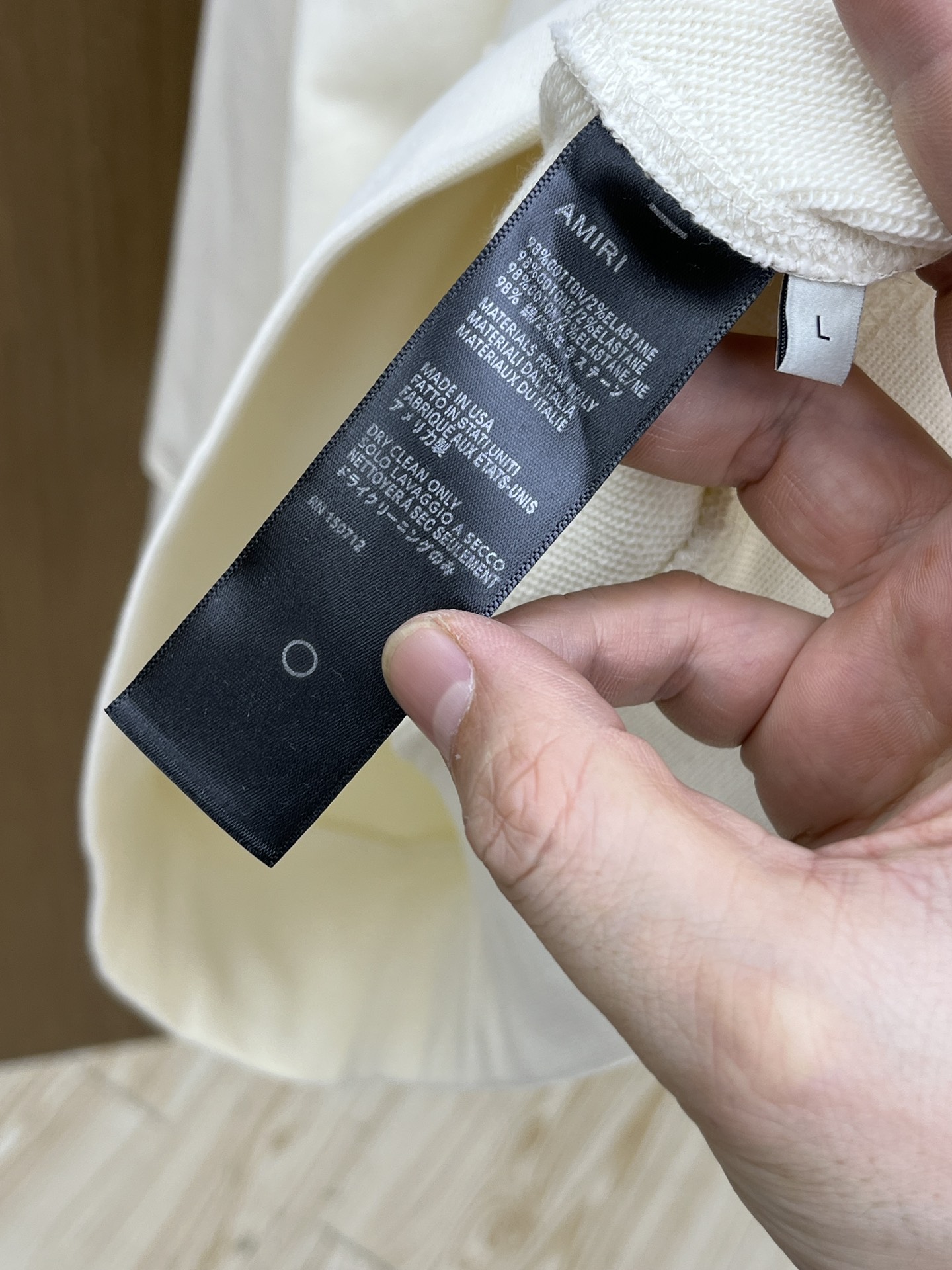 这款衣服是AAAAA 1:1 质量 (非常棒). 使用了和原版一模一样的材料. 商标部分也保持了和AMIRI一样. 图片拍摄是实物衣服拍摄, 您所收到的实物保证和我们图片一模一样.