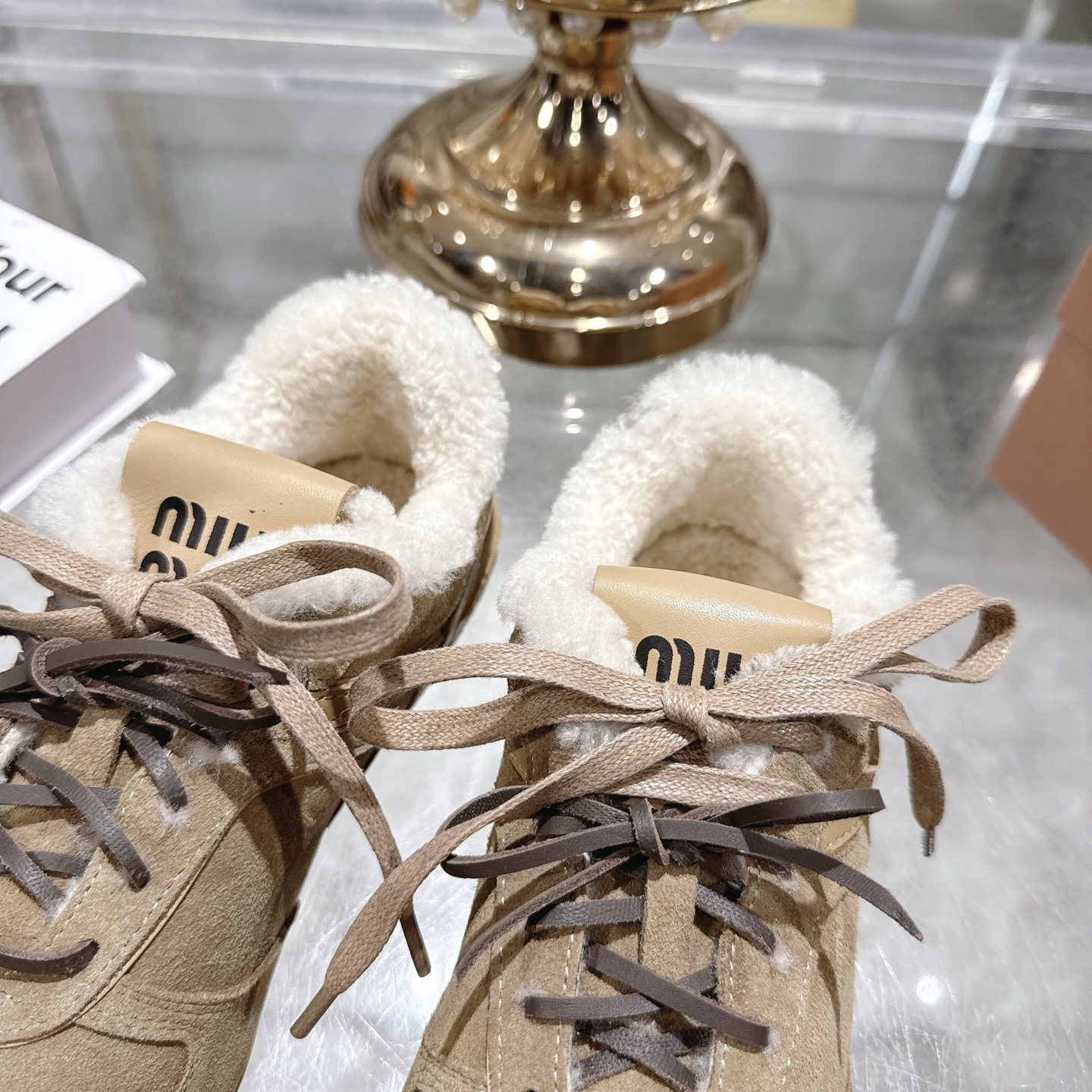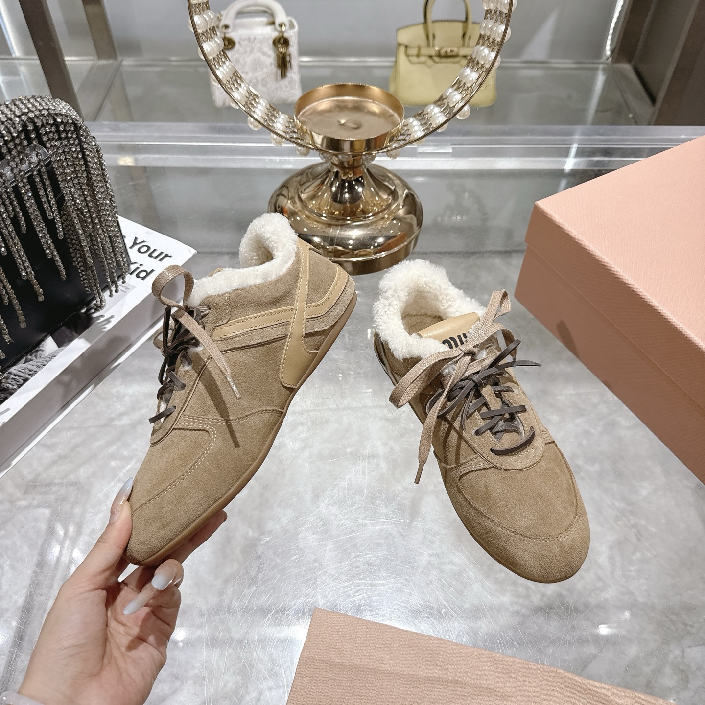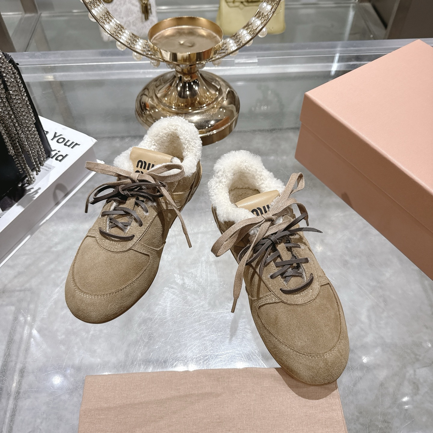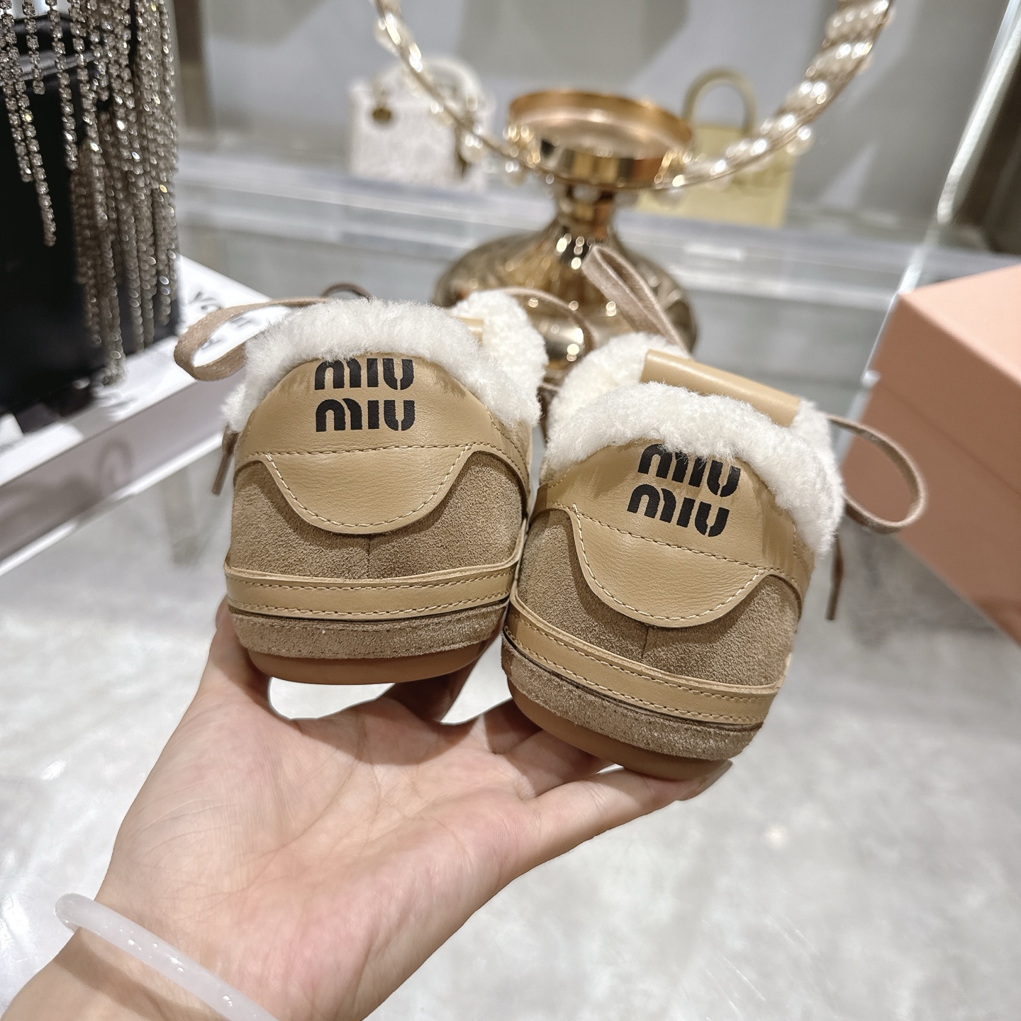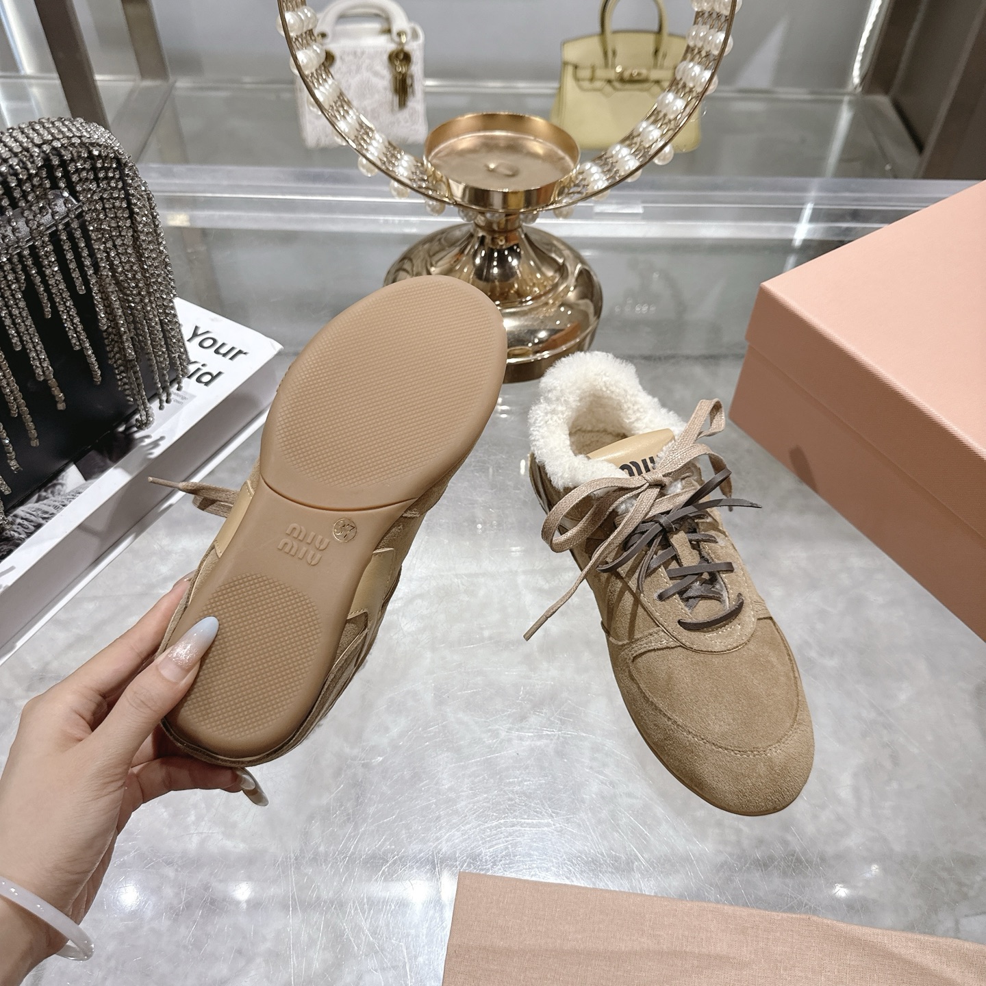 这款鞋子是AAAAA 1:1 质量 (非常棒). 使用了和原版一模一样的材料. 商标部分也保持了和缪缪/Miu Miu一样. 图片拍摄是实物鞋子拍摄, 您所收到的实物保证和我们图片一模一样.
