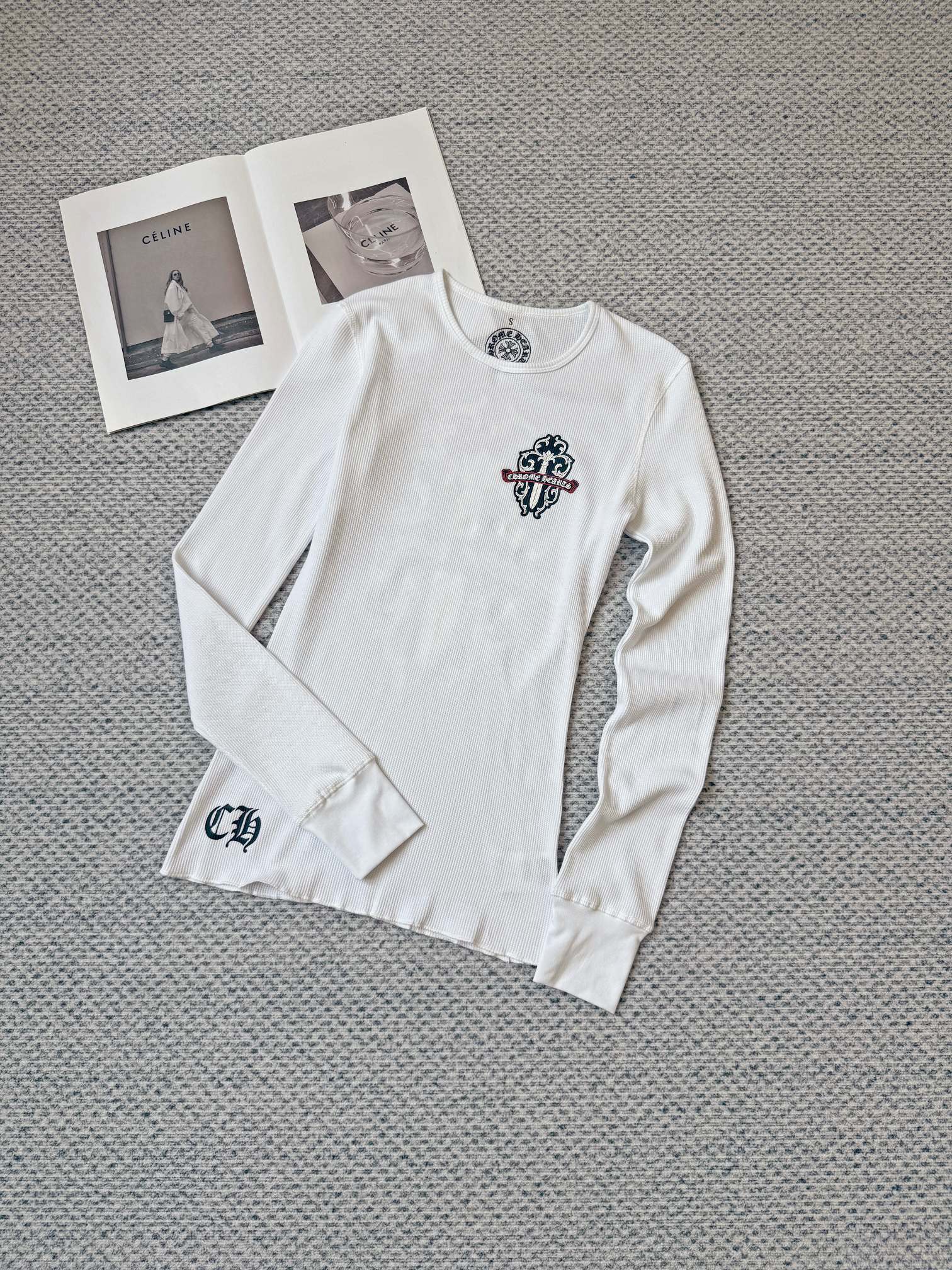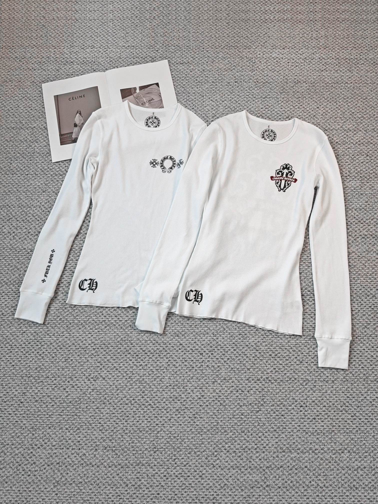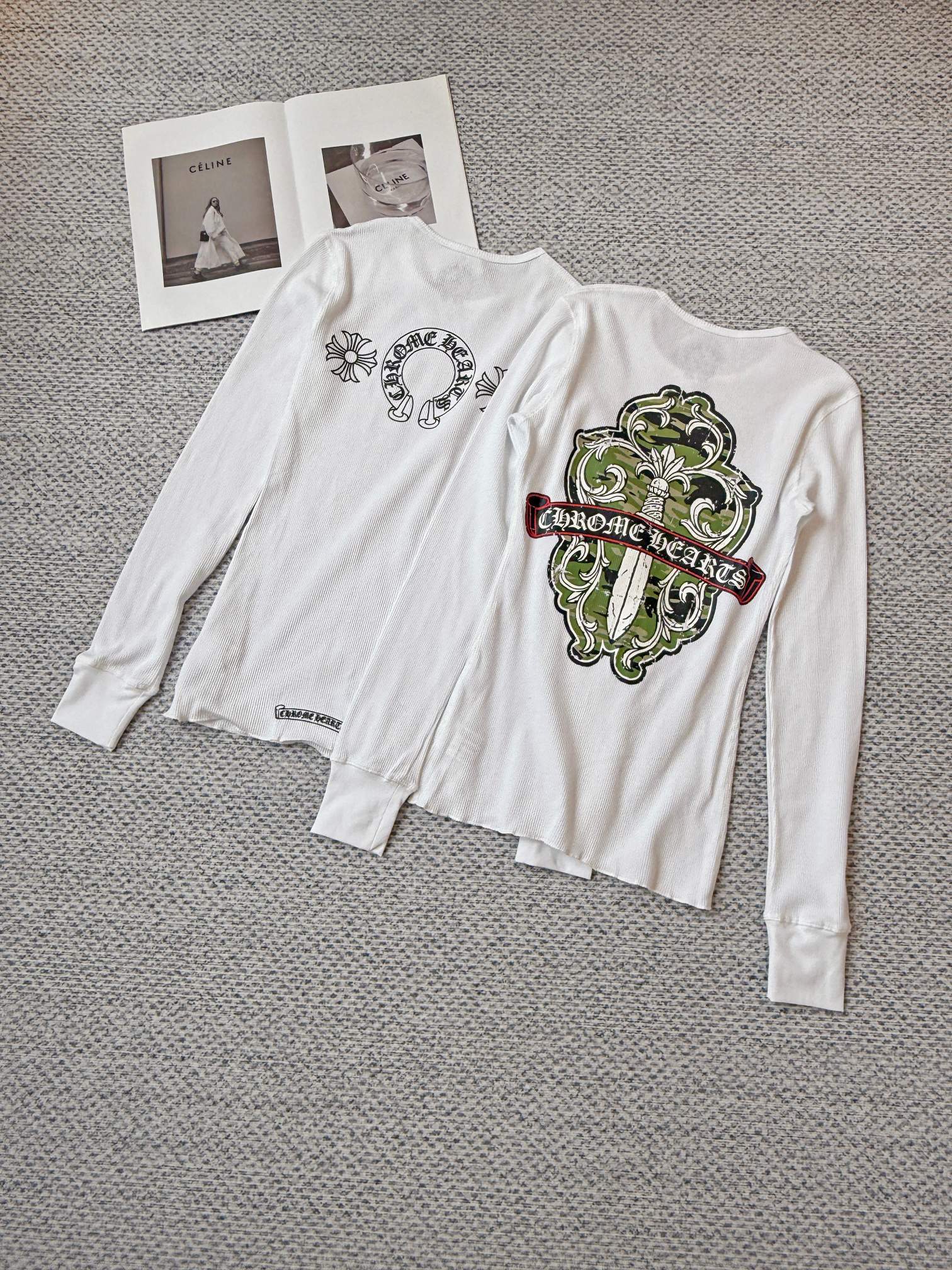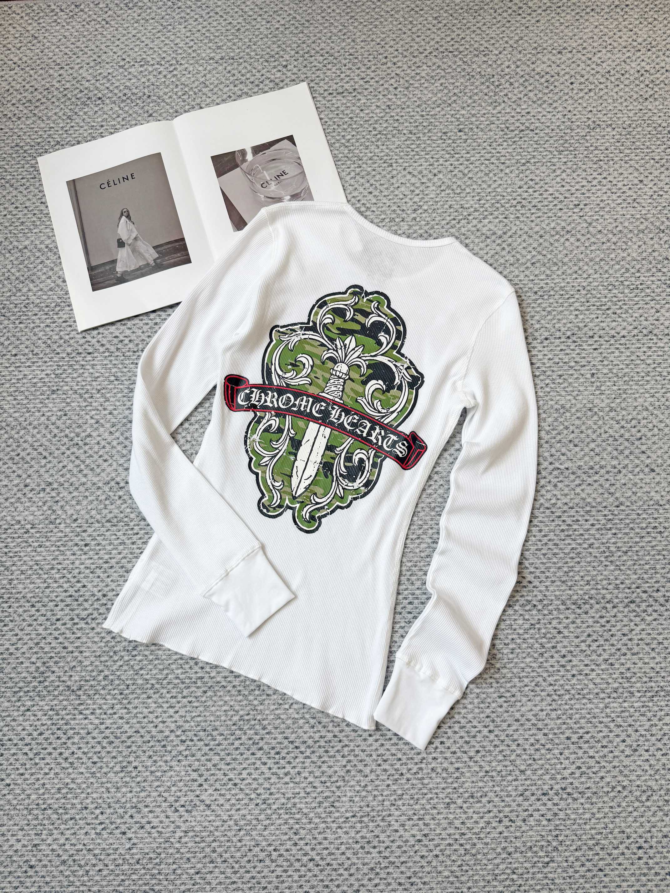 这款衣服是AAAAA 1:1 质量 (非常棒). 使用了和原版一模一样的材料. 商标部分也保持了和克罗心/Chrome Hearts一样. 图片拍摄是实物衣服拍摄, 您所收到的实物保证和我们图片一模一样.