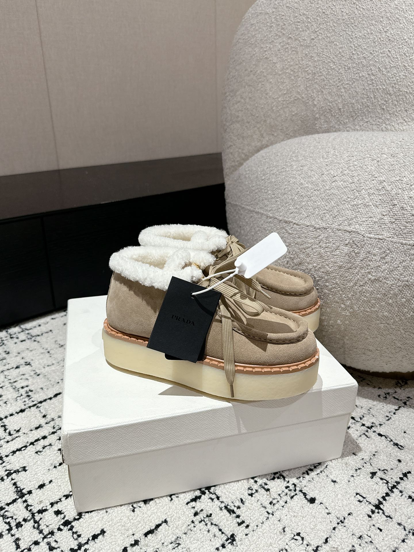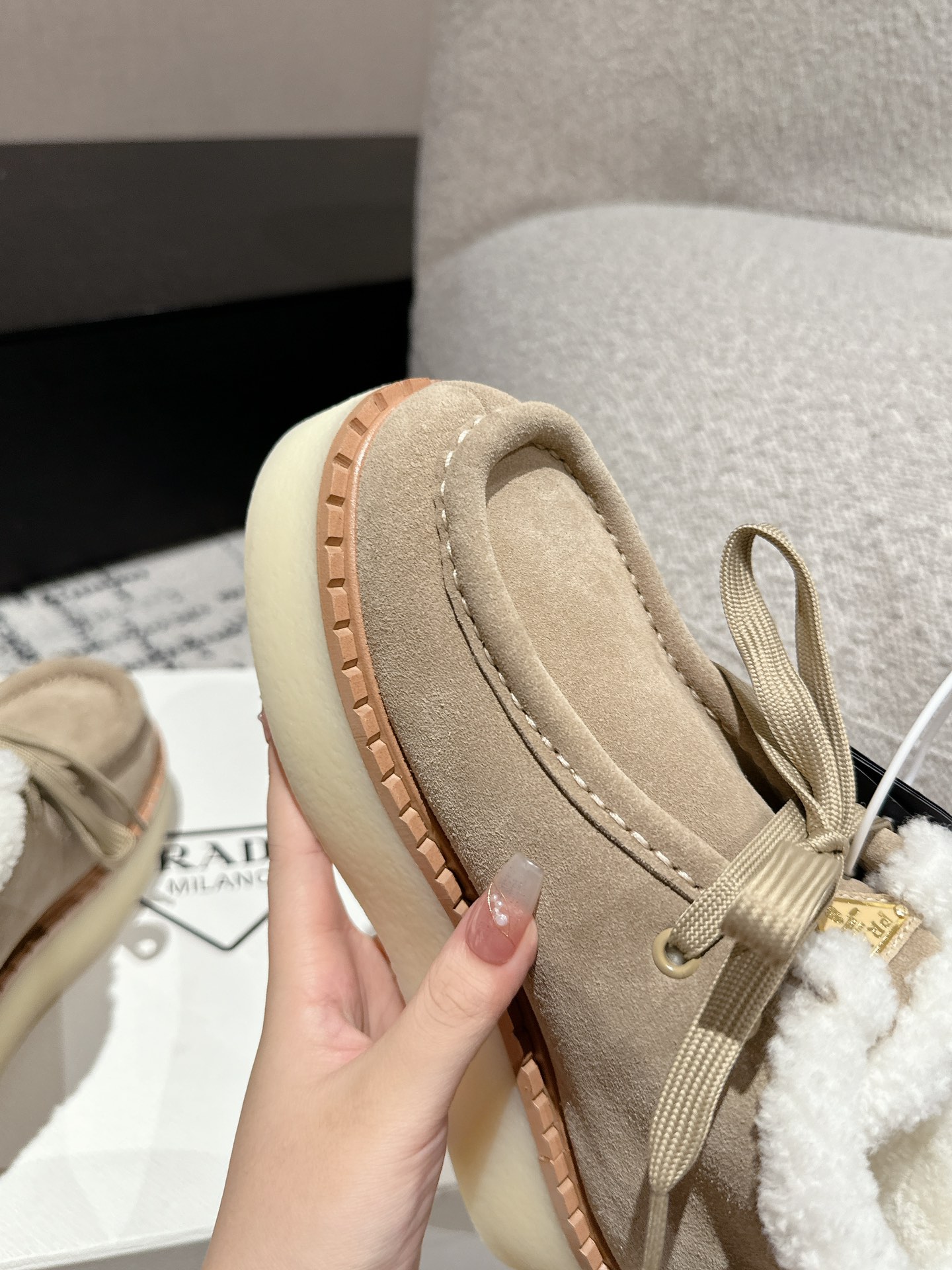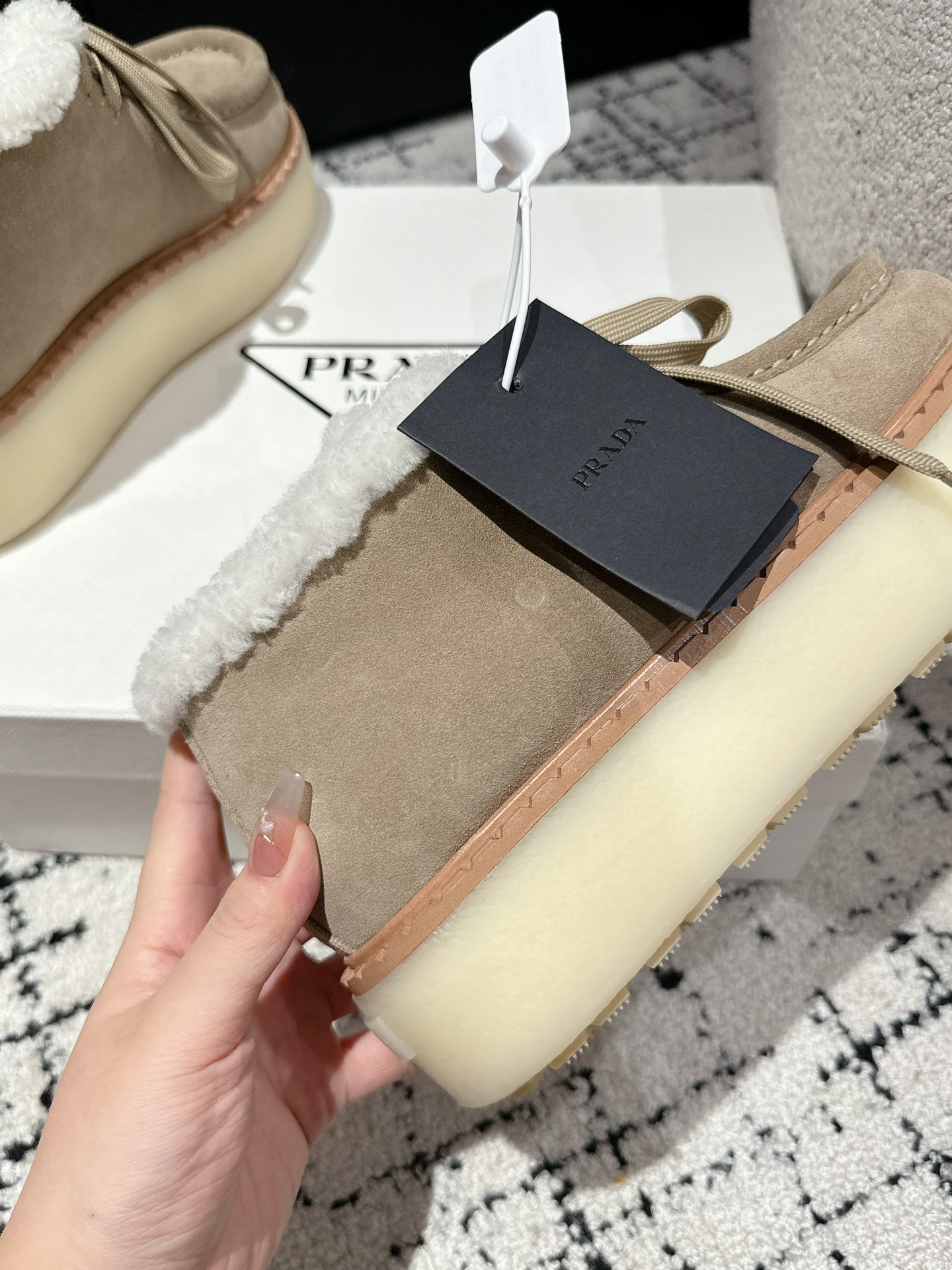 这款鞋子是AAAAA 1:1 质量 (非常棒). 使用了和原版一模一样的材料. 商标部分也保持了和普拉达/Prada一样. 图片拍摄是实物鞋子拍摄, 您所收到的实物保证和我们图片一模一样.