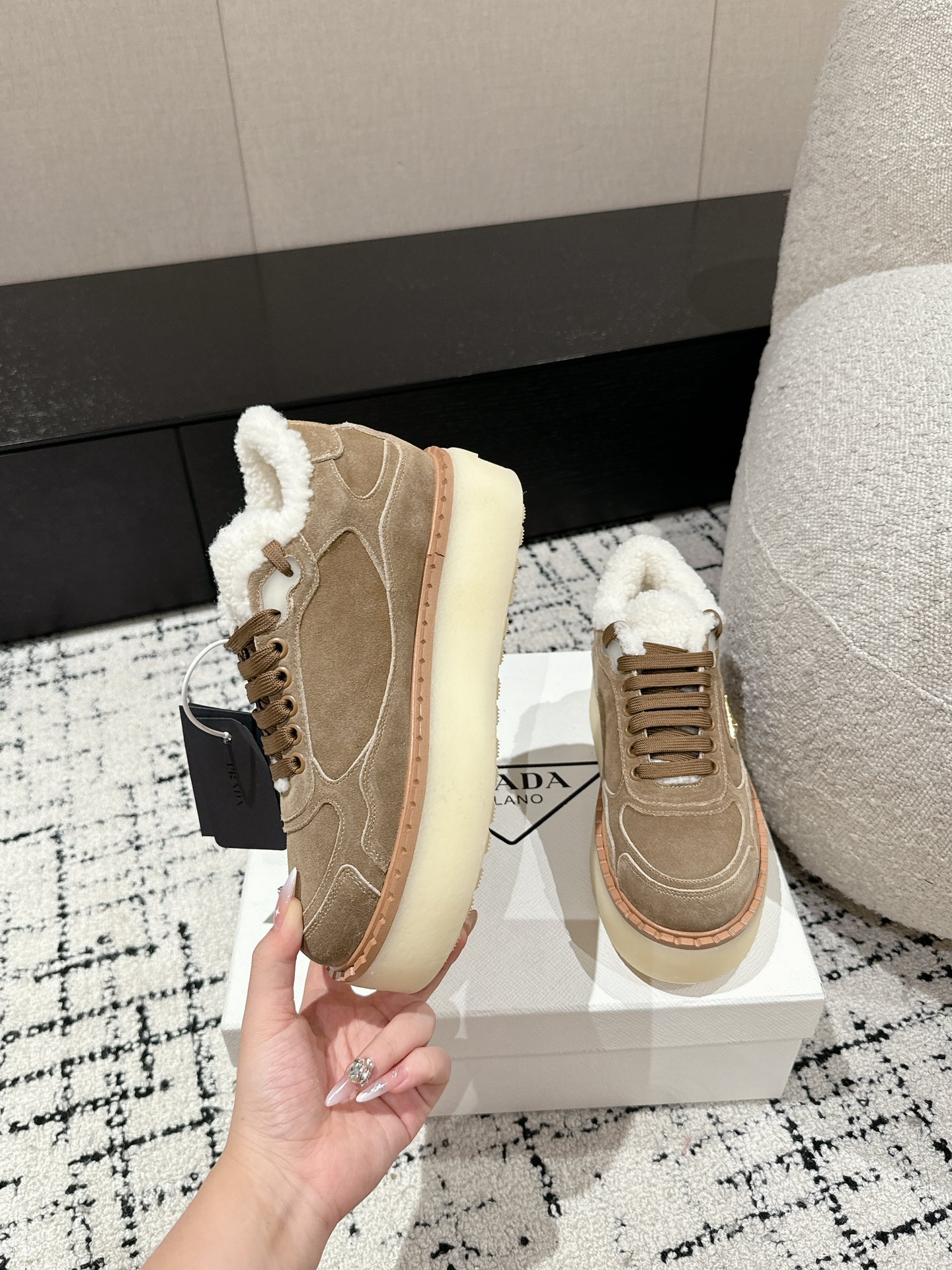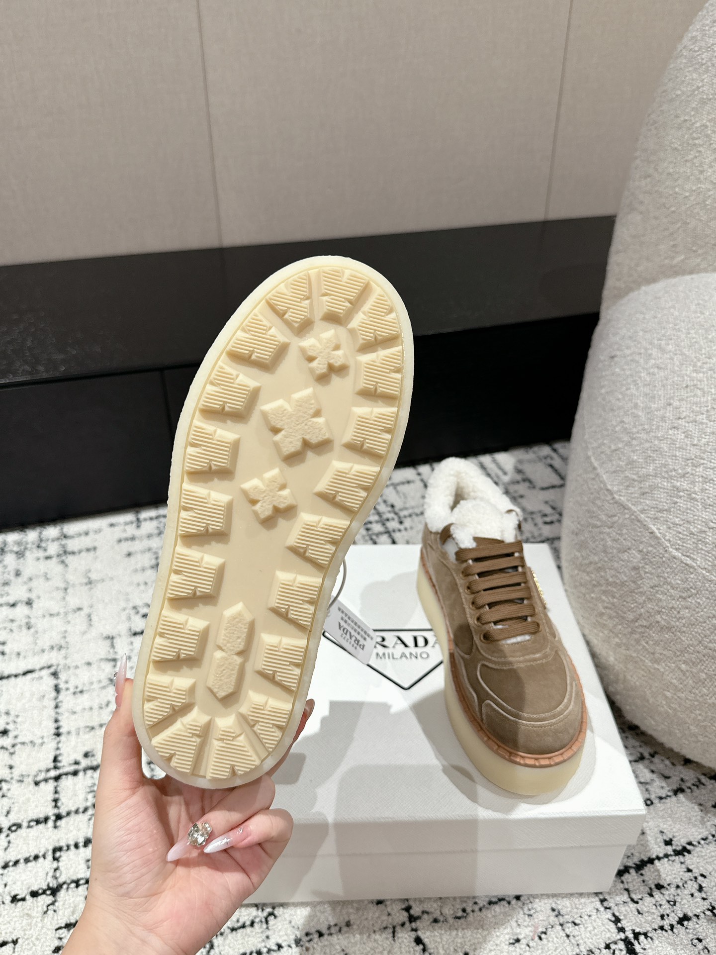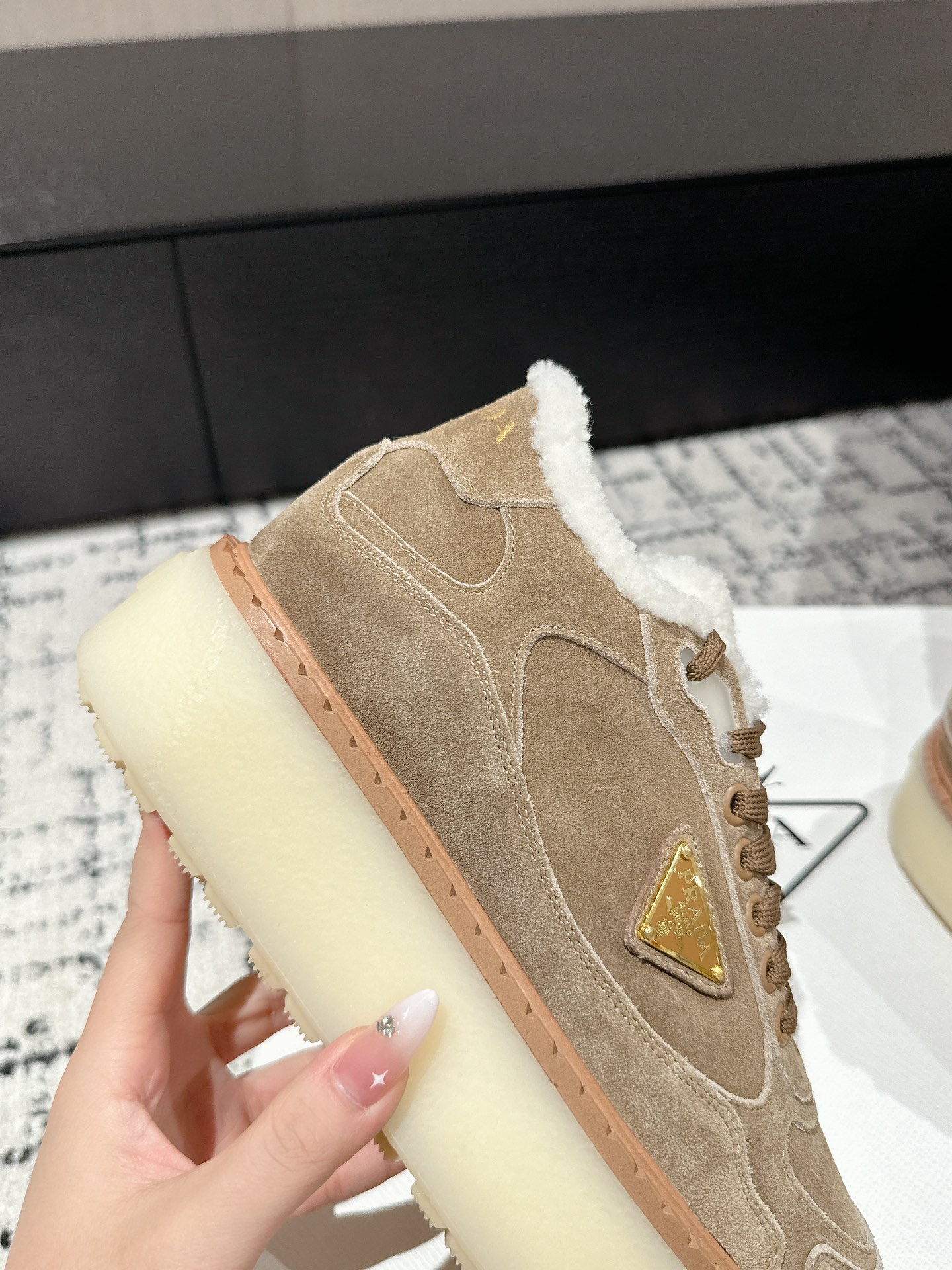 这款鞋子是AAAAA 1:1 质量 (非常棒). 使用了和原版一模一样的材料. 商标部分也保持了和普拉达/Prada一样. 图片拍摄是实物鞋子拍摄, 您所收到的实物保证和我们图片一模一样.