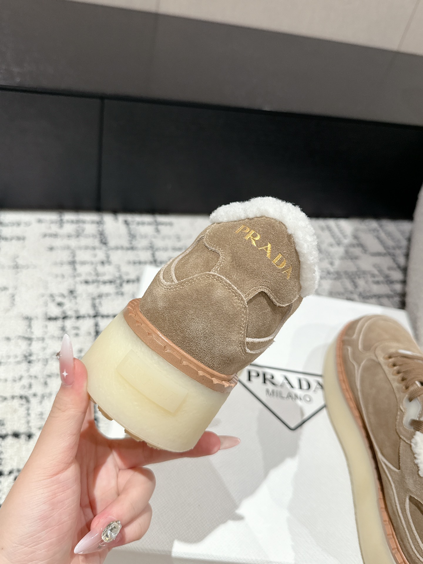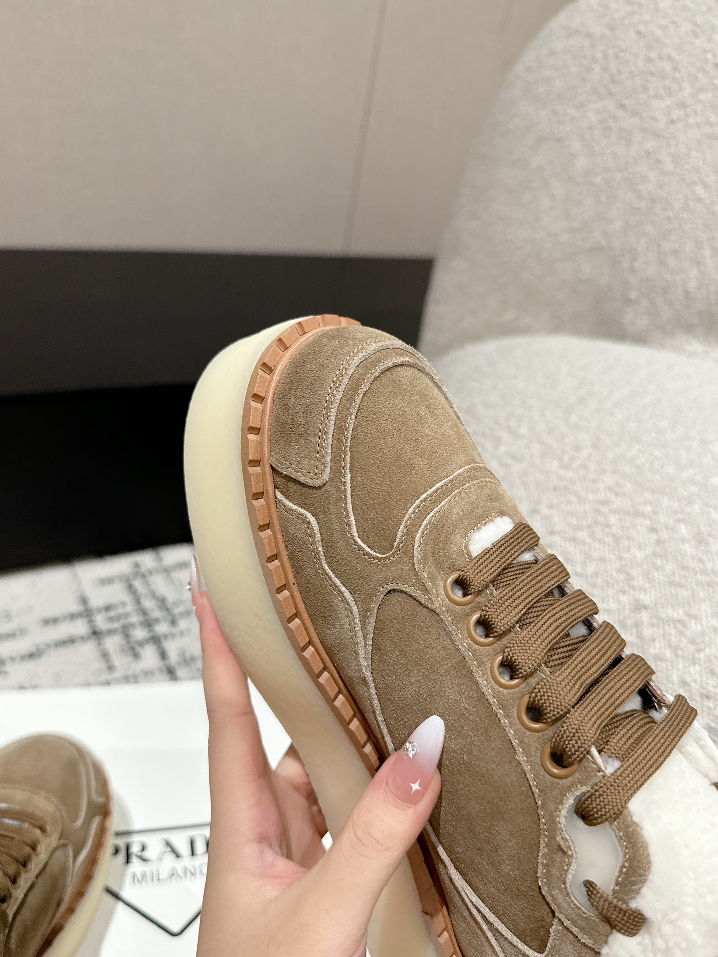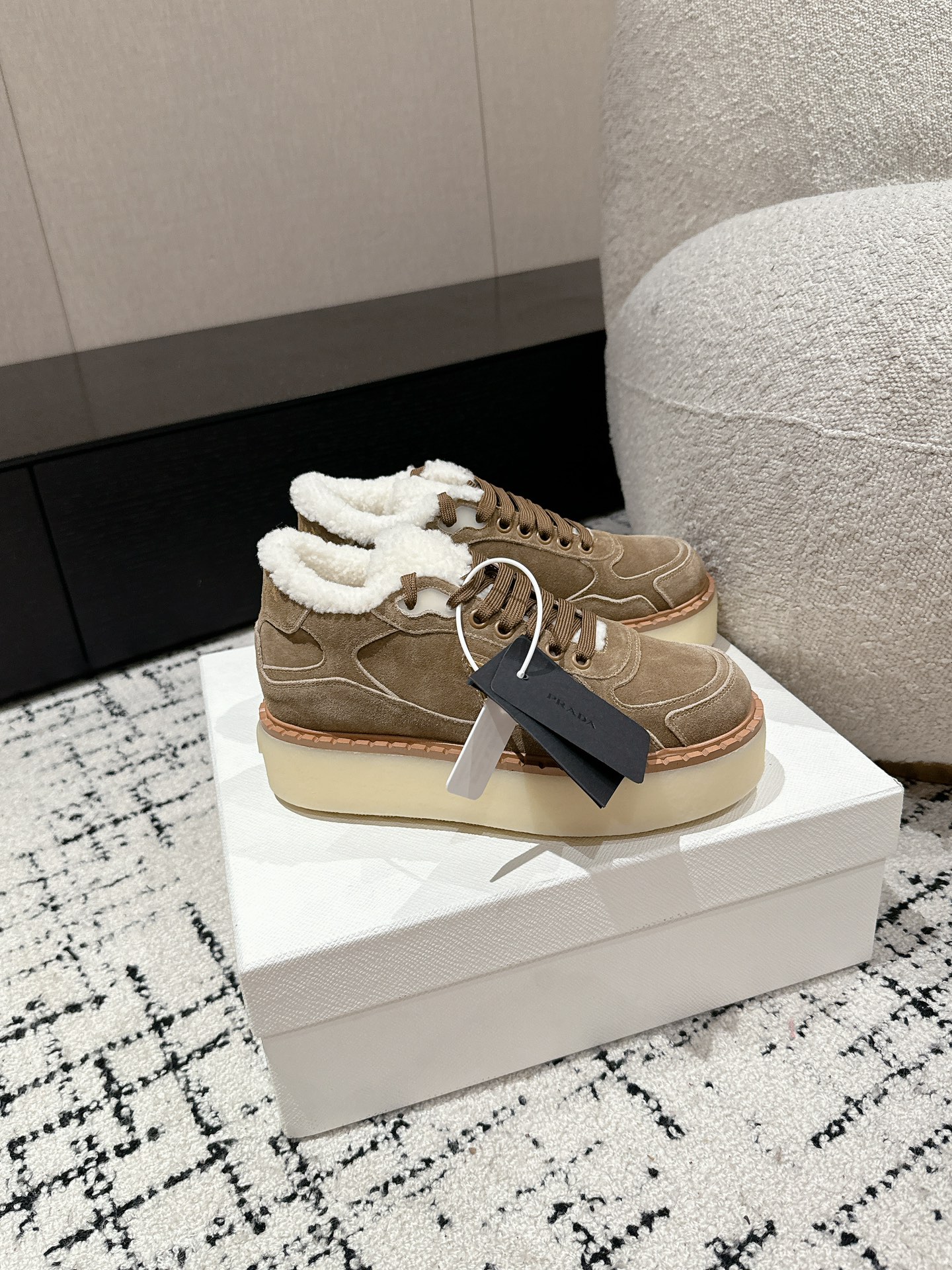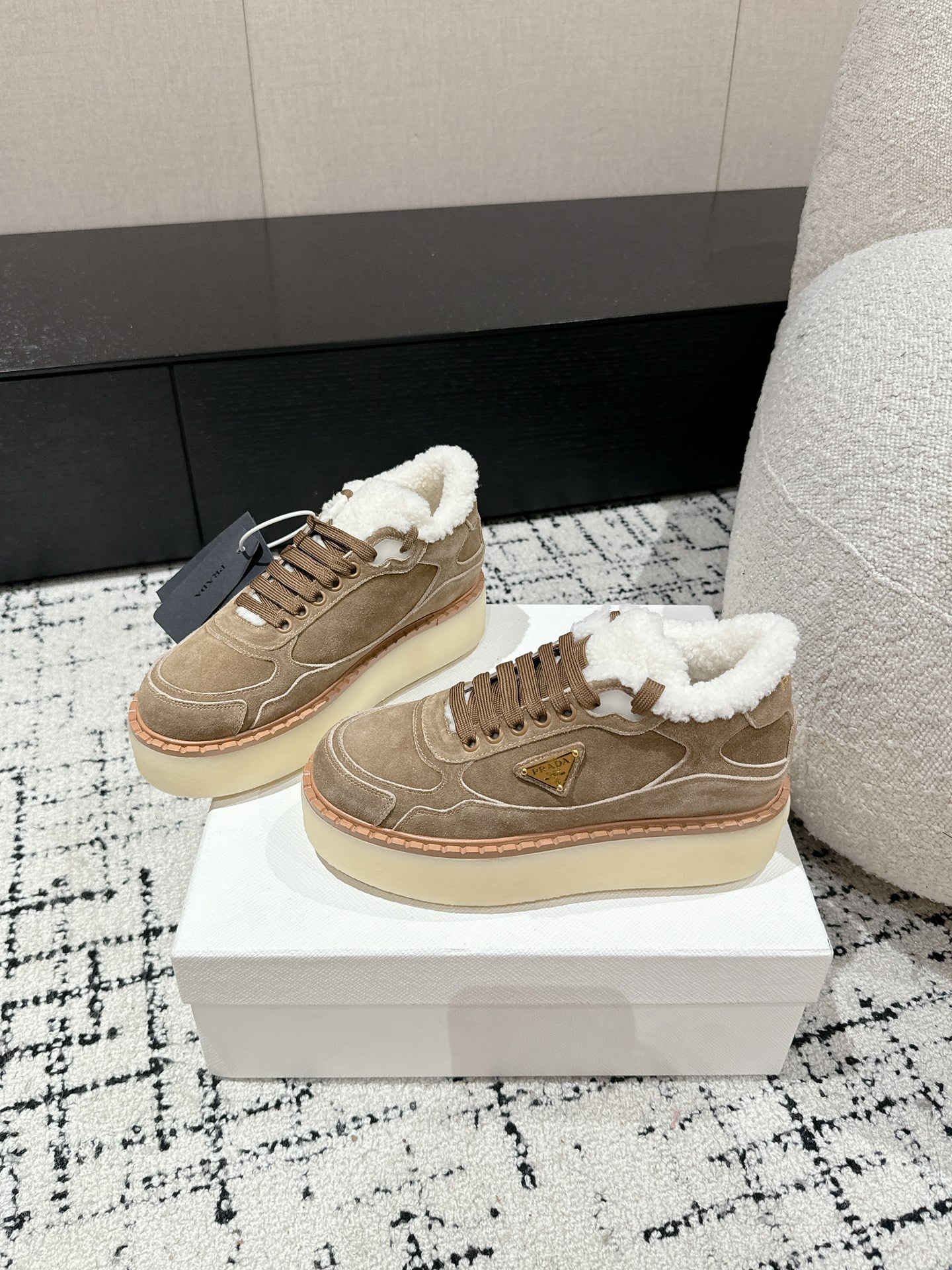 这款鞋子是AAAAA 1:1 质量 (非常棒). 使用了和原版一模一样的材料. 商标部分也保持了和普拉达/Prada一样. 图片拍摄是实物鞋子拍摄, 您所收到的实物保证和我们图片一模一样.