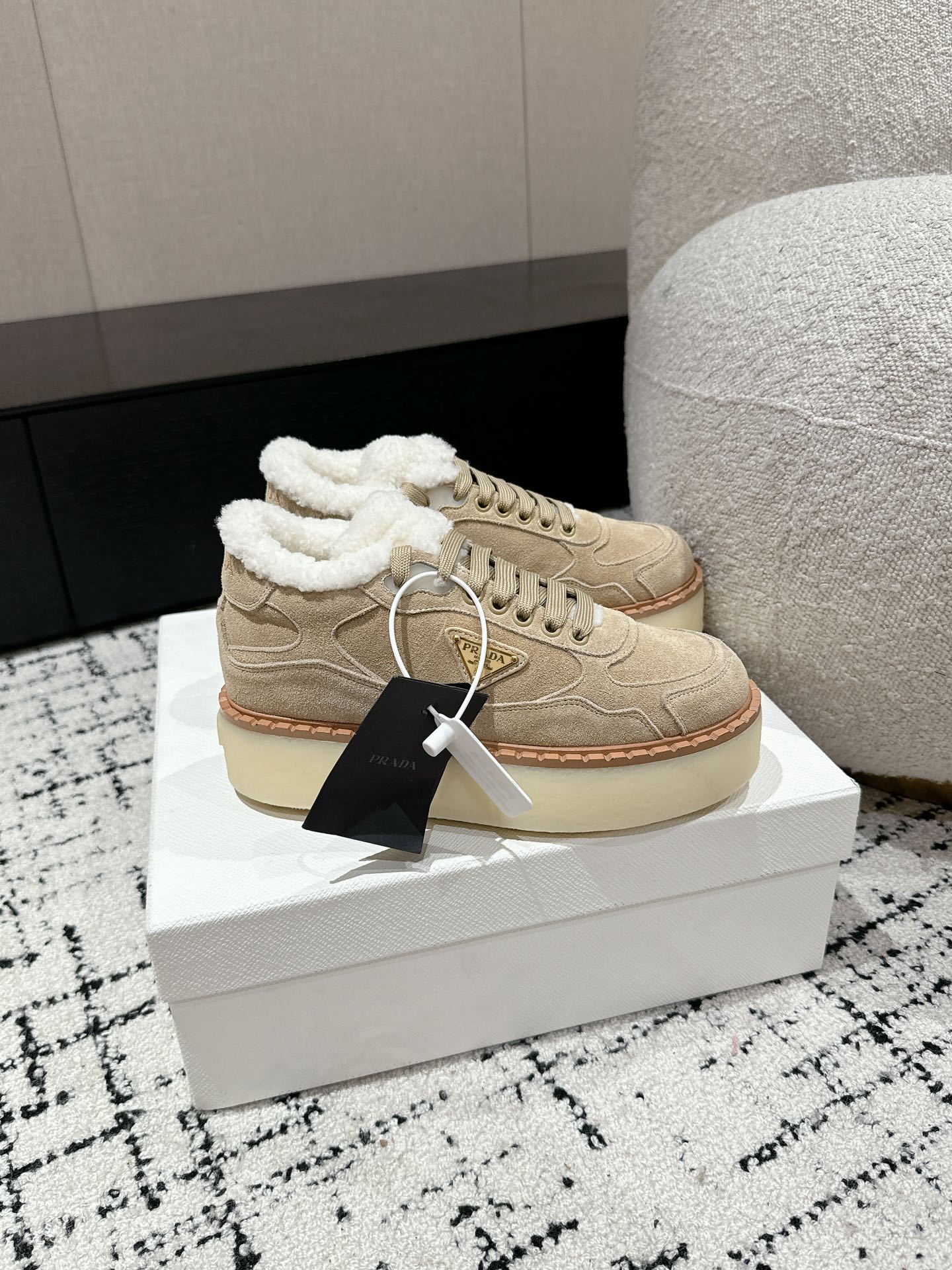 这款鞋子是AAAAA 1:1 质量 (非常棒). 使用了和原版一模一样的材料. 商标部分也保持了和普拉达/Prada一样. 图片拍摄是实物鞋子拍摄, 您所收到的实物保证和我们图片一模一样.