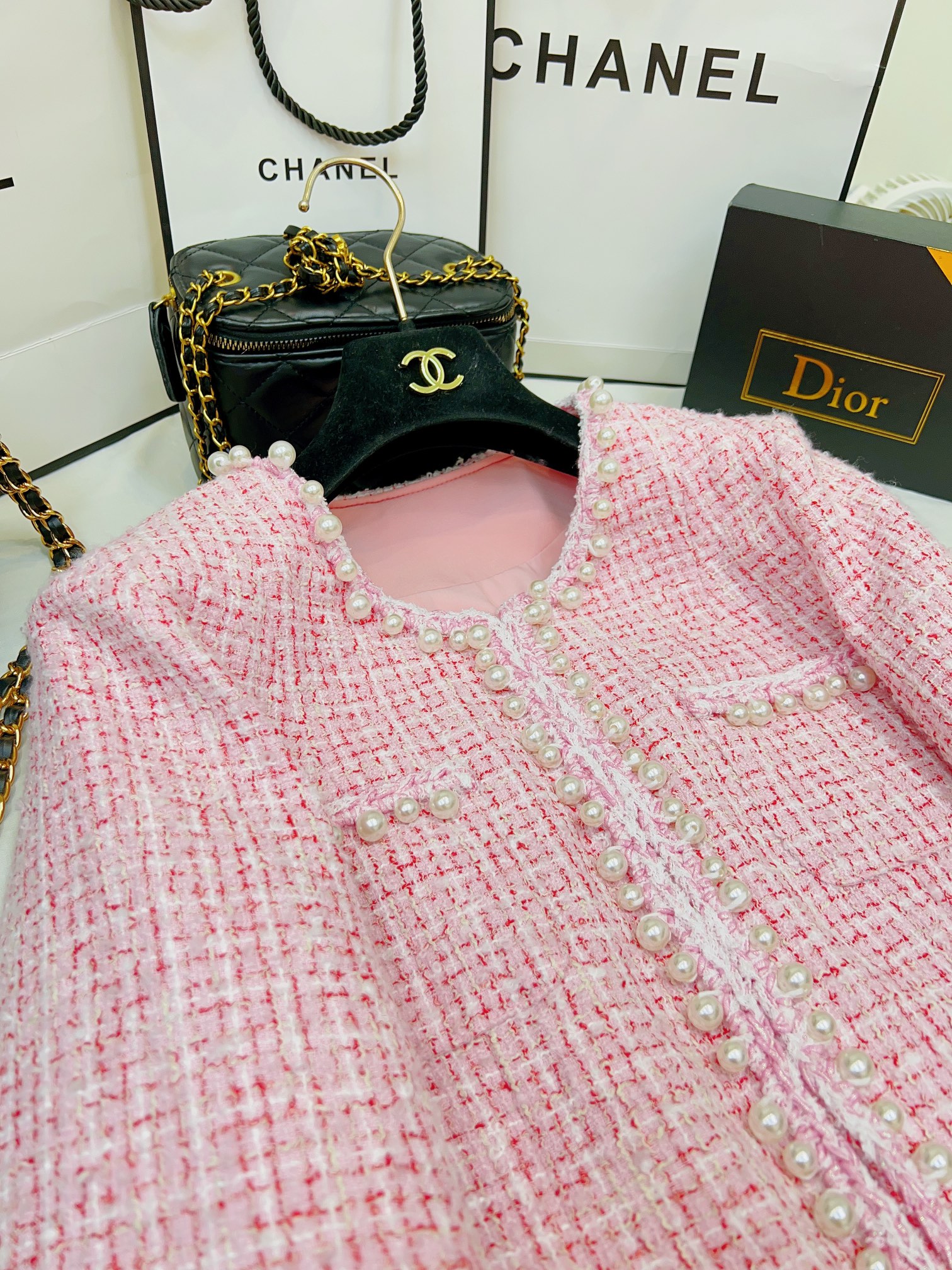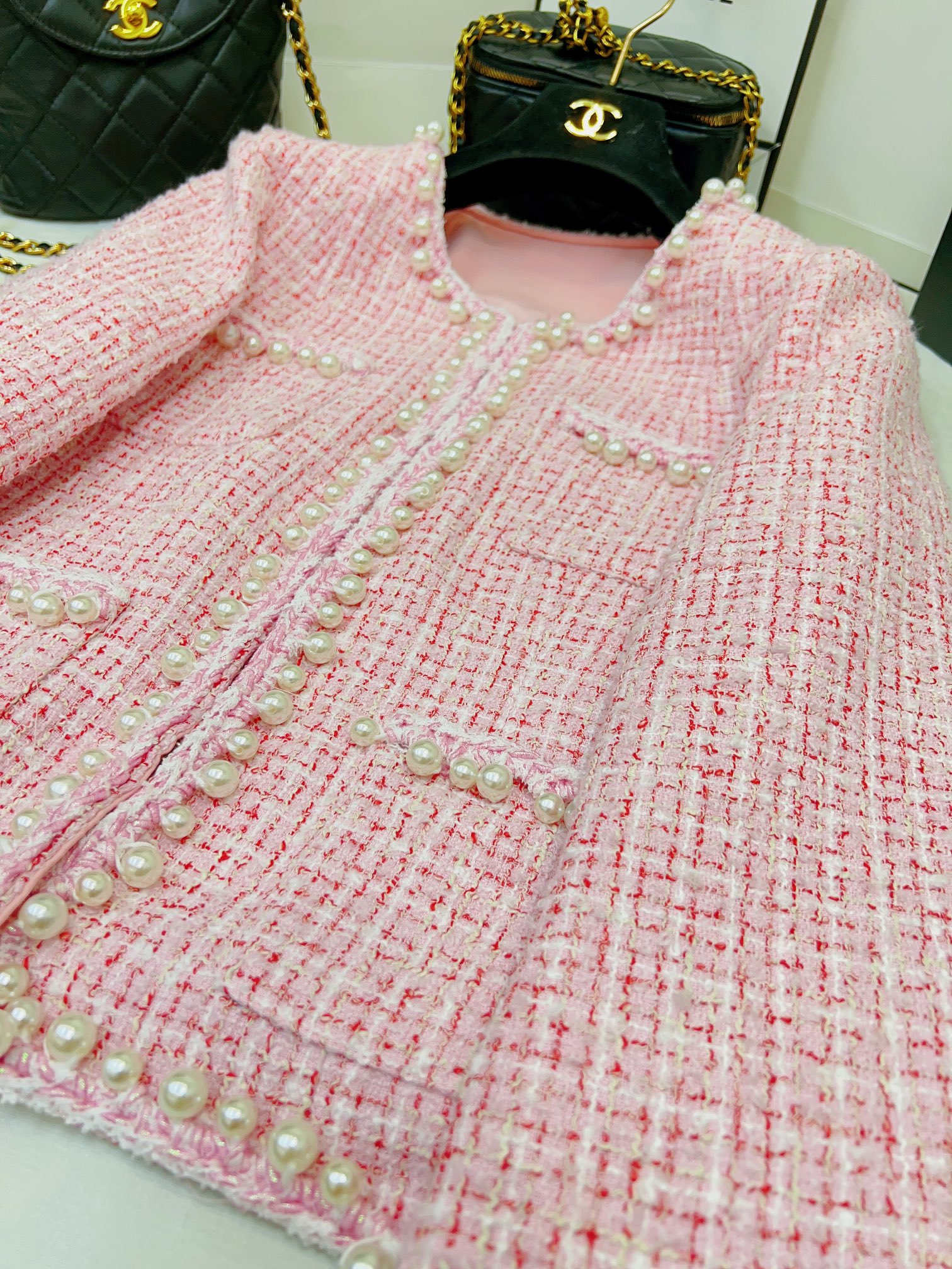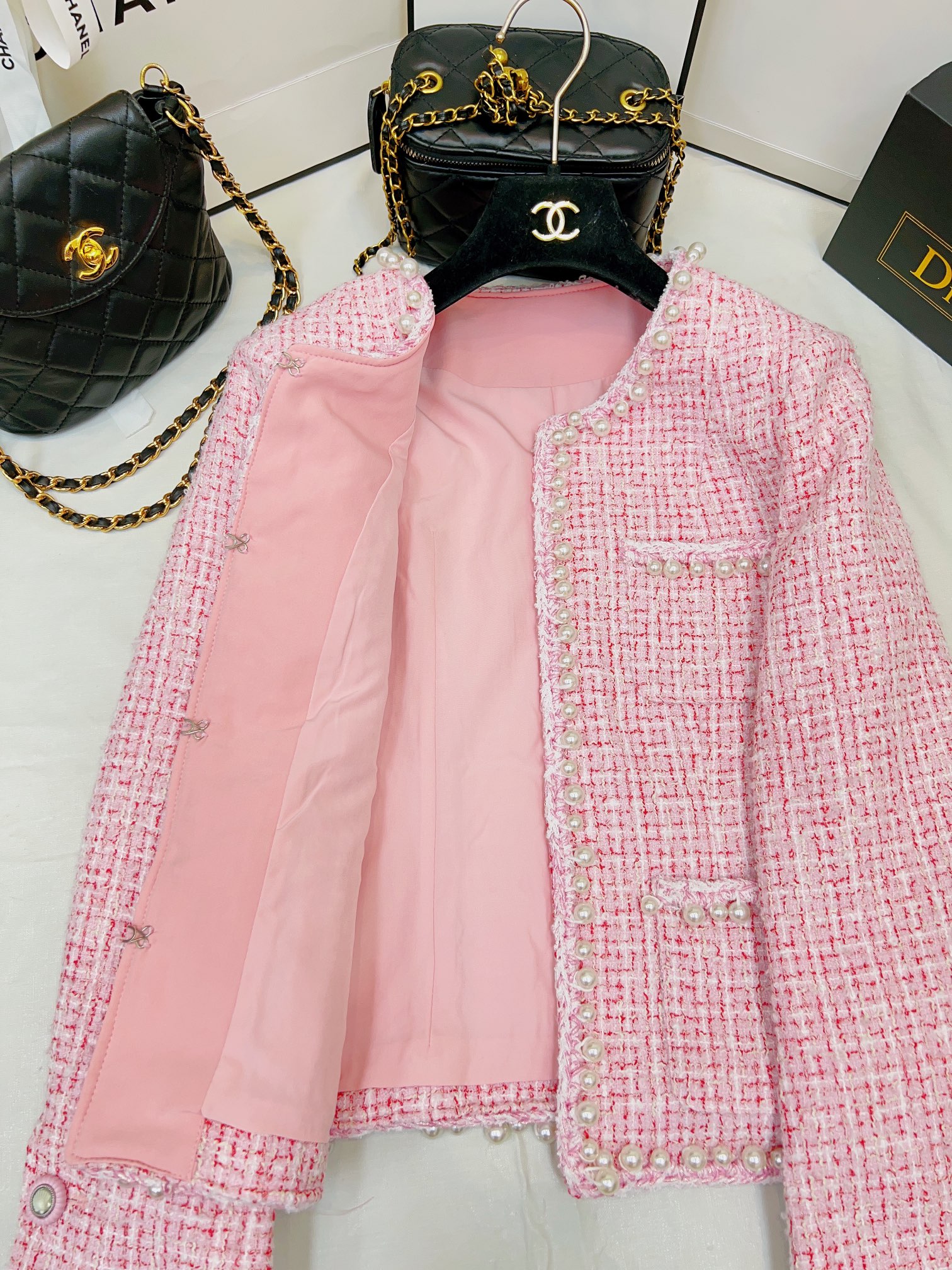 这款衣服是AAAAA 1:1 质量 (非常棒). 使用了和原版一模一样的材料. 商标部分也保持了和香奈儿/Chanel一样. 图片拍摄是实物衣服拍摄, 您所收到的实物保证和我们图片一模一样.