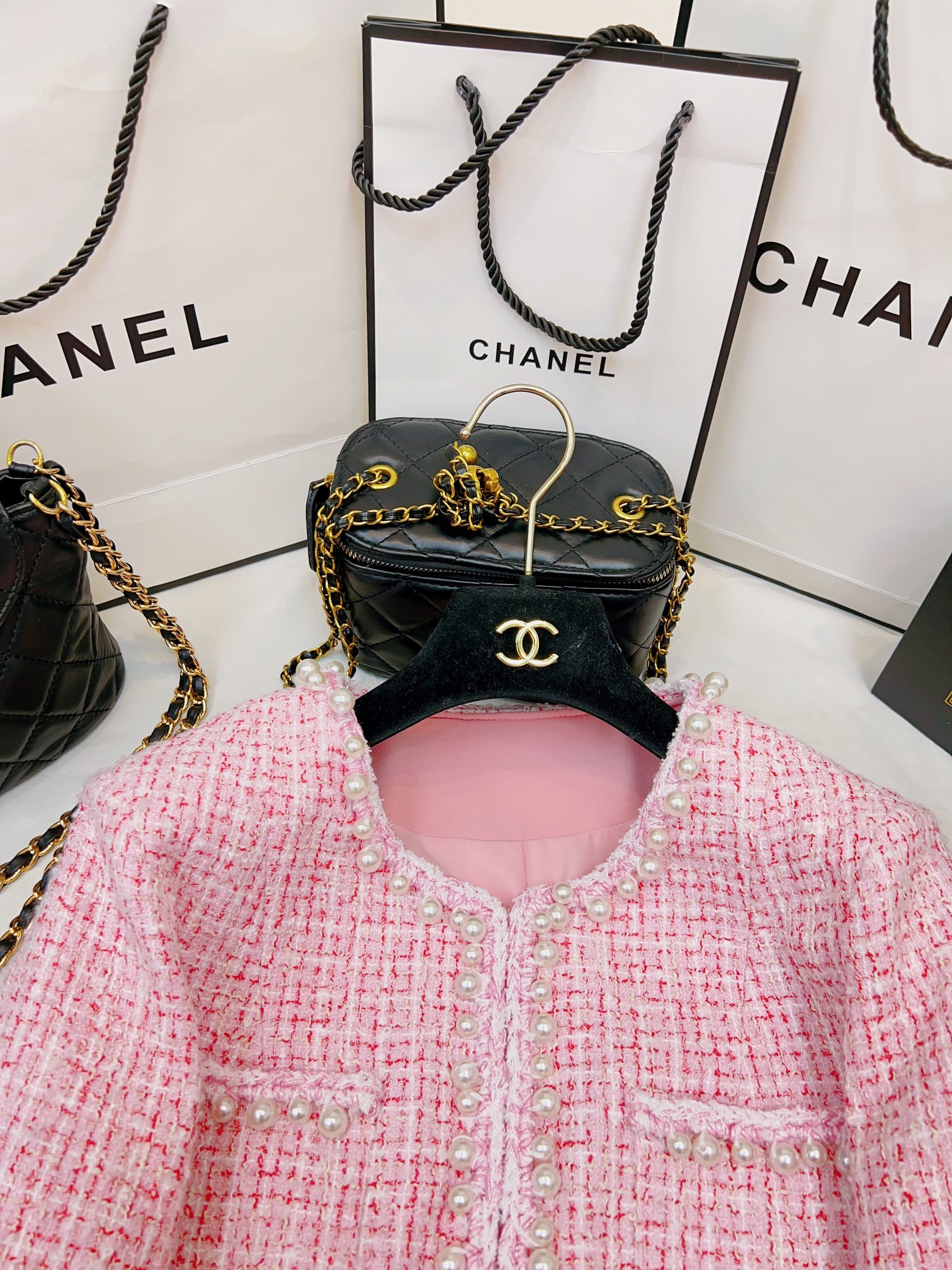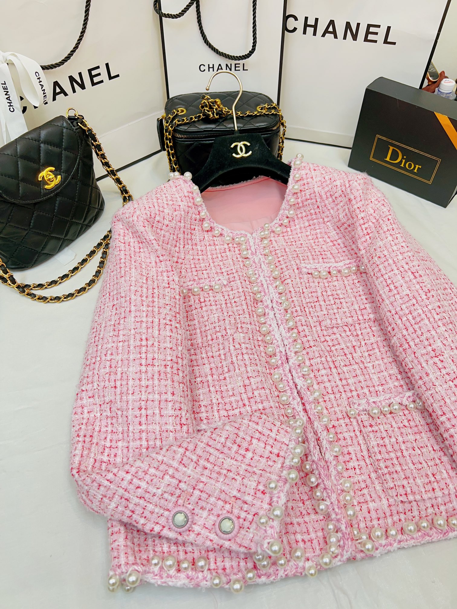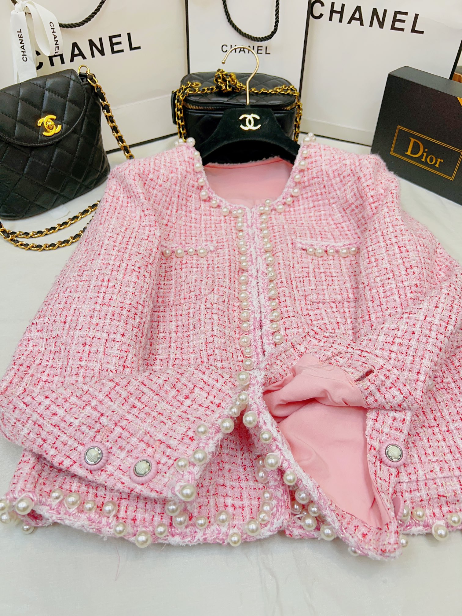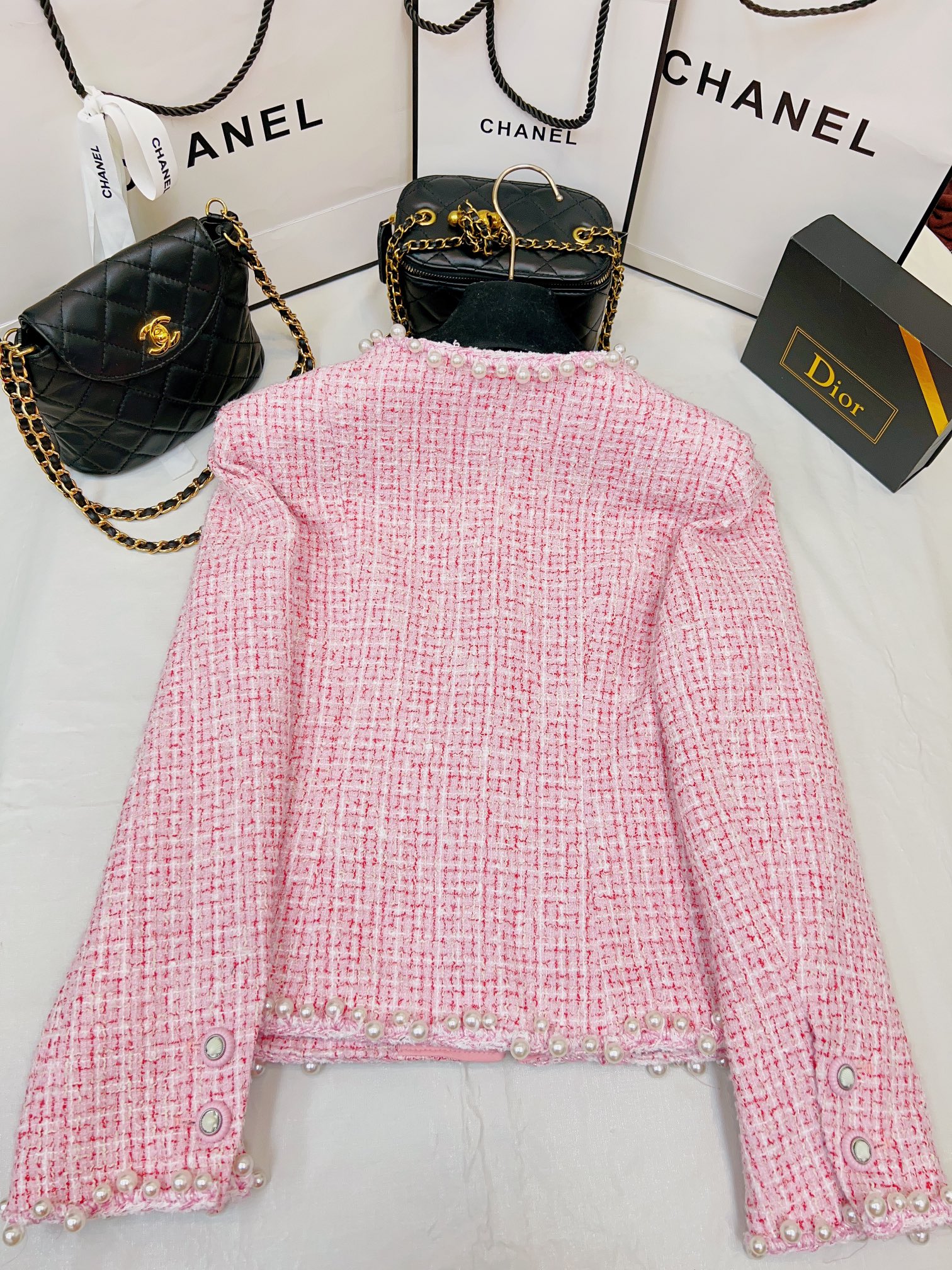 这款衣服是AAAAA 1:1 质量 (非常棒). 使用了和原版一模一样的材料. 商标部分也保持了和香奈儿/Chanel一样. 图片拍摄是实物衣服拍摄, 您所收到的实物保证和我们图片一模一样.