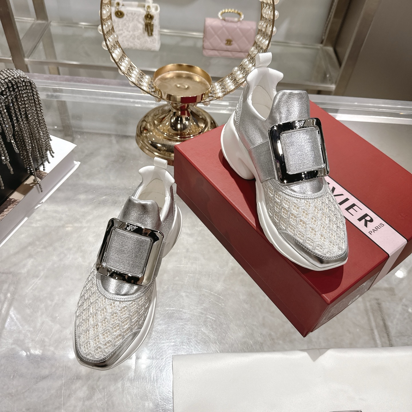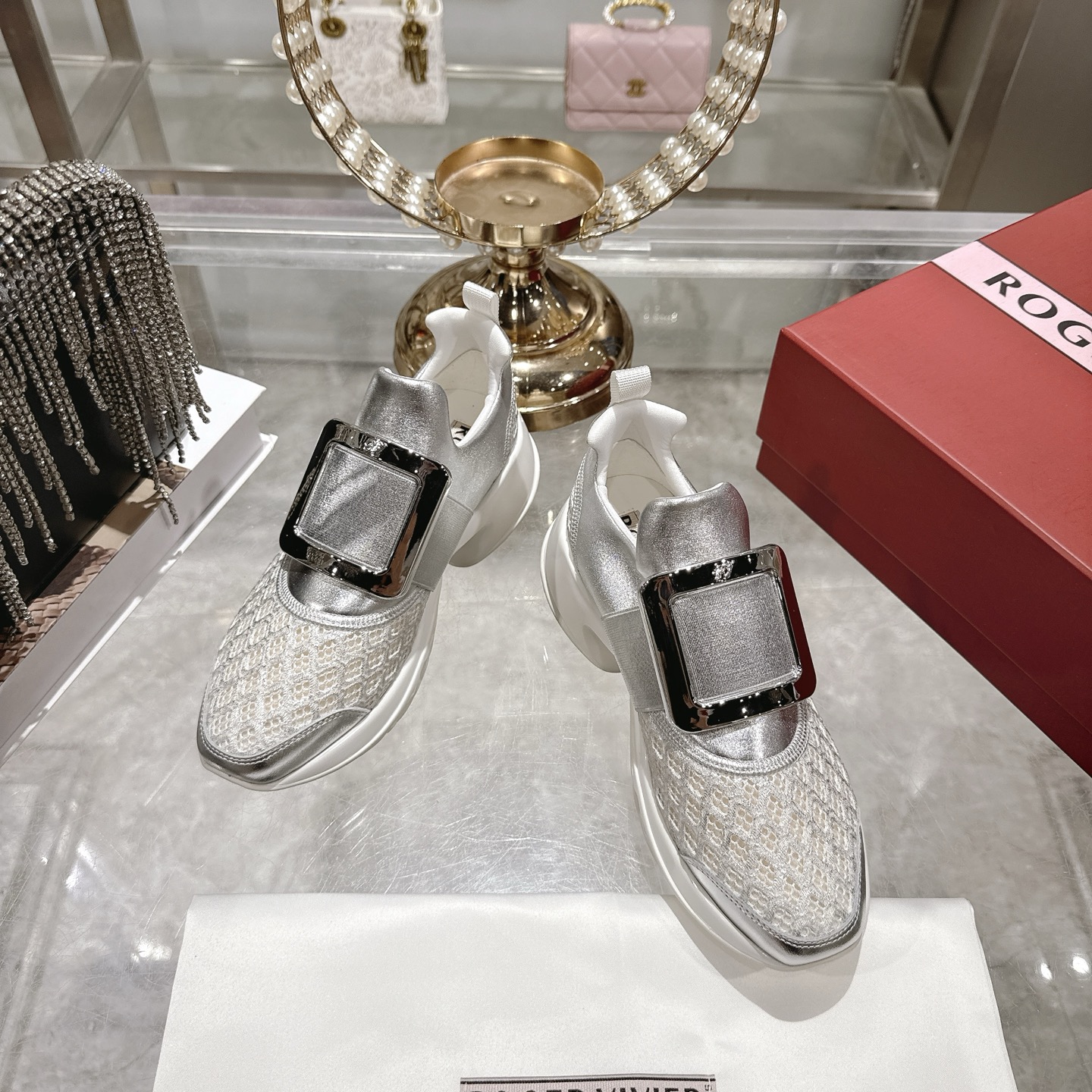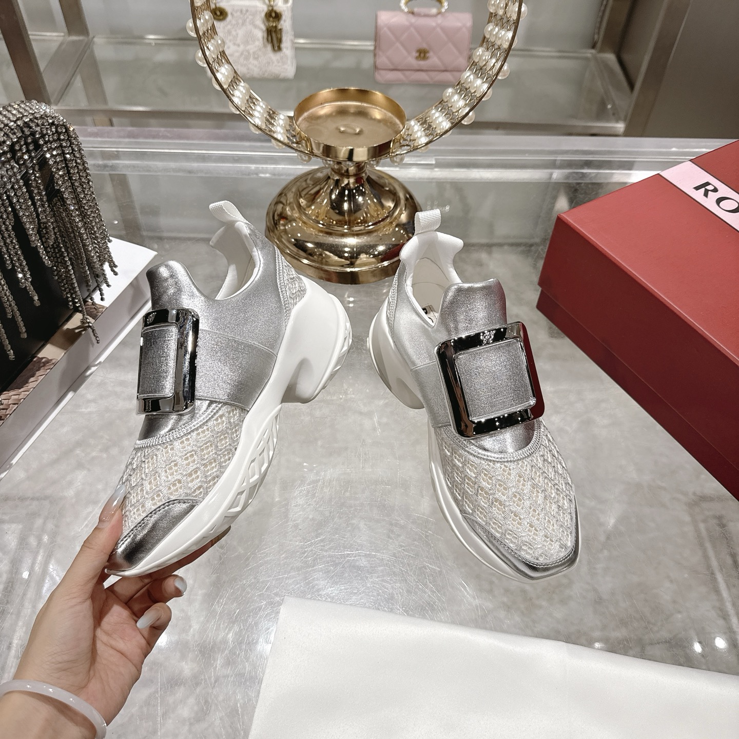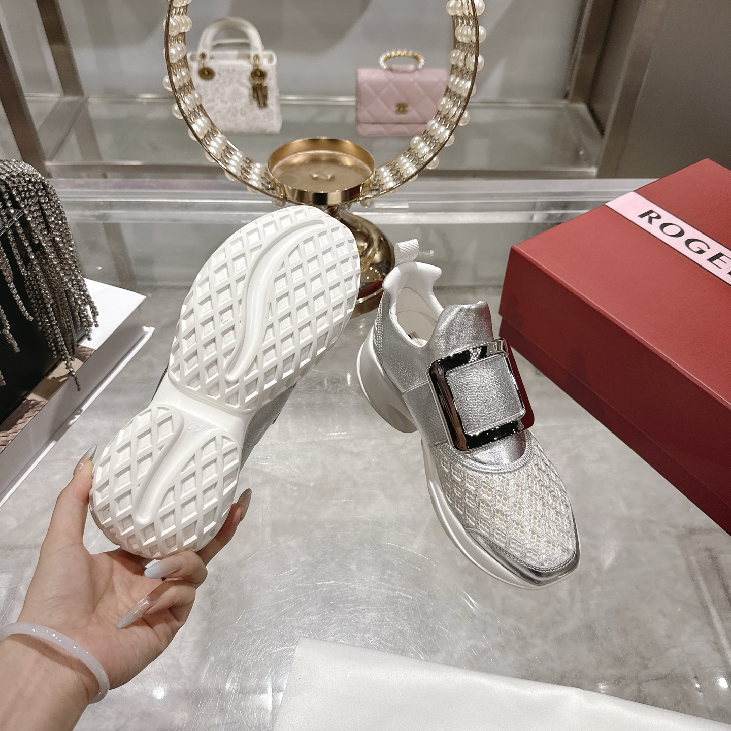 这款鞋子是AAAAA 1:1 质量 (非常棒). 使用了和原版一模一样的材料. 商标部分也保持了和罗杰维维耶/Roger Vivier一样. 图片拍摄是实物鞋子拍摄, 您所收到的实物保证和我们图片一模一样.