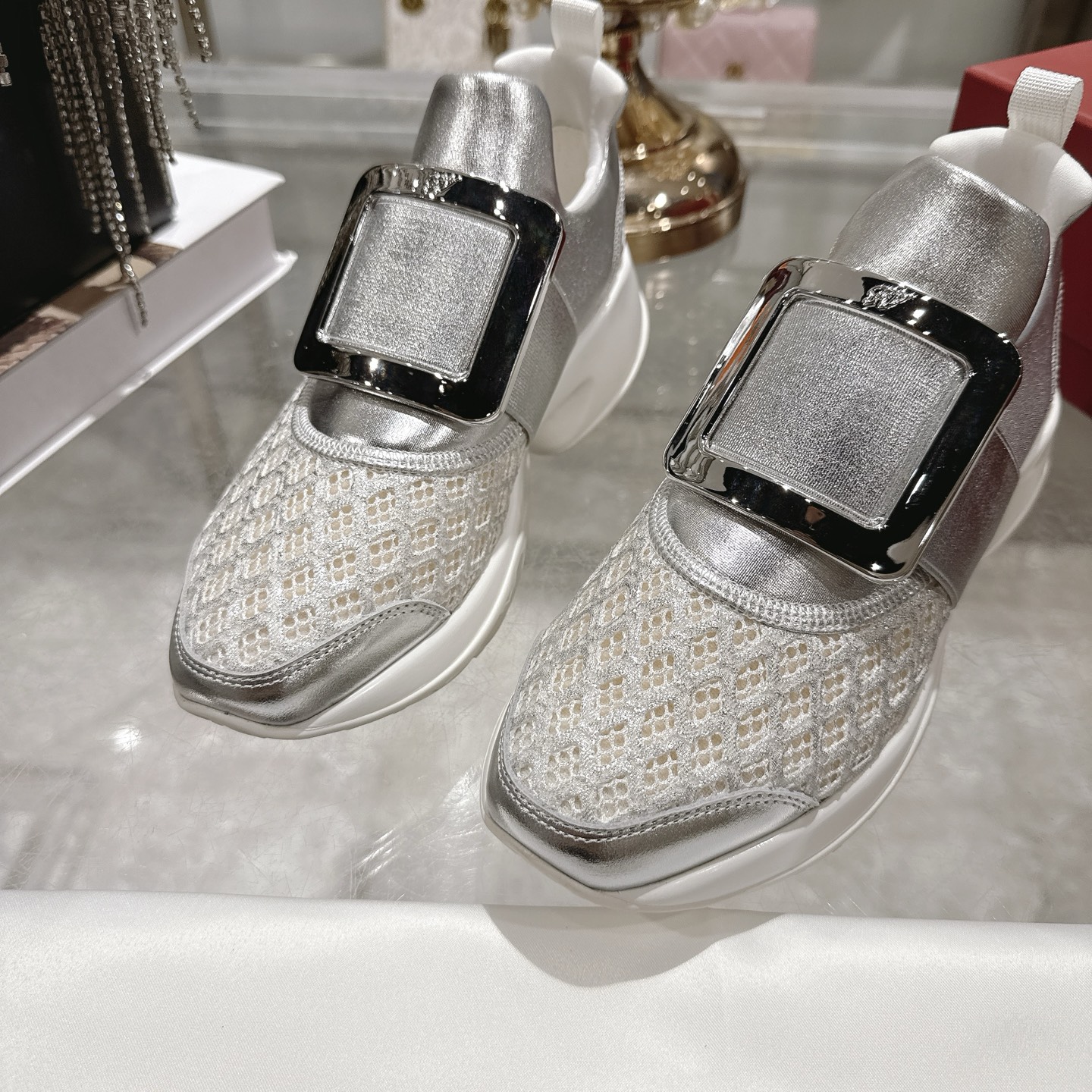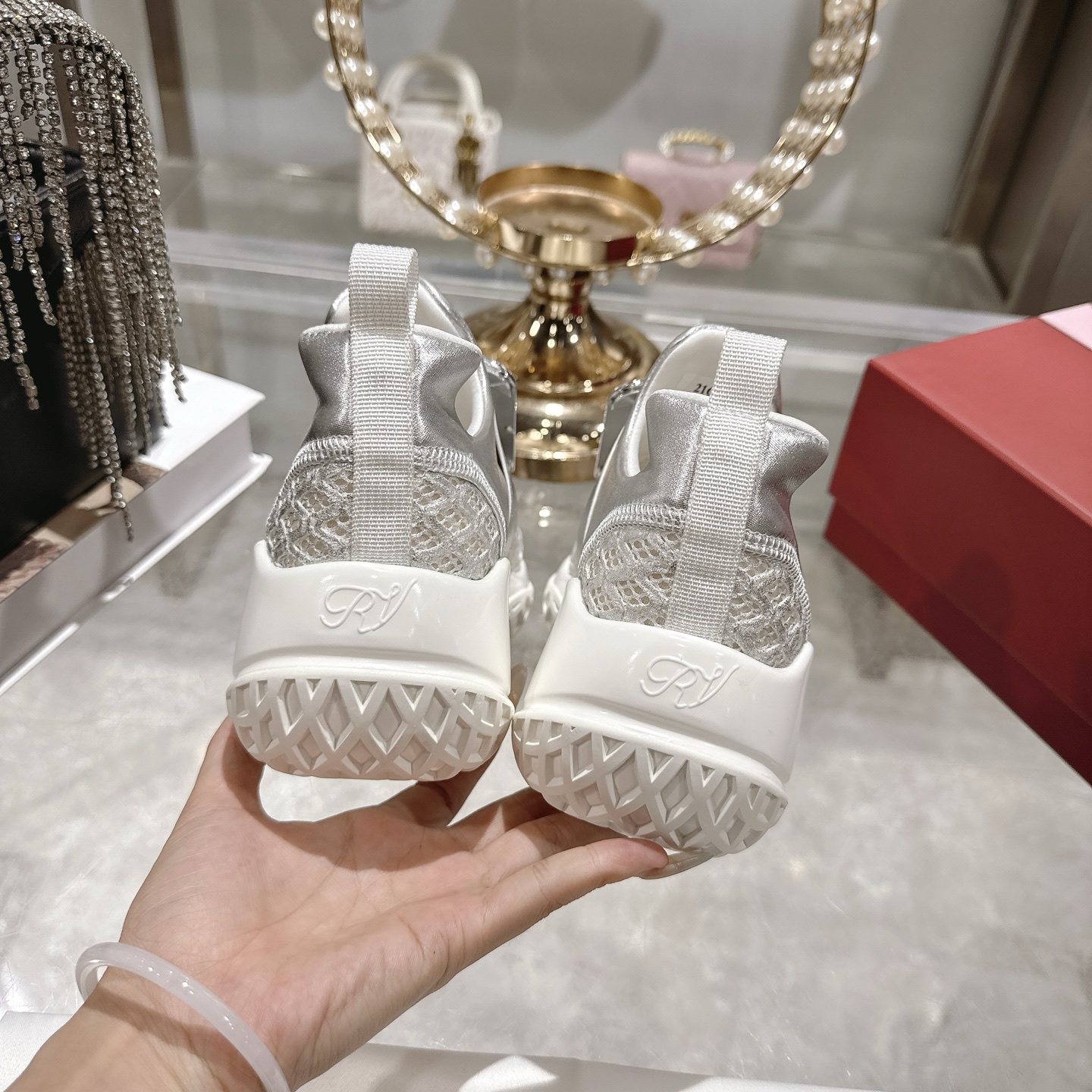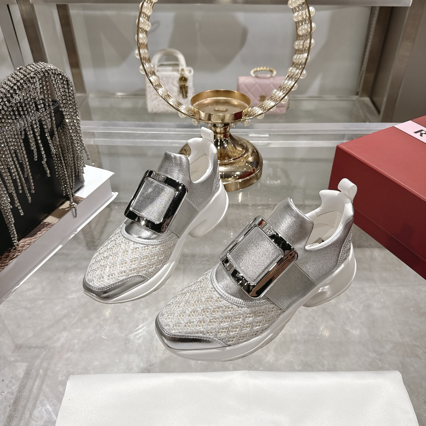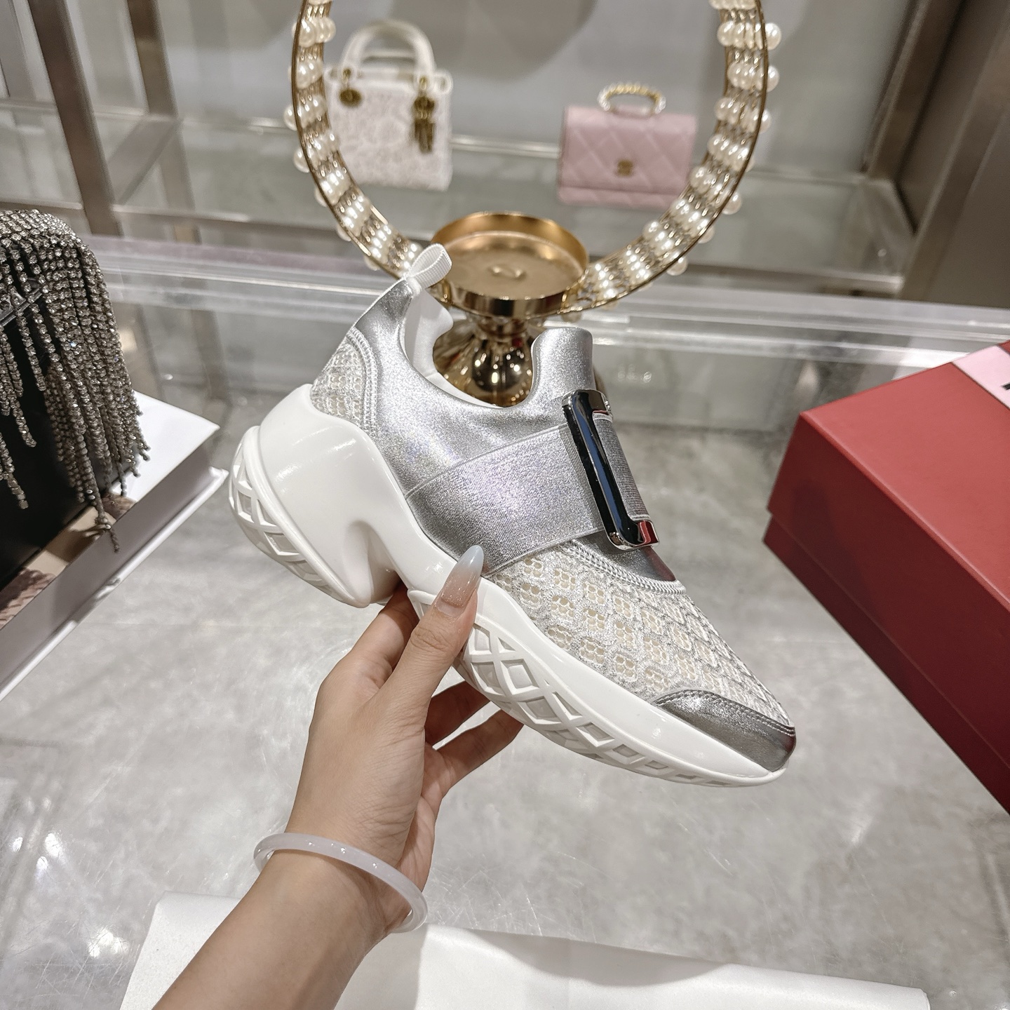 这款鞋子是AAAAA 1:1 质量 (非常棒). 使用了和原版一模一样的材料. 商标部分也保持了和罗杰维维耶/Roger Vivier一样. 图片拍摄是实物鞋子拍摄, 您所收到的实物保证和我们图片一模一样.