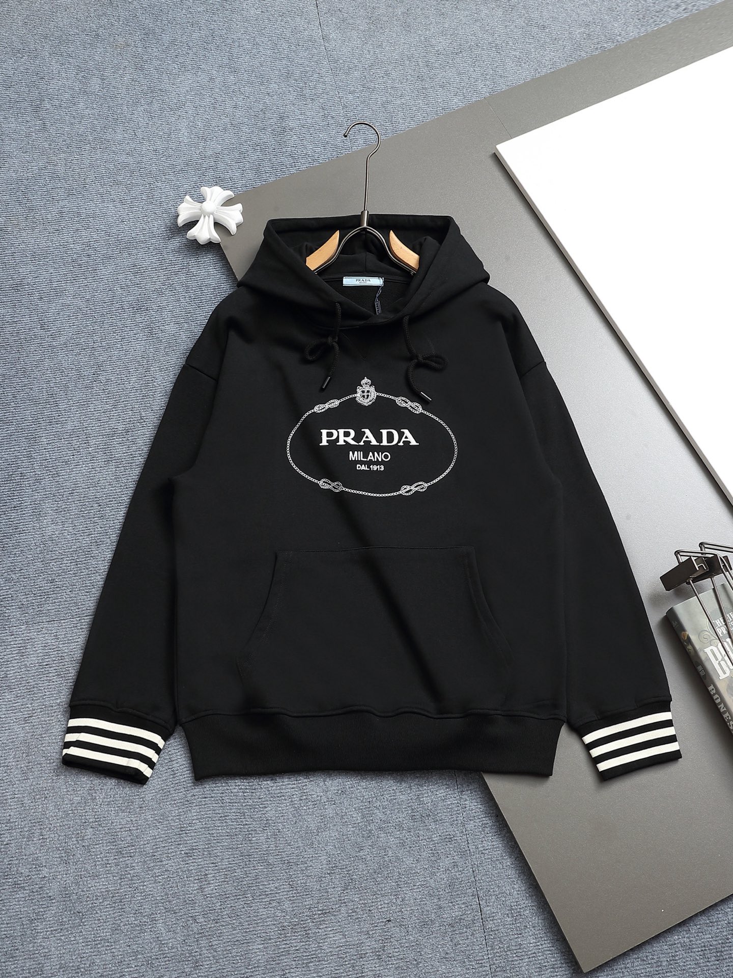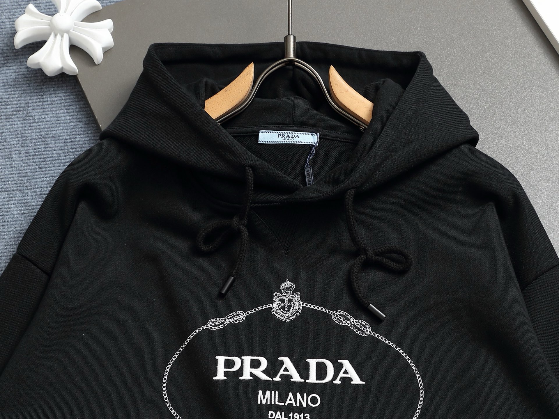 这款衣服是AAAAA 1:1 质量 (非常棒). 使用了和原版一模一样的材料. 商标部分也保持了和普拉达/Prada一样. 图片拍摄是实物衣服拍摄, 您所收到的实物保证和我们图片一模一样.
