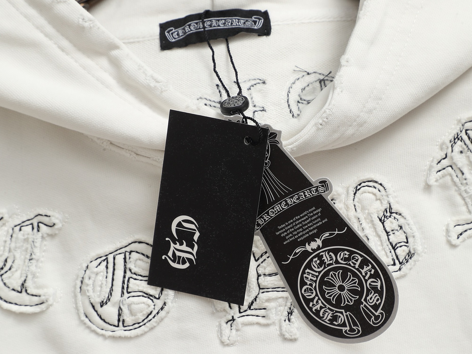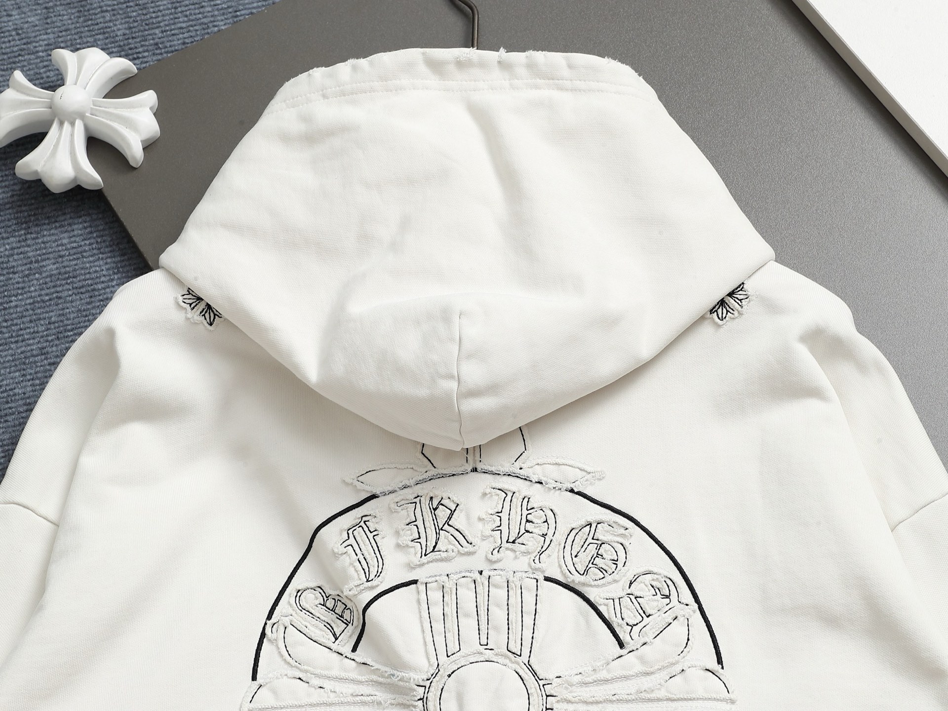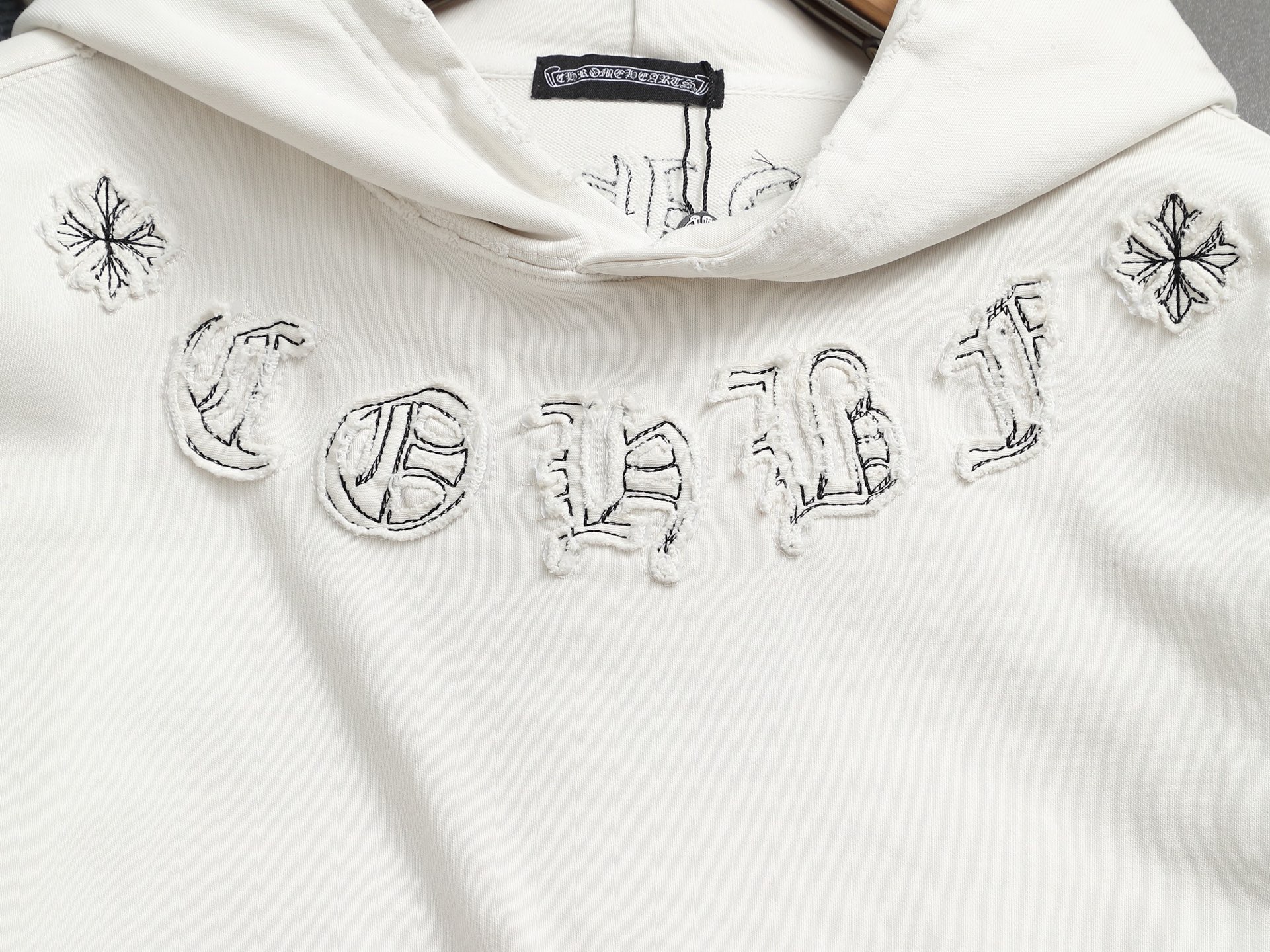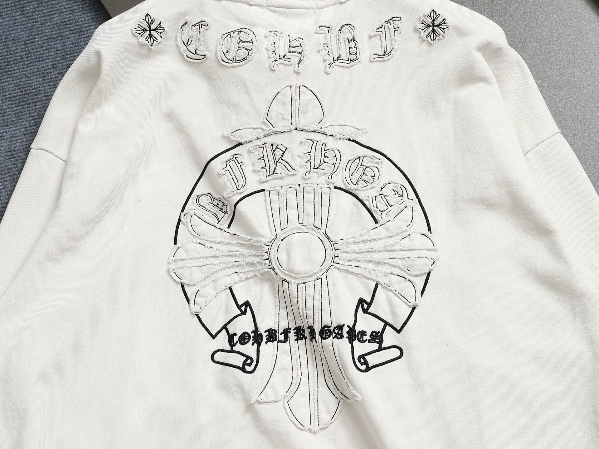 这款衣服是AAAAA 1:1 质量 (非常棒). 使用了和原版一模一样的材料. 商标部分也保持了和克罗心/Chrome Hearts一样. 图片拍摄是实物衣服拍摄, 您所收到的实物保证和我们图片一模一样.
