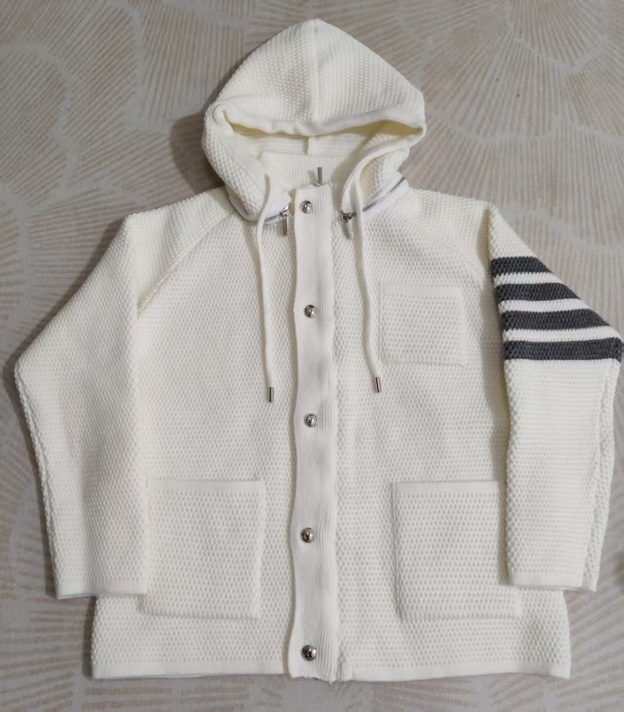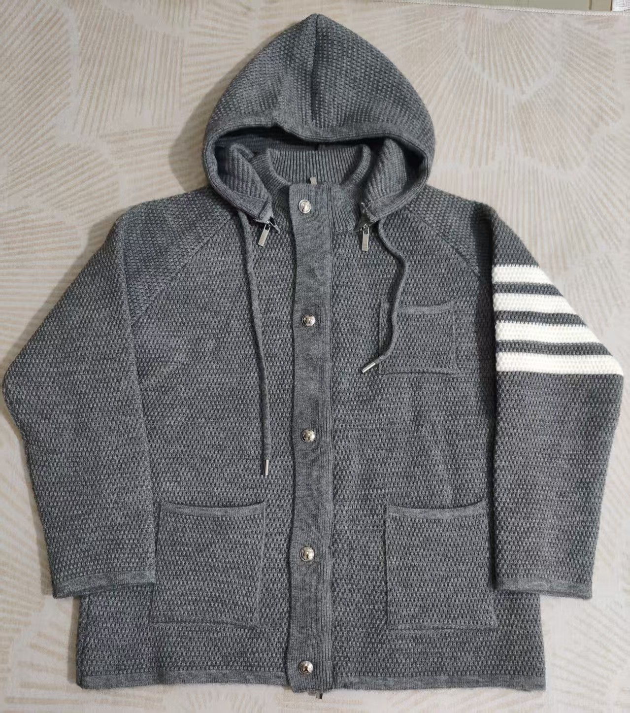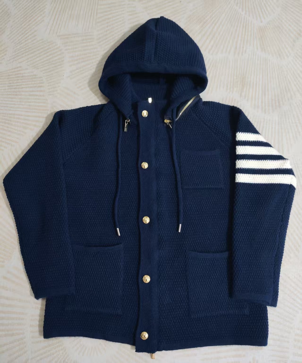 这款衣服是AAAAA 1:1 质量 (非常棒). 使用了和原版一模一样的材料. 商标部分也保持了和汤姆布朗/Thom Browne一样. 图片拍摄是实物衣服拍摄, 您所收到的实物保证和我们图片一模一样.