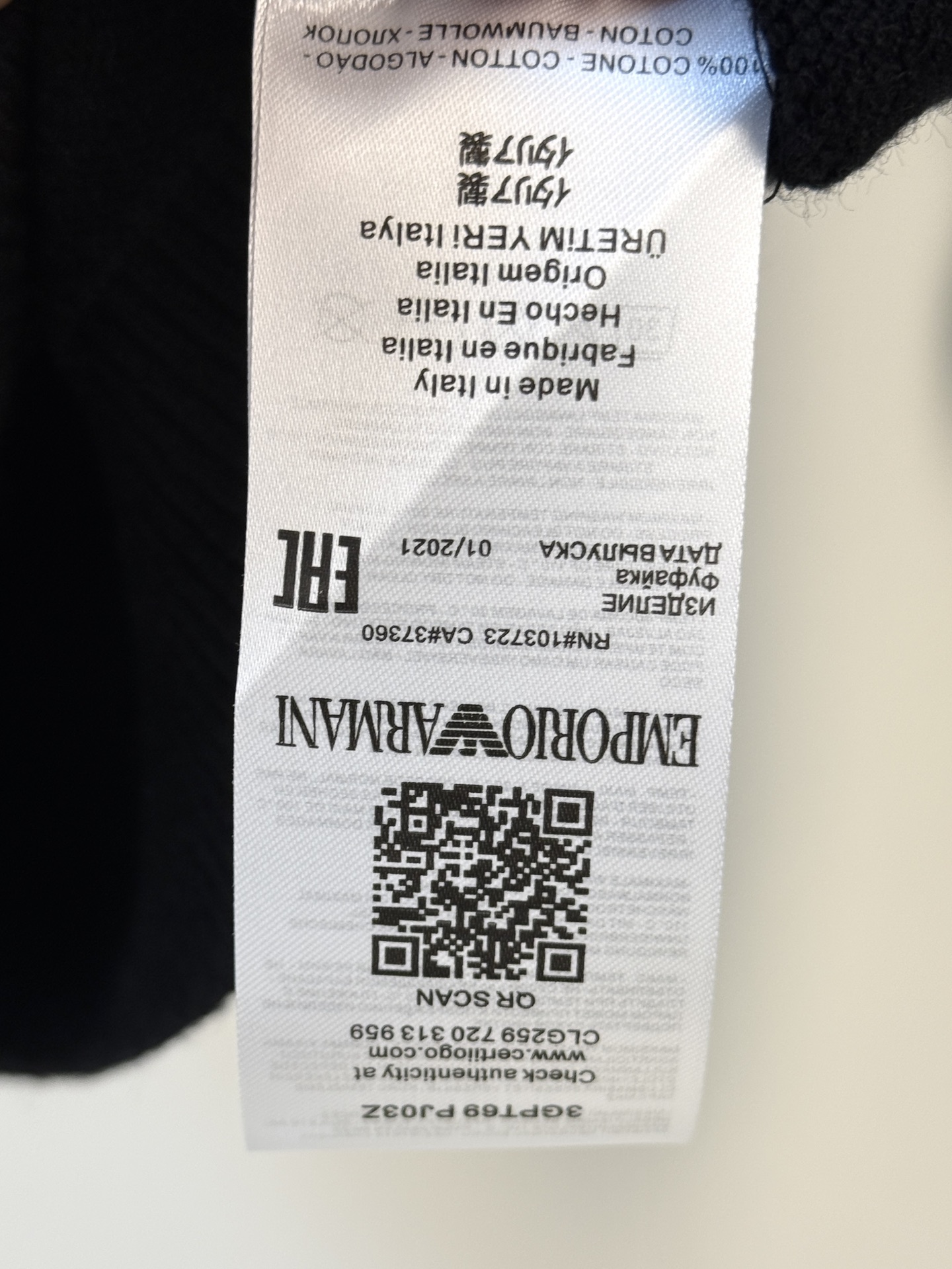 这款衣服是AAAAA 1:1 质量 (非常棒). 使用了和原版一模一样的材料. 商标部分也保持了和阿玛尼/Armani一样. 图片拍摄是实物衣服拍摄, 您所收到的实物保证和我们图片一模一样.