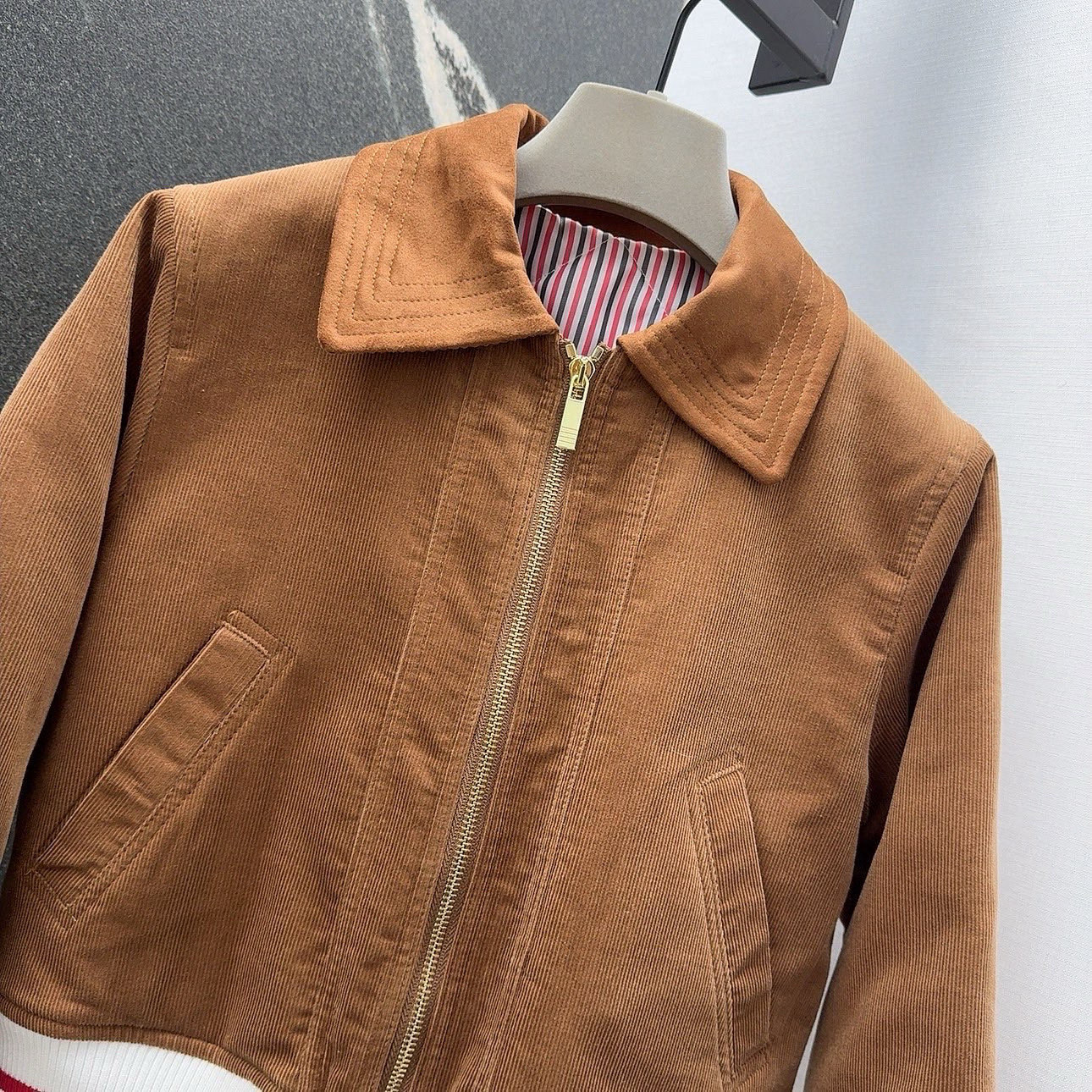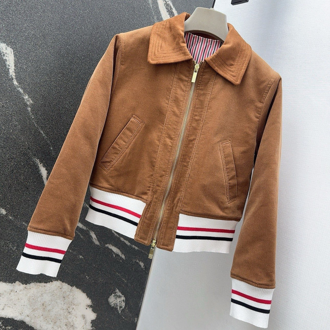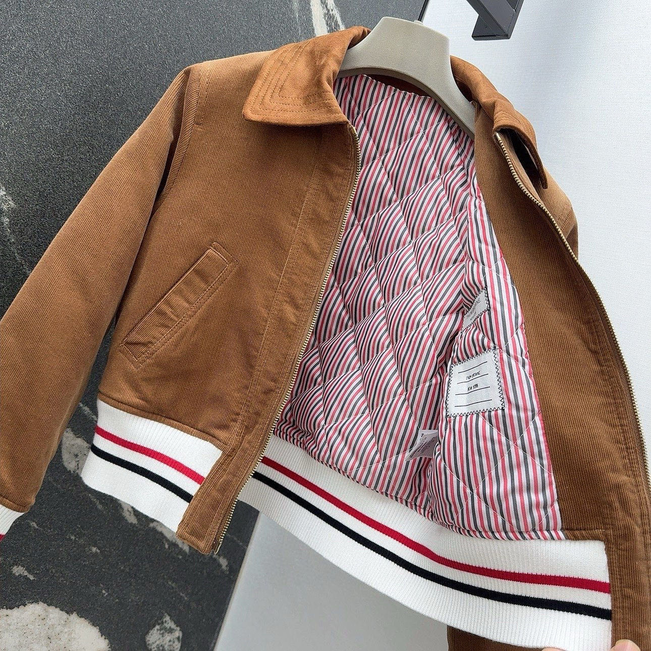这款衣服是AAAAA 1:1 质量 (非常棒). 使用了和原版一模一样的材料. 商标部分也保持了和汤姆布朗/Thom Browne一样. 图片拍摄是实物衣服拍摄, 您所收到的实物保证和我们图片一模一样.