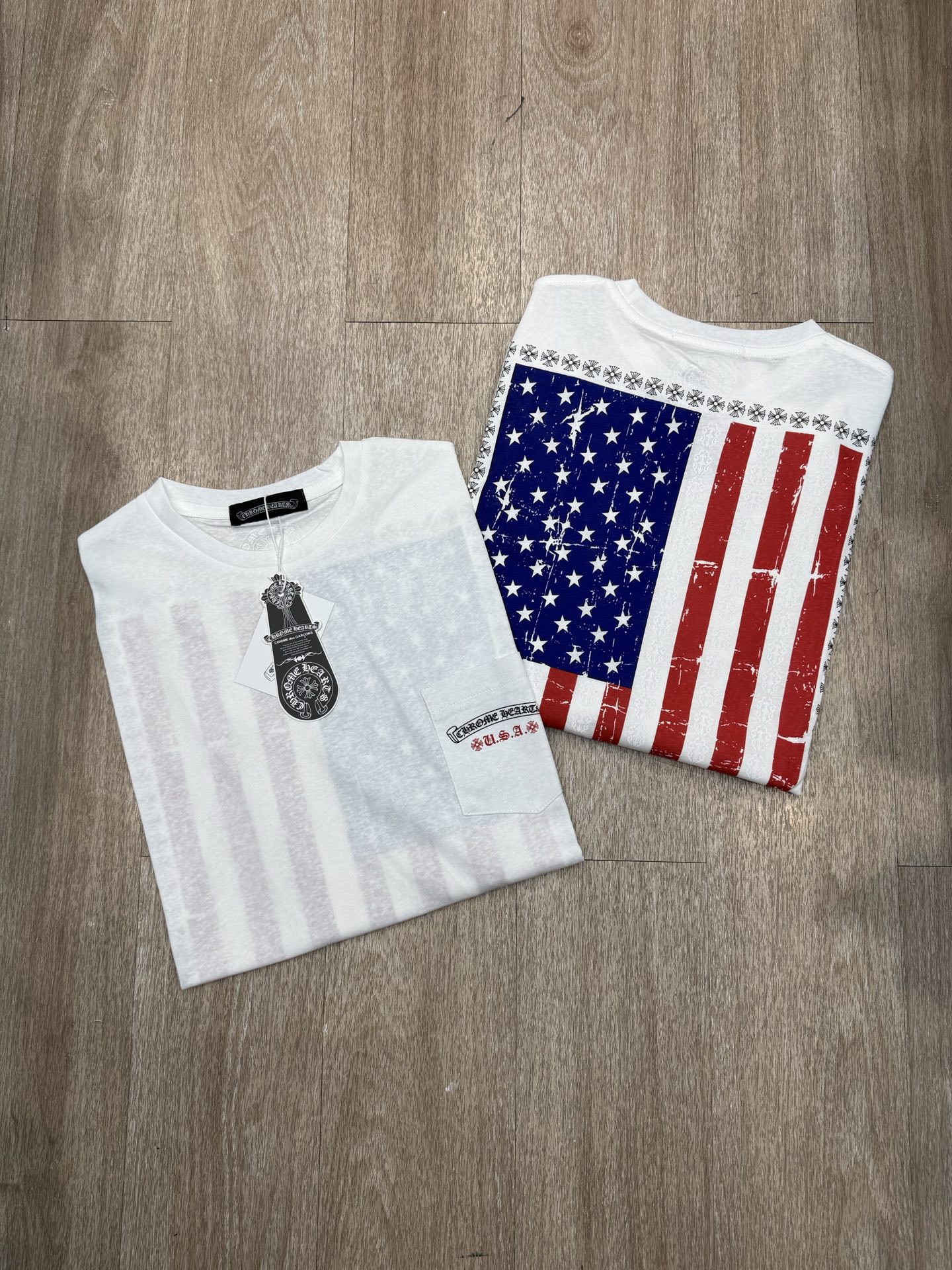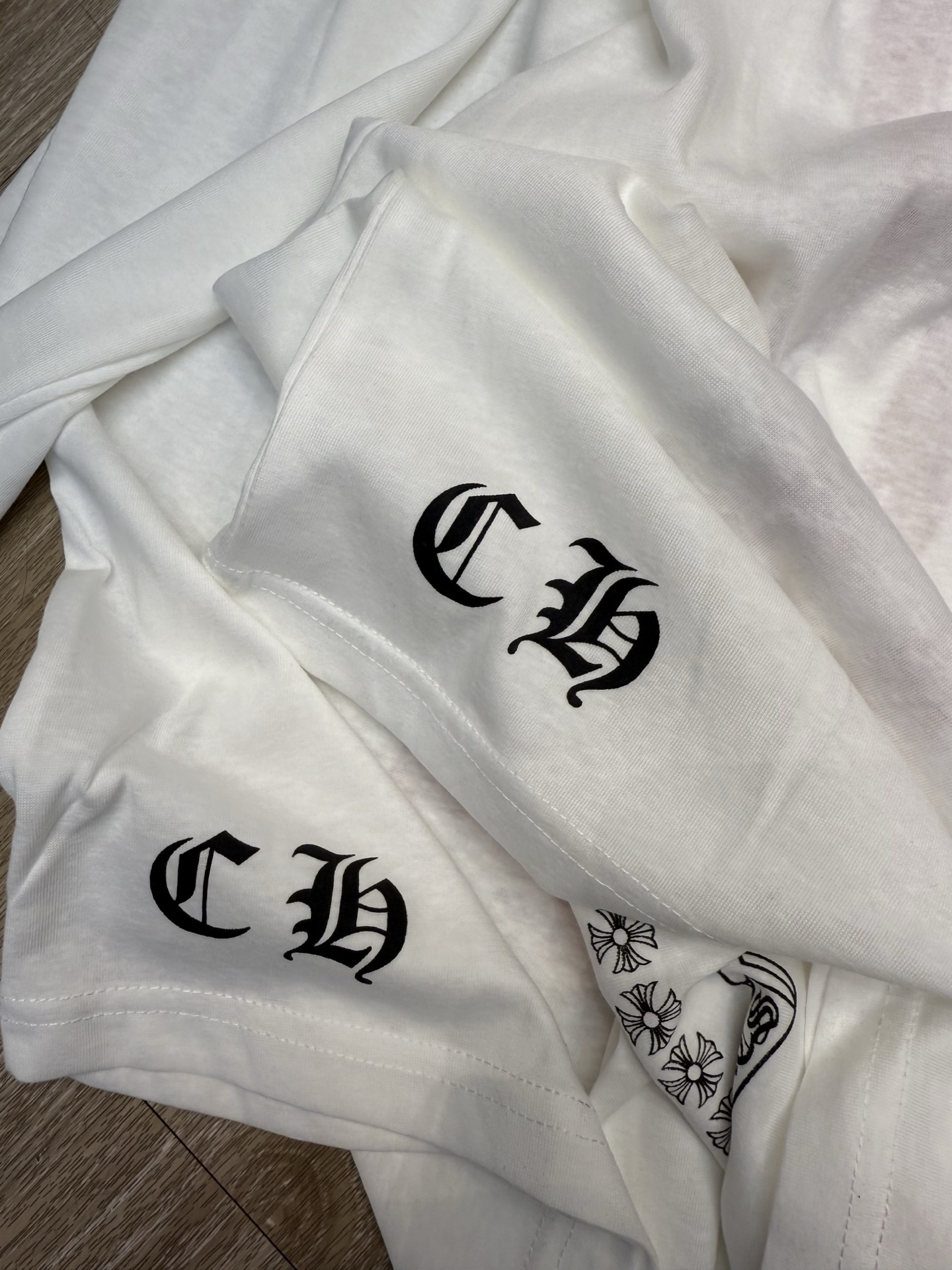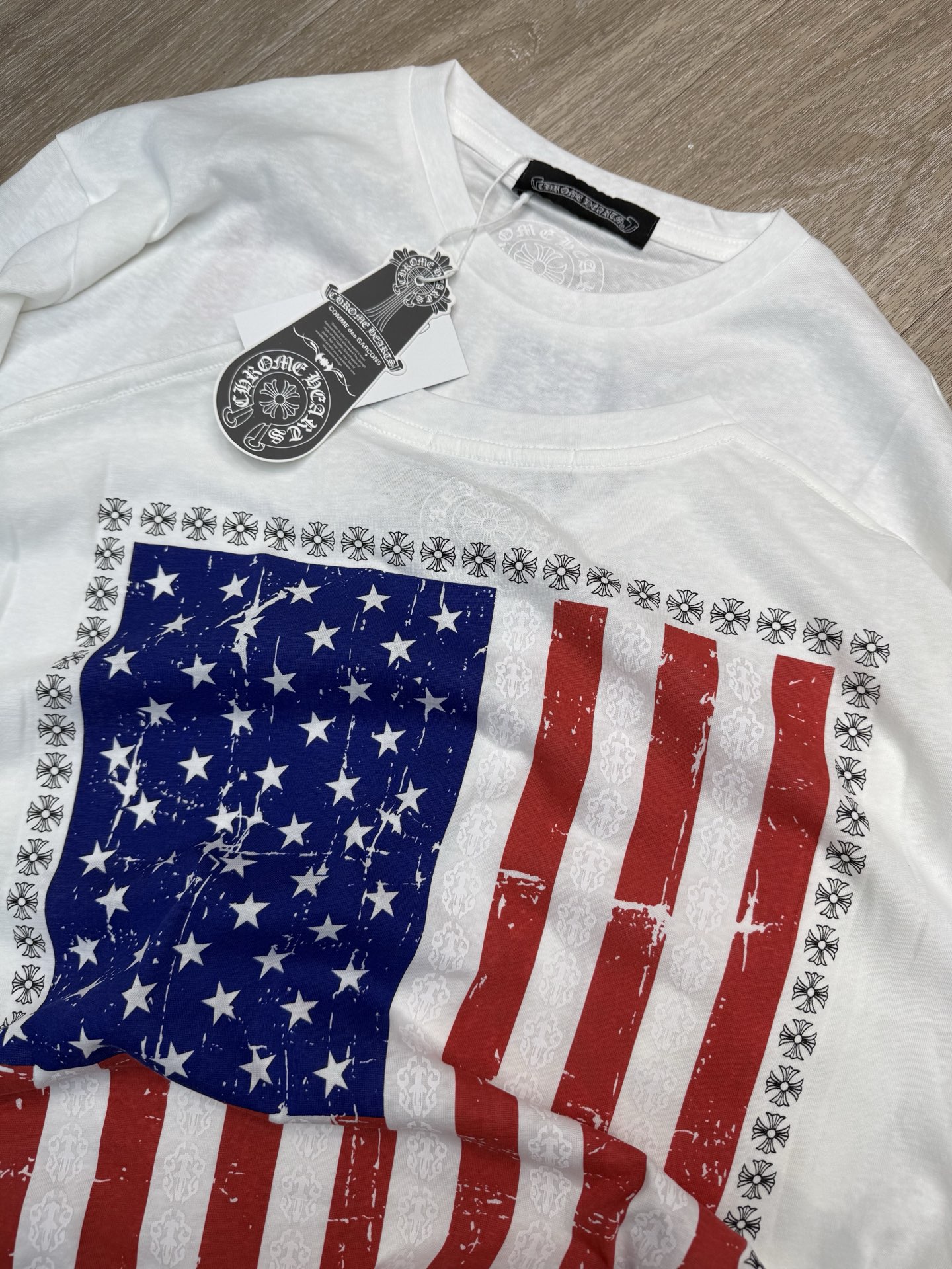 这款衣服是AAAAA 1:1 质量 (非常棒). 使用了和原版一模一样的材料. 商标部分也保持了和克罗心/Chrome Hearts一样. 图片拍摄是实物衣服拍摄, 您所收到的实物保证和我们图片一模一样.