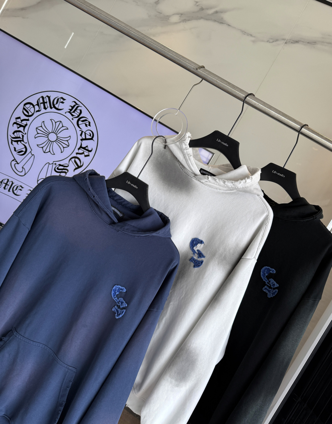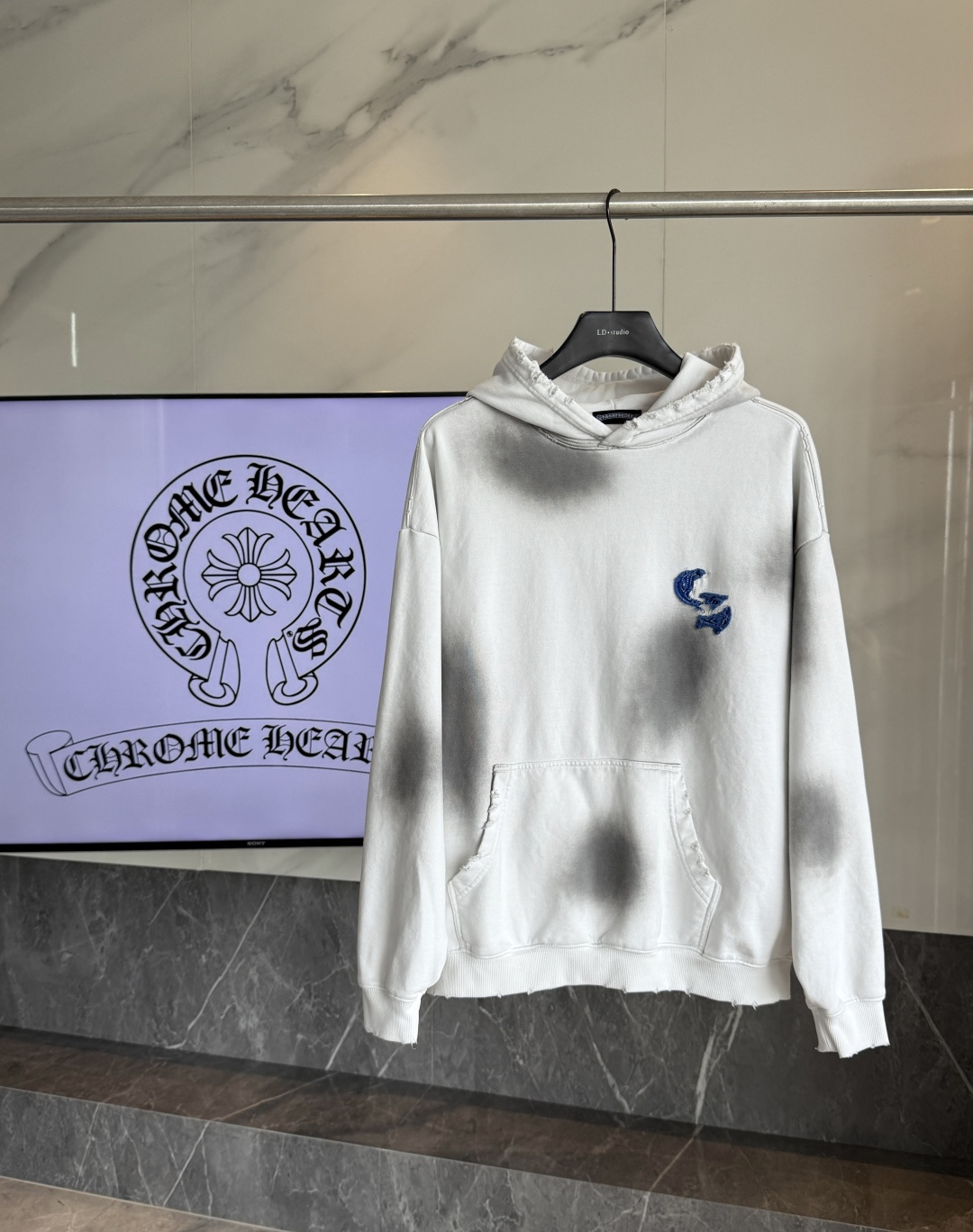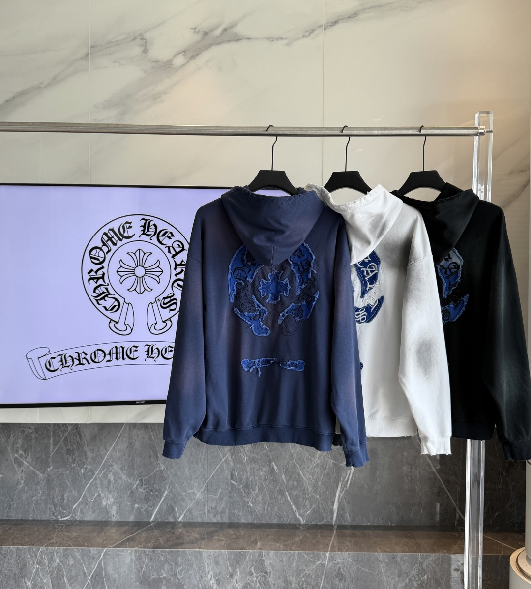 这款衣服是AAAAA 1:1 质量 (非常棒). 使用了和原版一模一样的材料. 商标部分也保持了和克罗心/Chrome Hearts一样. 图片拍摄是实物衣服拍摄, 您所收到的实物保证和我们图片一模一样.