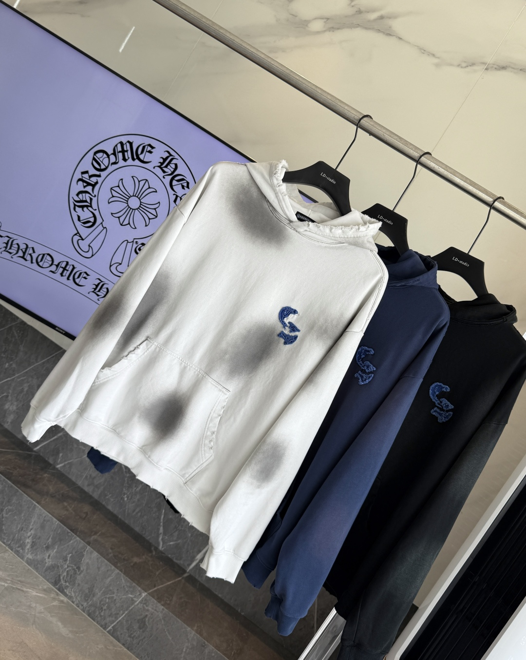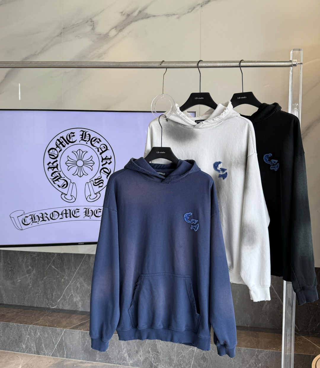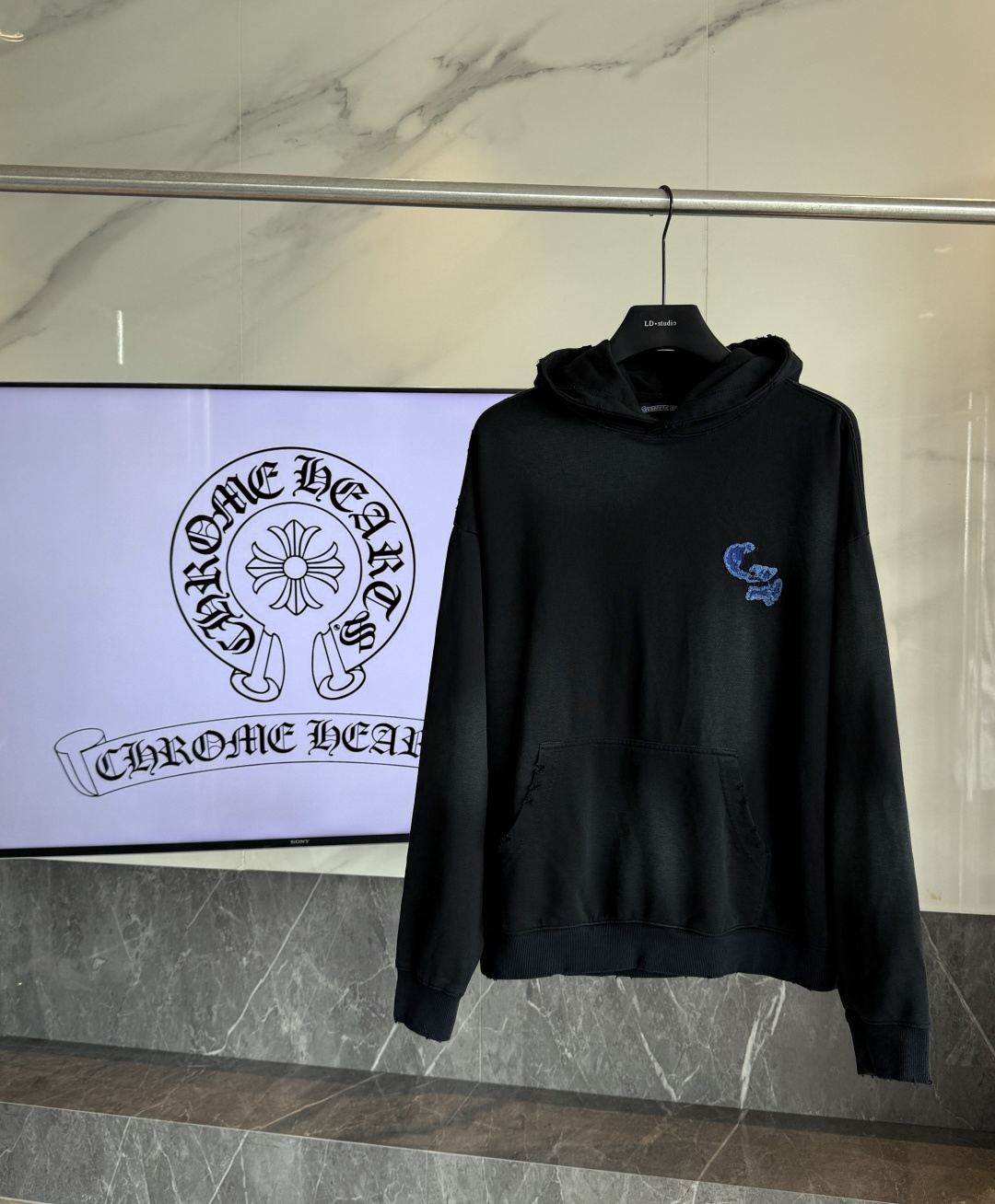 这款衣服是AAAAA 1:1 质量 (非常棒). 使用了和原版一模一样的材料. 商标部分也保持了和克罗心/Chrome Hearts一样. 图片拍摄是实物衣服拍摄, 您所收到的实物保证和我们图片一模一样.